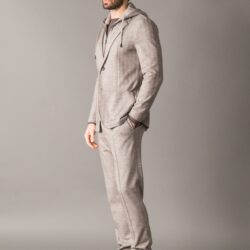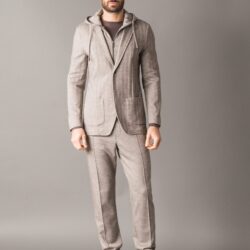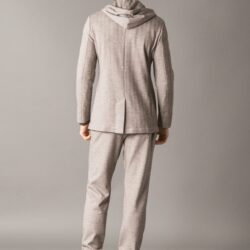 Blazer con cappuccio dallo stile smart e chic, realizzato in un pregiato e caldo tessuto Woolcot con motivo Chevron. Il capo presenta un inserto interno con cappuccio, zip con doppio cursore logato e coulisse regolabile con stopper logati. È dotato di due tasche laterali, una tasca sul petto e chiusura frontale con bottoni logati. La fodera interna in cupro assicura traspirabilità e comfort, mentre le cuciture rifinite a mano esaltano la qualità sartoriale del capo, perfetto per un’eleganza rilassata ma curata.