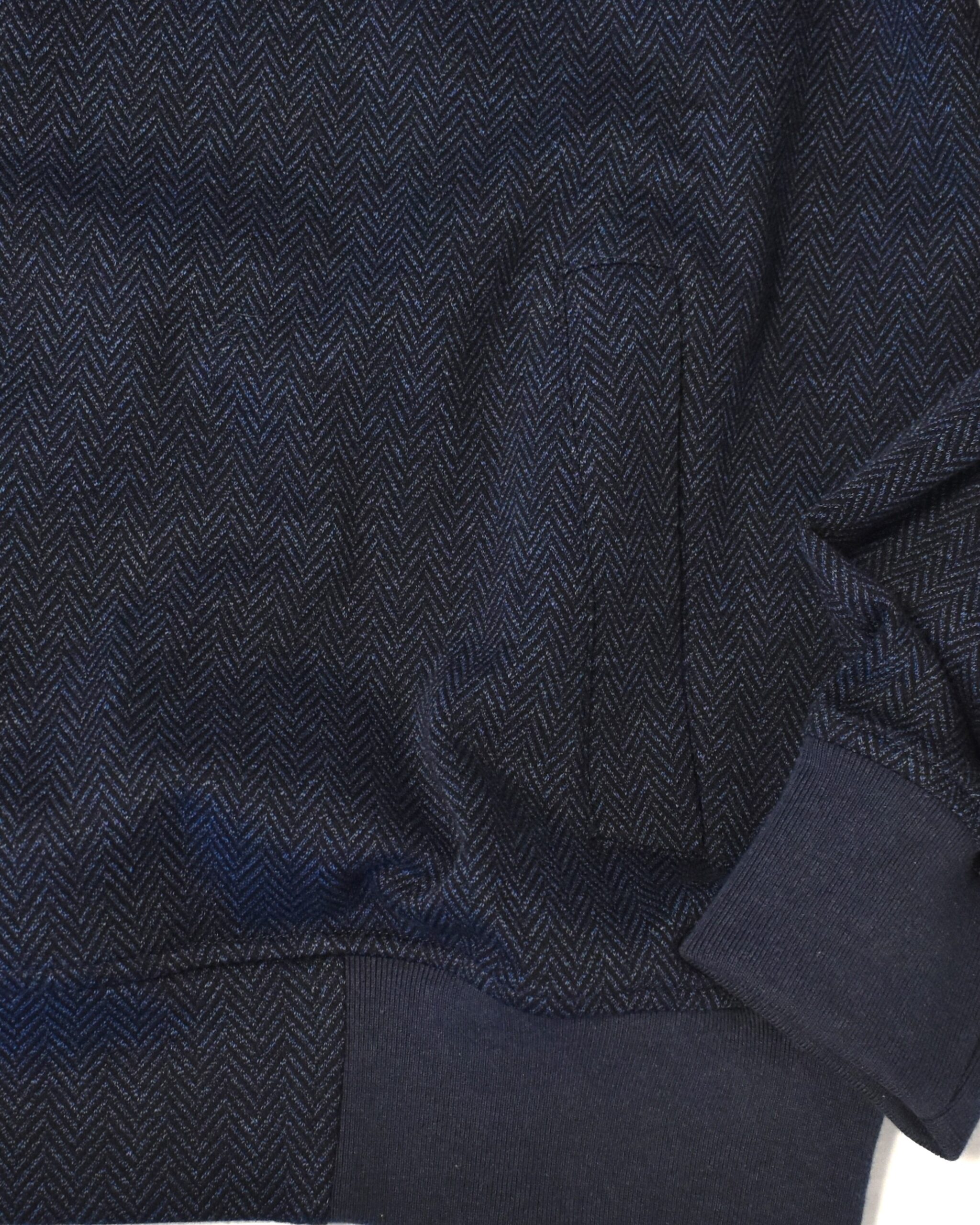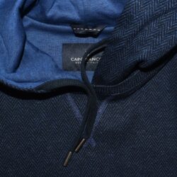 Hoody in Light-fleece di puro cotone a fibra lunga, valorizzato da una tintura in filo doppio colore con disegno chevron per un effetto raffinato. Le cuciture a vista sul girocollo e sulle maniche aggiungono un tocco dinamico, mentre l’inserto triangolare al collo richiama un design sportivo. Pratiche tasche sui fianchi, cappuccio regolabile con coulisse e clips logate, oltre a bordature al fondo e ai polsi in maglia di cotone a coste fini, completano questo capo perfetto per un look casual ma curato.
