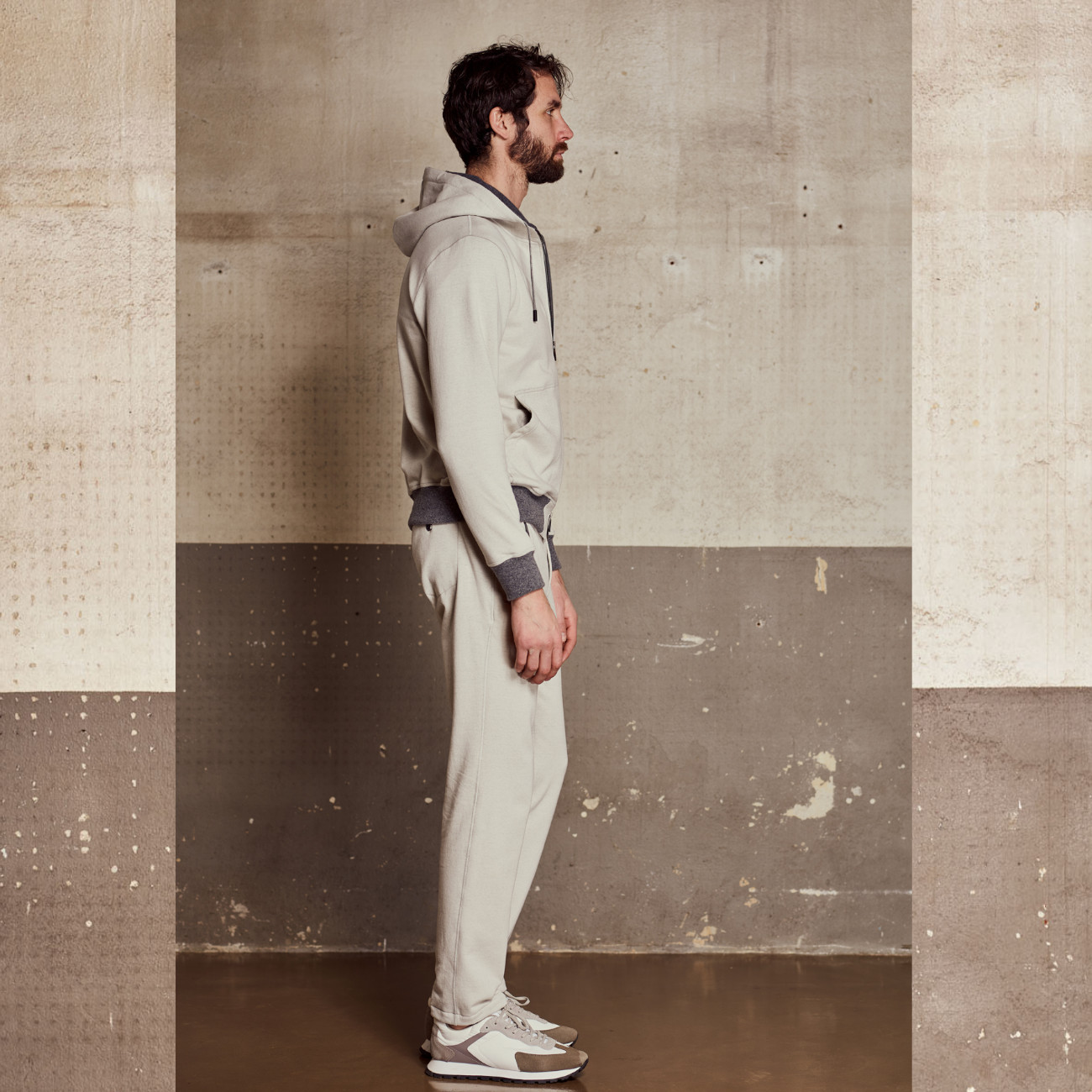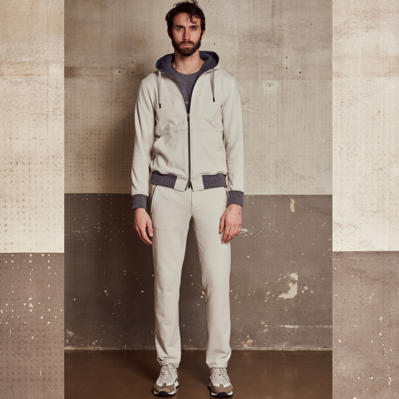Completo dallo stile luxury-leisure, realizzato in un pregiato e morbidissimo fleece melange Cashcot-modal, caldo, avvolgente e naturalmente traspirante. La felpa full-zip presenta costine in maglia su polsini e fondo vita, colletto in tessuto con profilo a contrasto, zip frontale con doppio cursore logato, due tasche laterali, una tasca interna sul petto e una placchetta logo in metallo sul retro del colletto. I pantaloni coordinati sono rifiniti con cucitura centrale sulle gambe, due tasche laterali, una tasca posteriore con bottone logato e vita elasticizzata con coulisse regolabile e doppio stopper in metallo logato. Un look sofisticato e confortevole, perfetto per il tempo libero con stile.