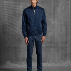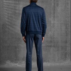 Completo composto da Zipper e pantaloni, realizzato in morbido jersey di puro cotone Supima di alta qualità. La maglia, con zip intera a doppio cursore logata, è realizzata in un tessuto pregiato tinto in filo con motivo a quadretti. Dettagli come la bordatura in maglia di cotone a costine sottili arricchiscono il design, valorizzando il collo, i polsini e il fondo. Completa la struttura due tasche sui fianchi e una fodera interna in jersey leggero di puro cotone, per un comfort ottimale e una vestibilità impeccabile. I pantaloni, confezionati in jersey di cotone Supima a fibra lunga con effetto mélange, garantiscono morbidezza e resistenza. Sono dotati di due tasche sui fianchi con zip logata, una tasca posteriore con bottoni logati, e un elastico in vita con coulisse regolabile e clip logate, per una vestibilità pratica e raffinata.