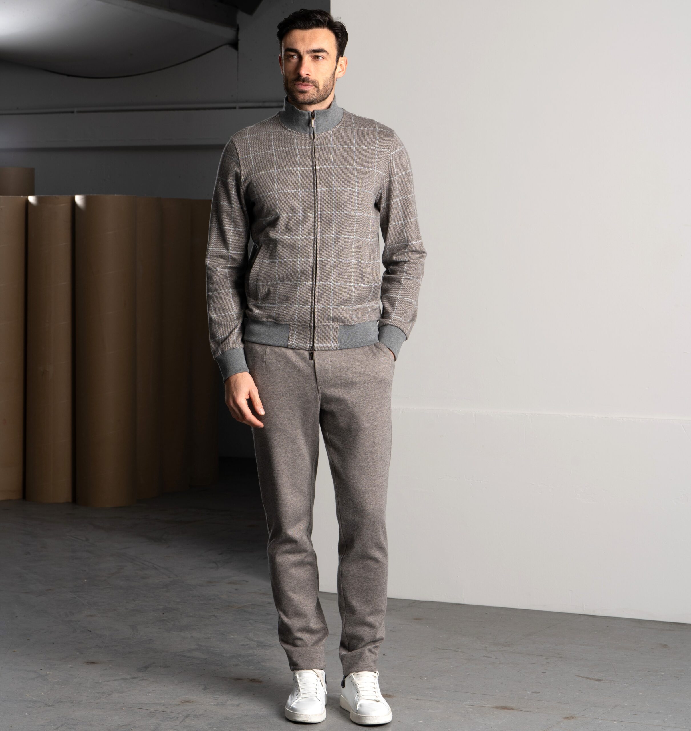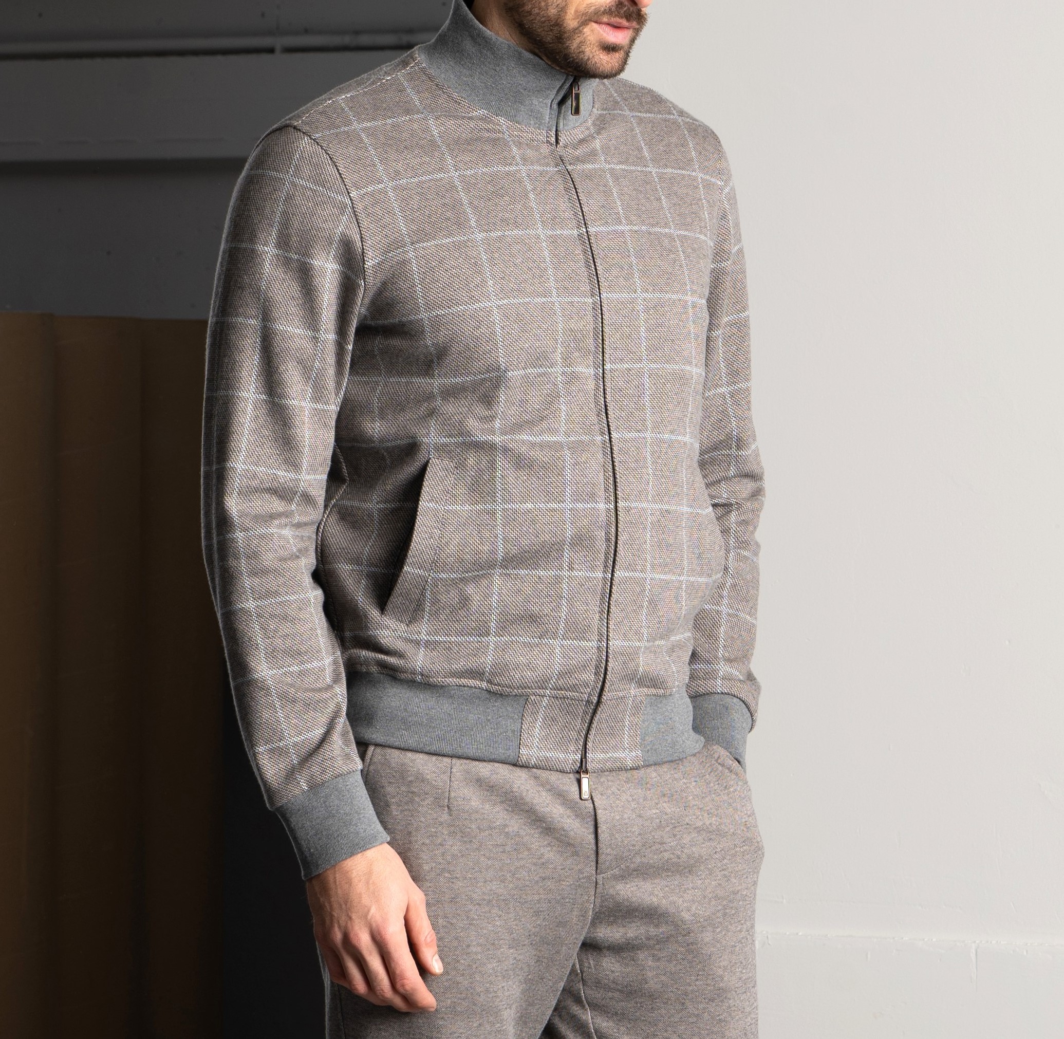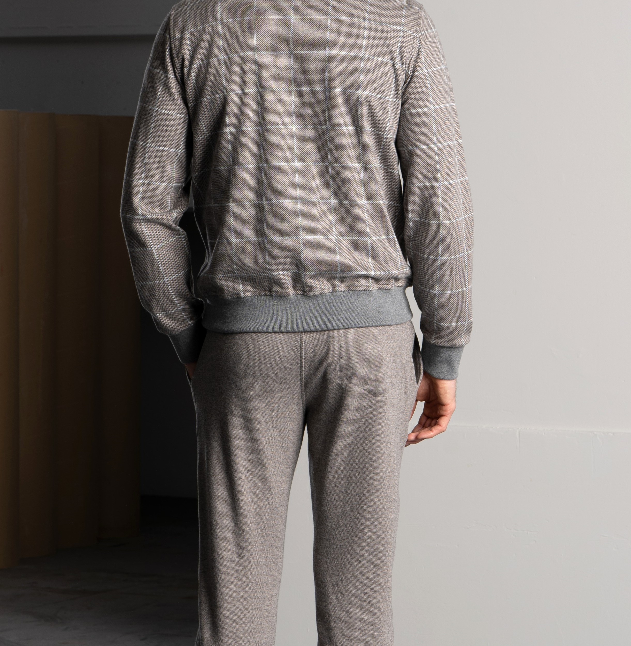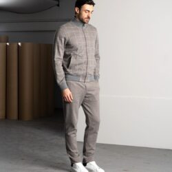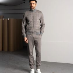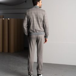 Un completo pensato per le stagioni fredde, realizzato con materiali di alta qualità. La giacca con zip è in morbido cotone invernale a quadri, caldo e traspirante, con dettagli in maglia per polsini e fondo. La fodera interna assicura comfort e assorbimento dell’umidità. Zip con doppi tiretti logati, placchetta metallica sul colletto e tasche ben distribuite completano il capo. I pantaloni, in felpa di cotone mélange tinta unita, offrono una piacevole sensazione sulla pelle. Dotati di tasche laterali e posteriori con bottoni logati, vita elasticizzata e coulisse con stopper personalizzati, garantiscono libertà di movimento e stile. Un set versatile, curato nei dettagli, che esalta la qualità del tessuto e il piacere di indossarlo.
