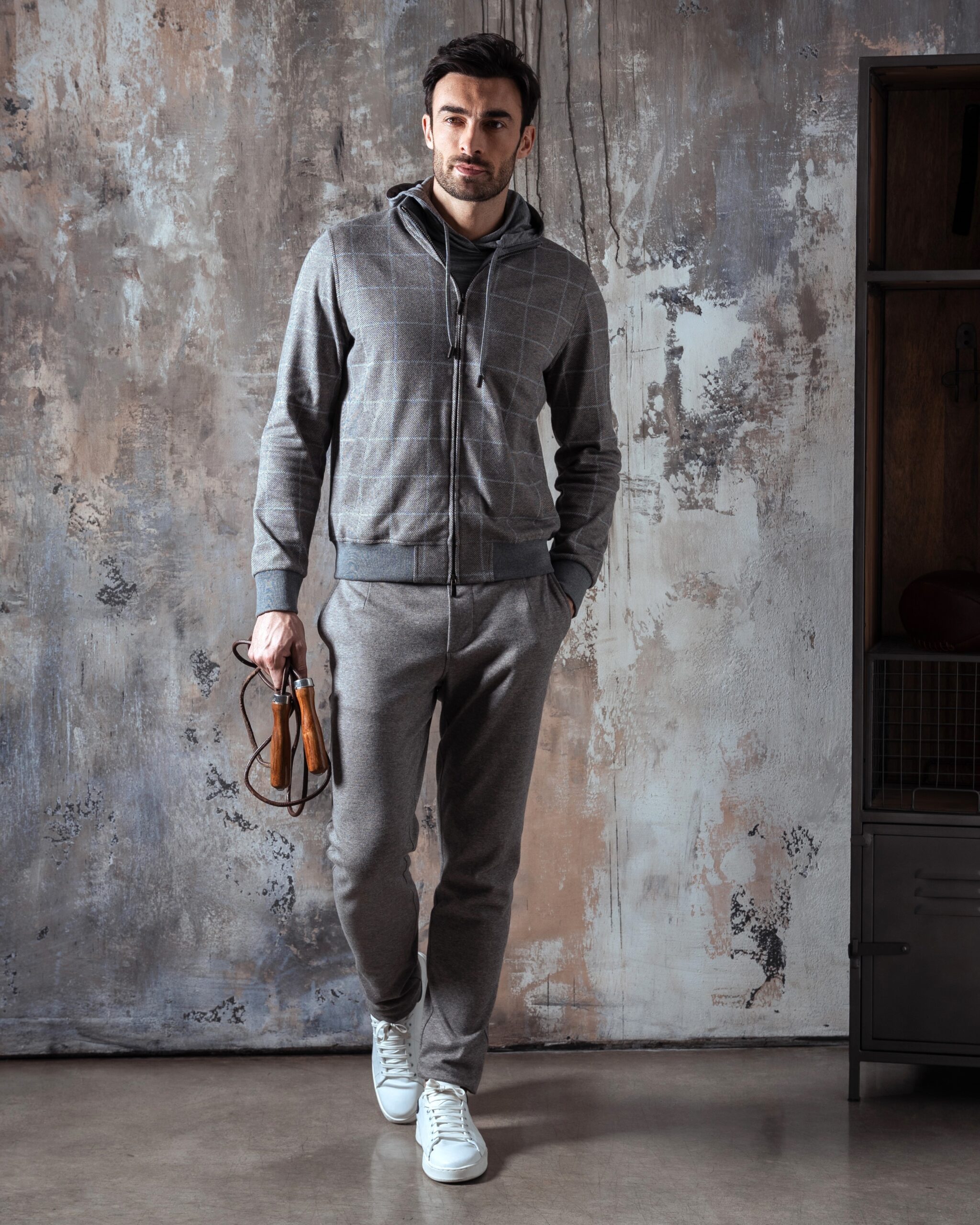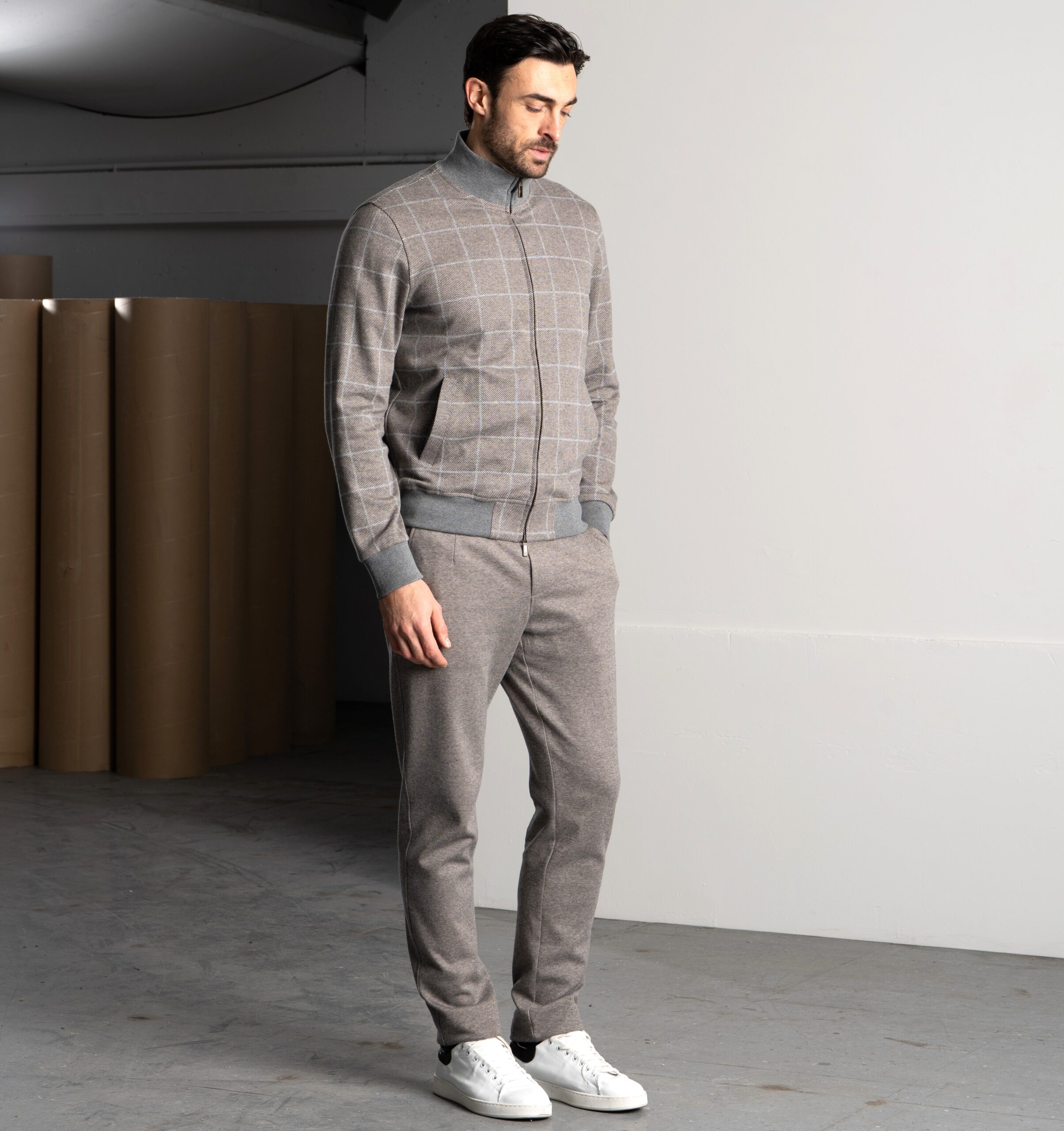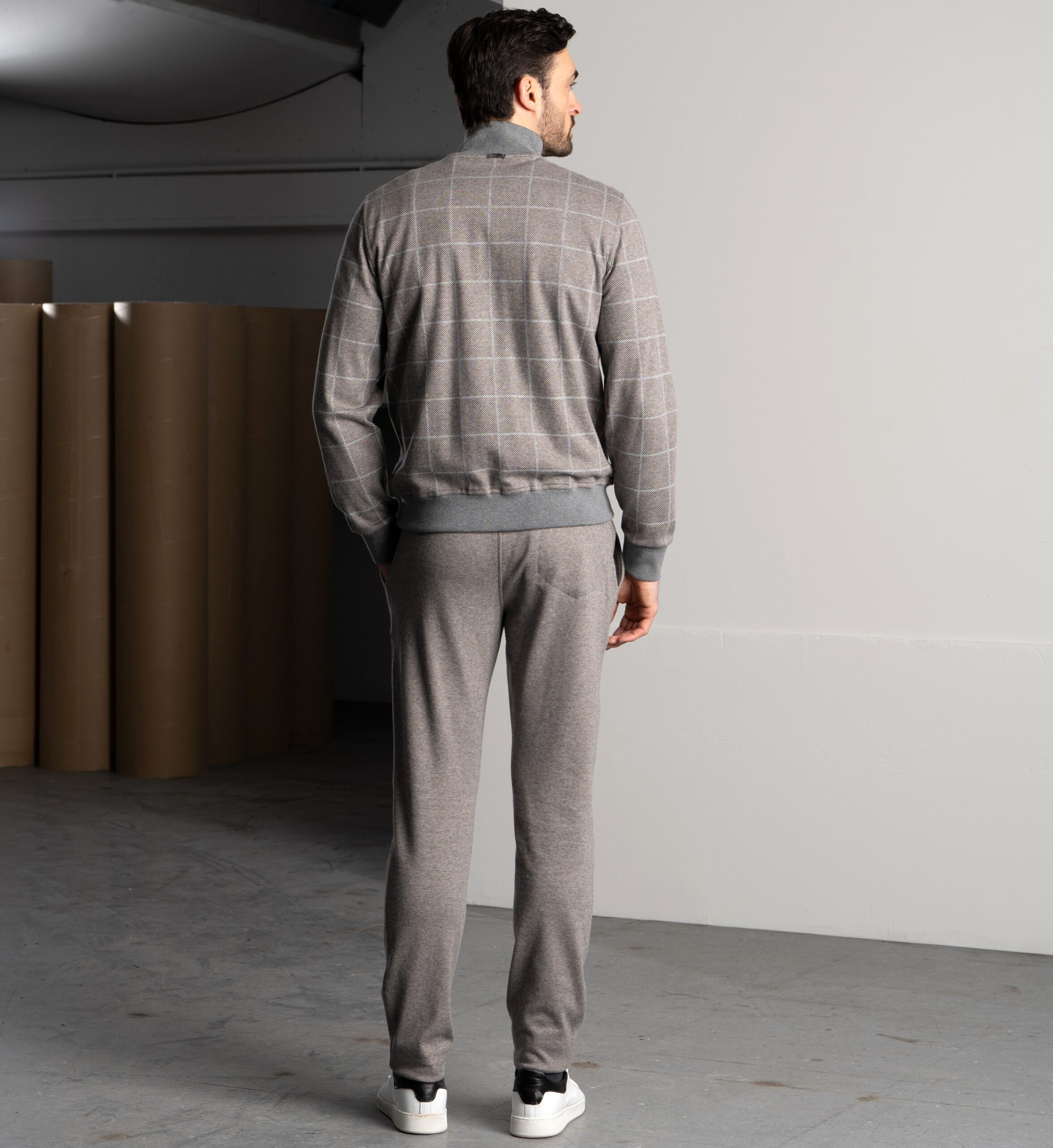Un completo pensato per le stagioni fredde, realizzato con materiali di alta qualità. La giacca con zip è in morbido cotone invernale a quadri, caldo e traspirante, con dettagli in maglia per polsini e fondo. La fodera interna assicura comfort e assorbimento dell’umidità. Zip con doppi tiretti logati, placchetta metallica sul colletto e tasche ben distribuite completano il capo. I pantaloni, in felpa di cotone mélange tinta unita, offrono una piacevole sensazione sulla pelle. Dotati di tasche laterali e posteriori con bottoni logati, vita elasticizzata e coulisse con stopper personalizzati, garantiscono libertà di movimento e stile. Un set versatile, curato nei dettagli, che esalta la qualità del tessuto e il piacere di indossarlo.