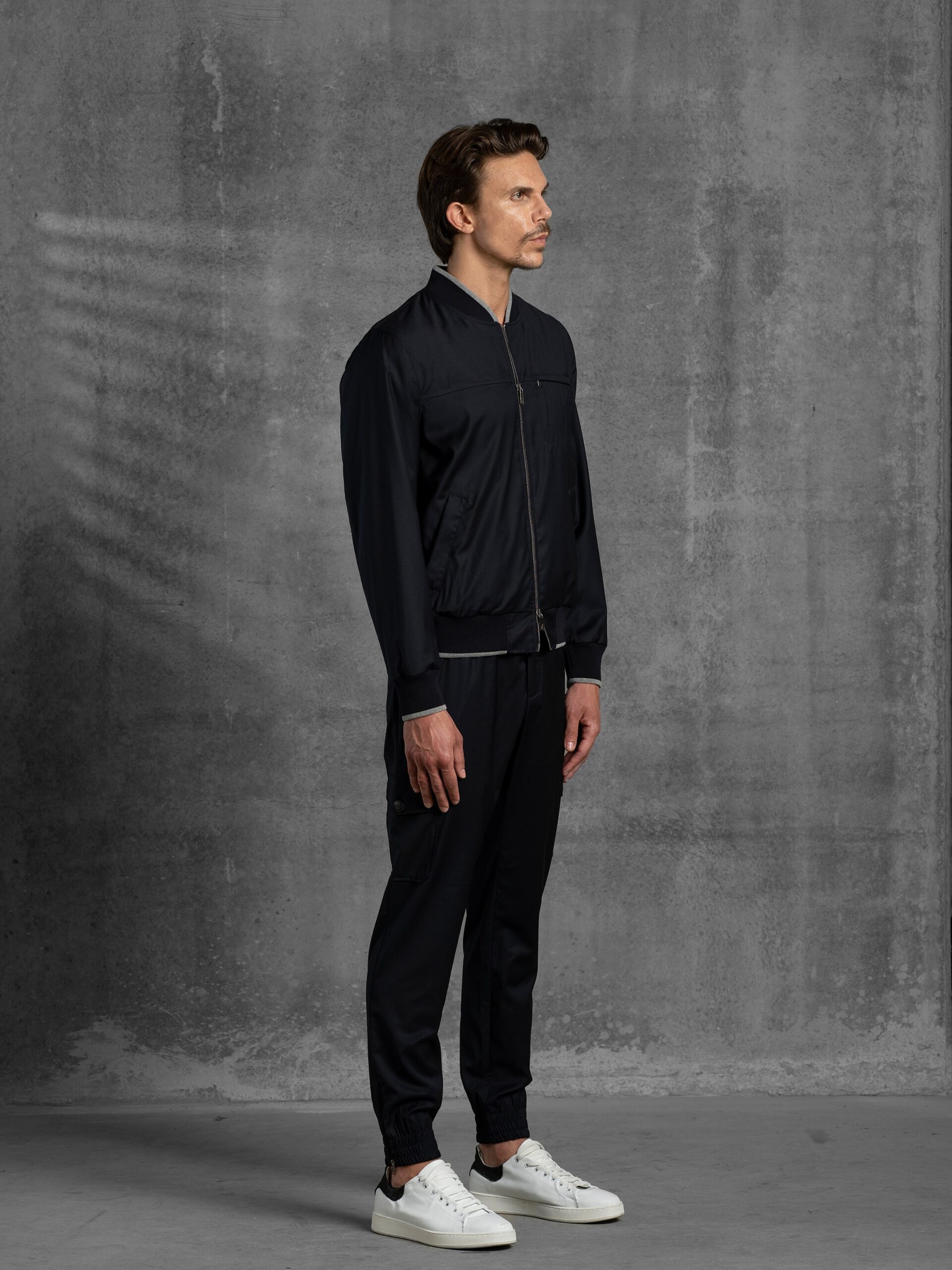 Set composto da Bomber e Easy-pants dal design fresco e contemporaneo, realizzato in pregiata lana merino extrafine, leggera e naturalmente traspirante. Il Bomber presenta collo, polsini e fondo in fine costina di cotone, chiusura con zip a doppio cursore logato, due tasche laterali con zip e tirazip logato, taschino interno sul petto e fodera in jersey di puro cotone tinto filo per una perfetta traspirabilità. I pantaloni Easy-pants abbinati sono caratterizzati da vita elasticizzata con coulisse e clip logate, fondo elasticizzato, due tasche laterali, due tasche posteriori con bottoni logati e due tasche applicate sulle gambe, anch’esse con bottoni logati. Entrambi i capi sono traspiranti, antibatterici e lavabili, ideali per mantenere la temperatura corporea anche nelle giornate più calde. Un set versatile e chic, perfetto per un’eleganza rilassata e funzionale.