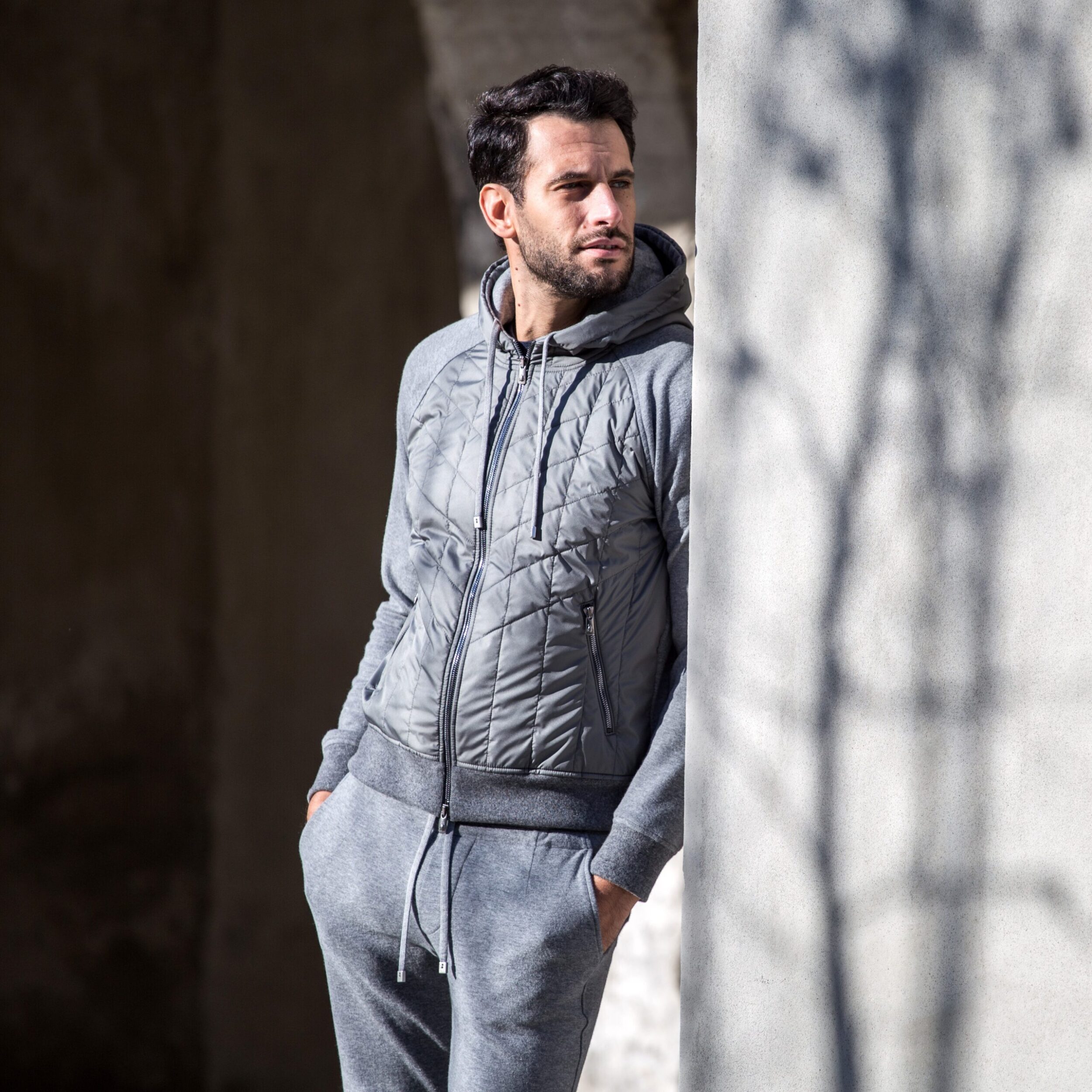 Felpa con cappuccio full-zip imbottita in seta pregiata, realizzata in morbido tessuto cotone spazzolato e cashmere melange, con nylon trapuntato imbottito in seta pura sul davanti. La fodera interna è in jersey di puro cotone e presenta una tasca interna. Le costine lavorate a maglia in lana e cashmere per polsini e fondo vita aggiungono comfort. Il cappuccio è dotato di coulisse e la chiusura è una zip completa con logo. Presenta due tasche con zip logate sul davanti. Un capo di lusso perfetto per il tempo libero.