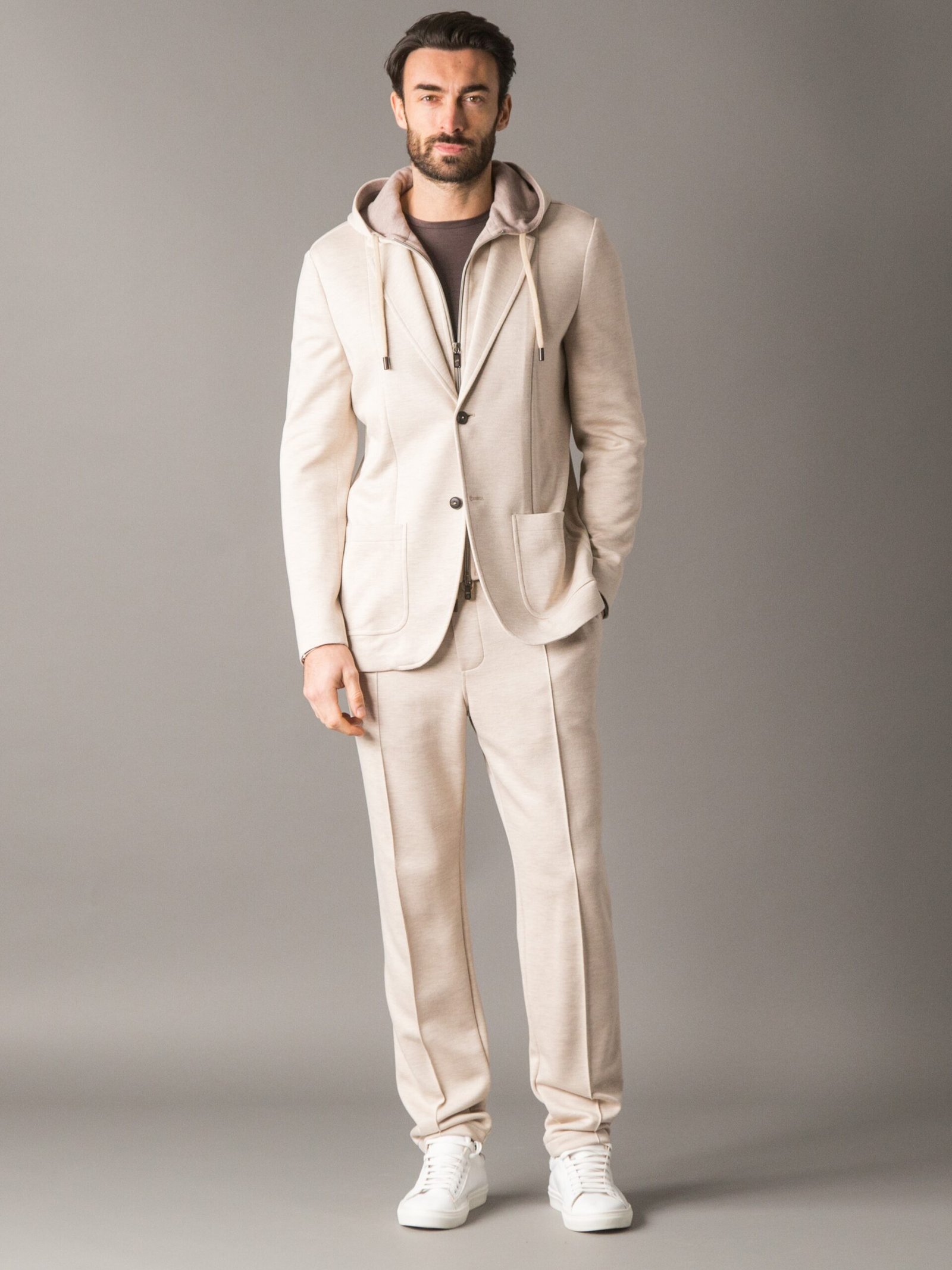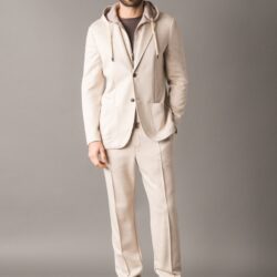 Blazer con cappuccio dallo stile smart e luxury, realizzato in un pregiato e morbido tessuto melange Cashcot-modal, piacevole al tatto e ideale per un’eleganza rilassata. Presenta un inserto interno con cappuccio e chiusura a zip con doppio cursore logato, due tasche laterali e chiusura frontale con bottoni logati. La fodera interna in cupro assicura traspirabilità e comfort, mentre le finiture sartoriali eseguite a mano valorizzano la qualità artigianale del capo.
