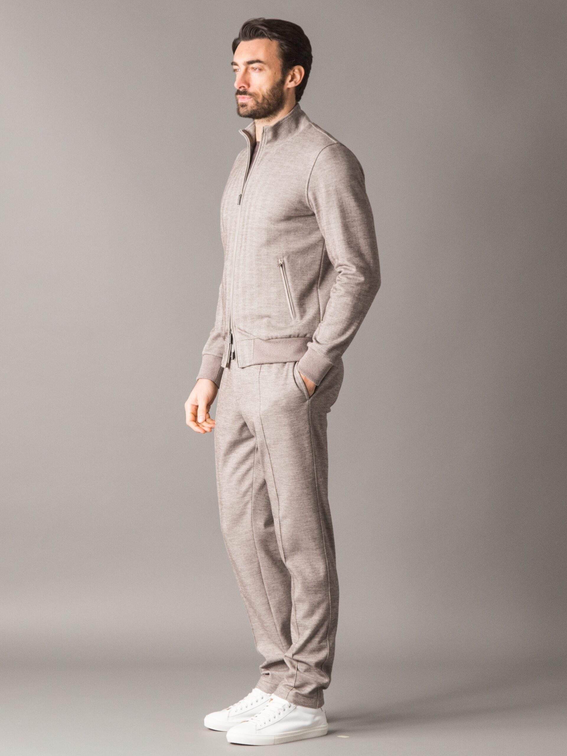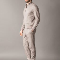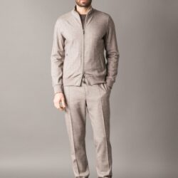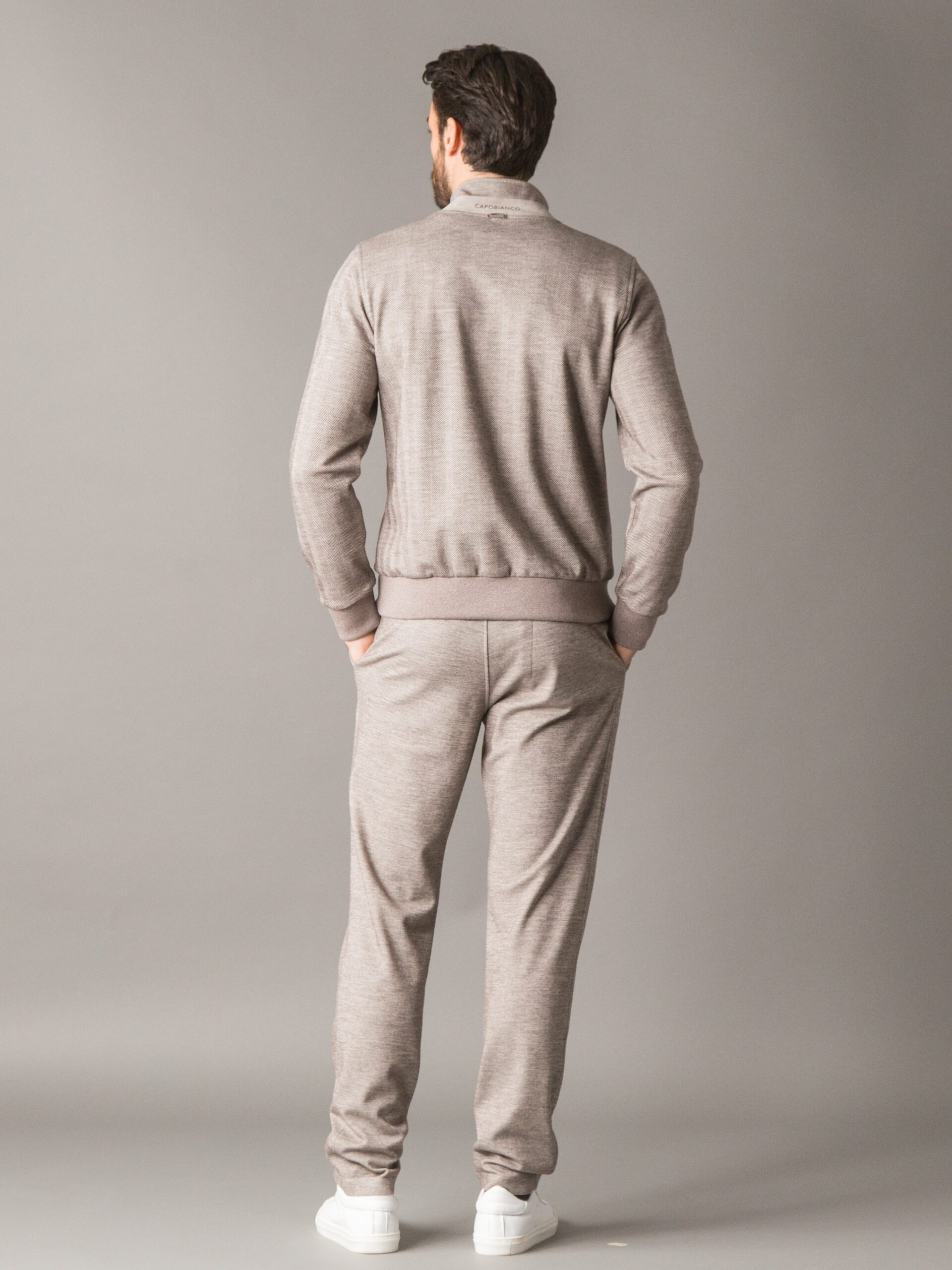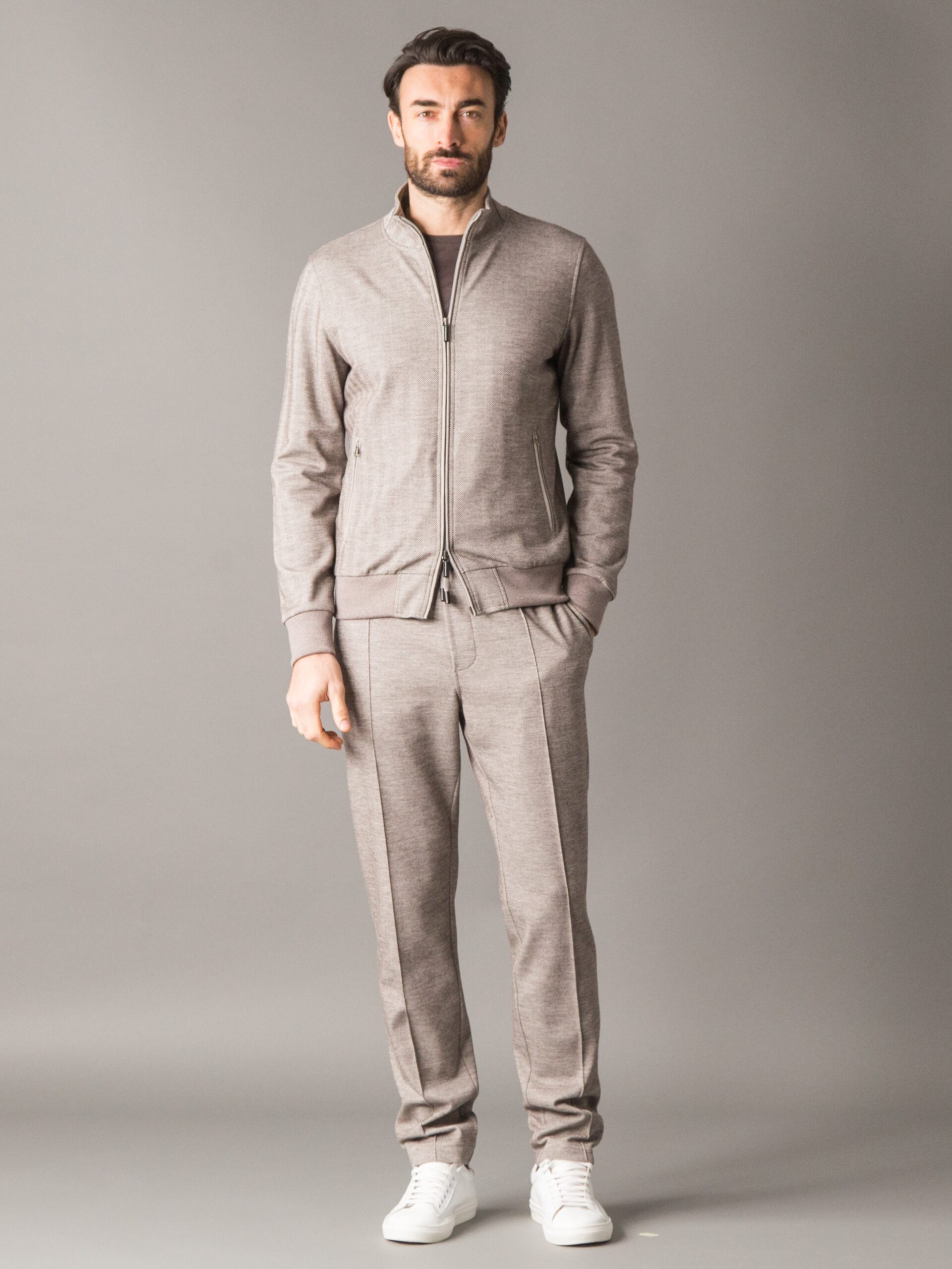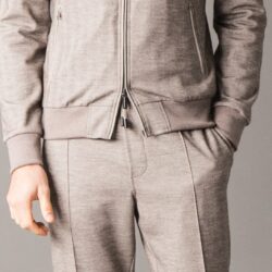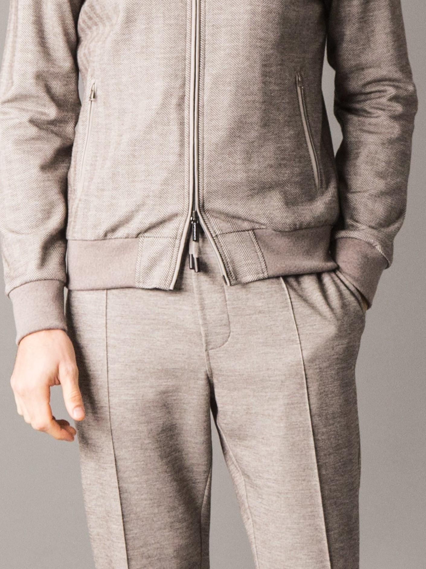 Set casual‑elegante composto da maglia full‑zip e sweat‑pants coordinati, realizzati in un pregiato tessuto Woolcot, una speciale miscela di lana e cotone che unisce la morbidezza e il calore della lana alla traspirabilità e al comfort del cotone. La maglia full‑zip presenta una mano calda e soffice grazie al tessuto Woolcot lavorato a motivo Chevron. I polsini e il fondo sono rifiniti in winter cotton a costina, mentre il colletto è arricchito da una patch logata in microfibra Nabuk. La zip frontale è completata da piping in Nabuk e da due cursori logati. Il capo è dotato di due tasche laterali con profilo e una tasca interna sul petto. La fodera in winter cotton assicura un’eccellente capacità di assorbimento dell’umidità e un comfort ideale nelle giornate fredde. I sweat‑pants coordinati, realizzati in un raffinato Woolcot oxford mélange, offrono una linea contemporanea e confortevole. Presentano due tasche laterali, una tasca posteriore con bottone logato e una cucitura centrale che slancia la gamba. La vita elasticizzata con coulisse regolabile è completata da stopper in metallo logati, garantendo una vestibilità pratica e curata. Un set versatile e sofisticato, perfetto per il tempo libero, i viaggi o un’eleganza rilassata di tutti i giorni.