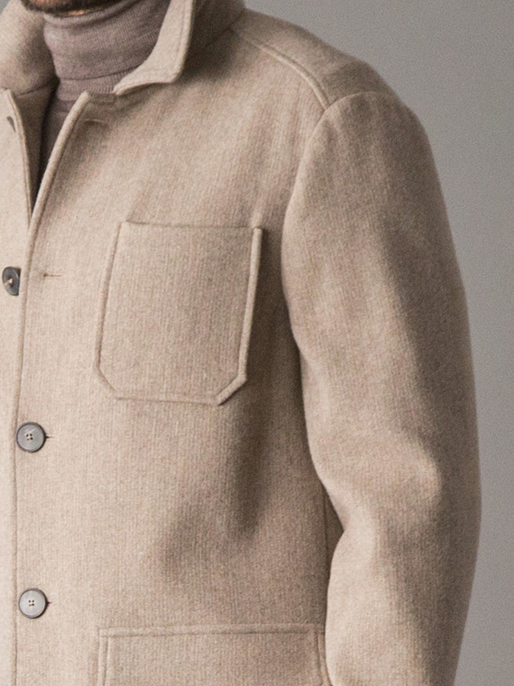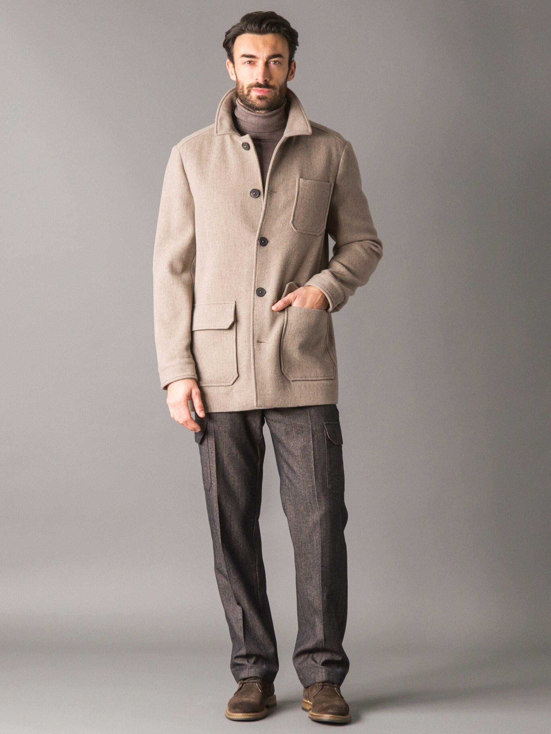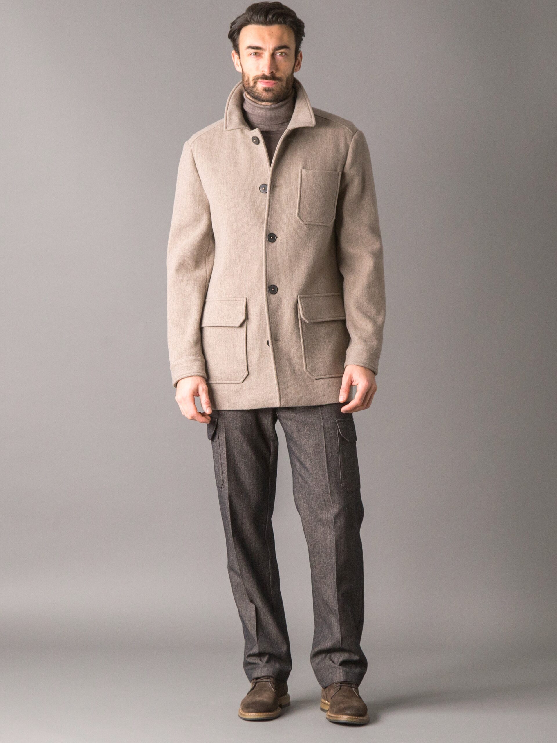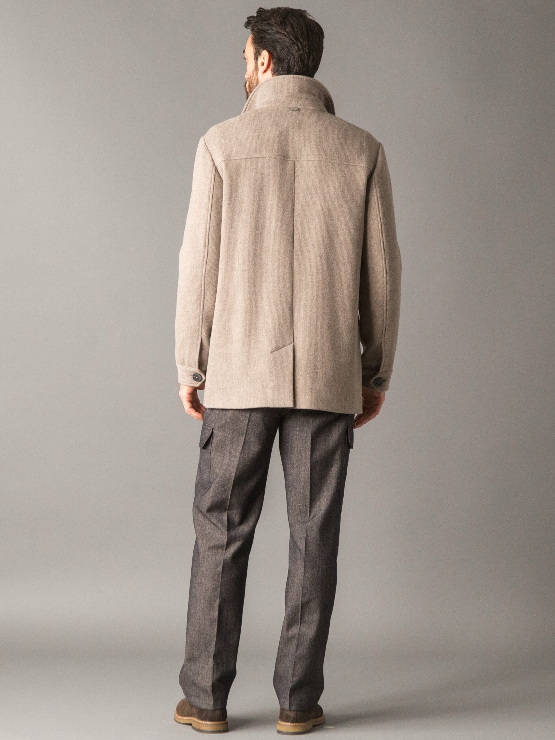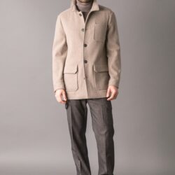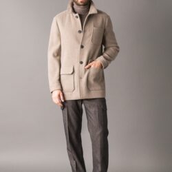 Cappotto carcoat dallo stile smart e luxury, realizzato in un pregiato tessuto melange di lana e cashmere, caldo, morbido e naturalmente raffinato. La ricchezza della fibra conferisce al capo una mano soffice e un aspetto elegante, ideale per un’eleganza quotidiana ma ricercata. Il modello presenta due tasche applicate ai lati con pattina e una tasca sul petto, chiusura frontale con bottoni logati e polsini a taglio camicia con bottoni personalizzati. Il capo non è foderato, ad eccezione delle maniche, rivestite in cupro per garantire maggiore comfort, traspirabilità e scorrevolezza nell’indosso. Sul retro del collo è applicata una placca metallica con logo, dettaglio distintivo che completa il design con un tocco di esclusività.