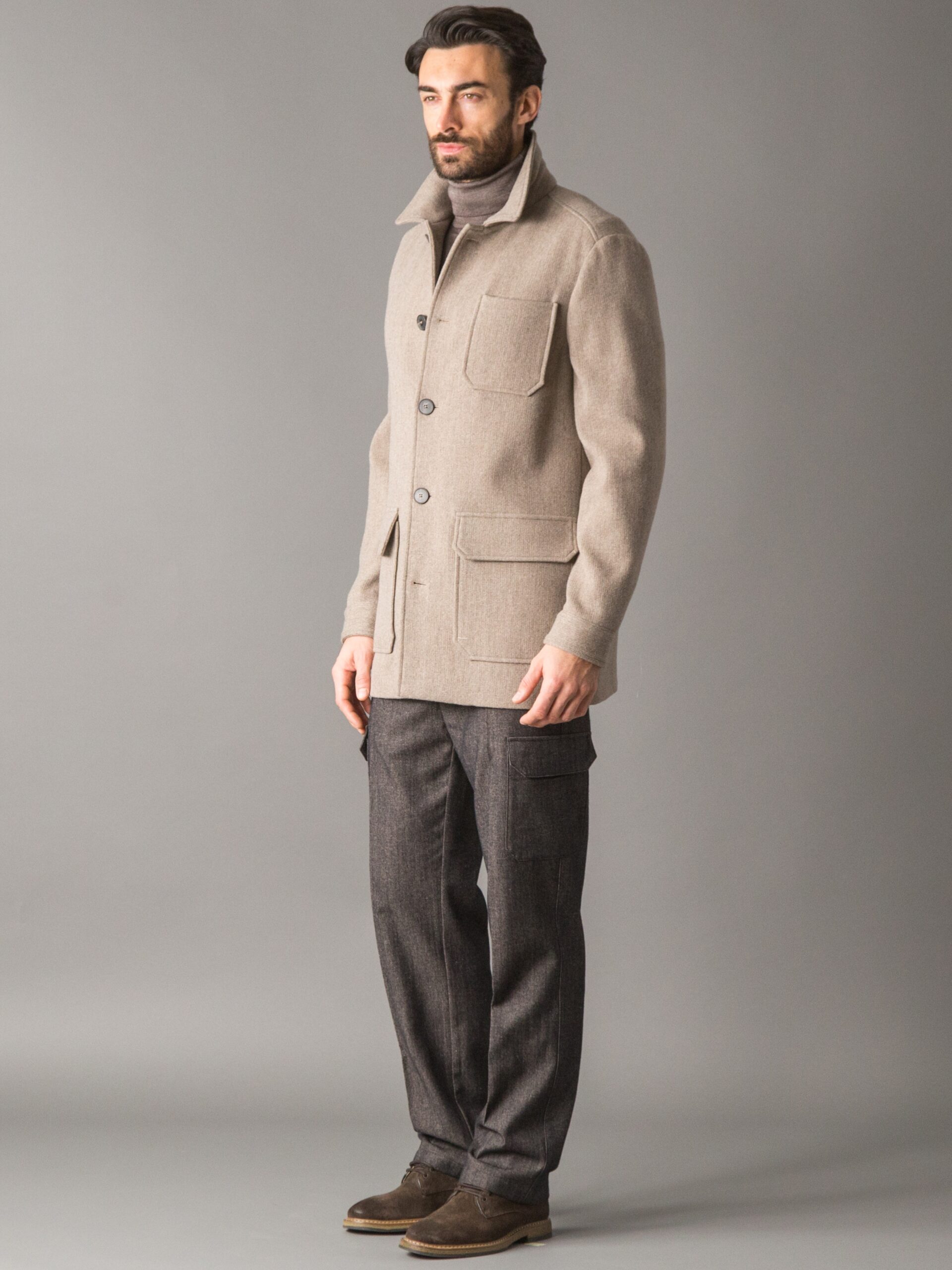 Composizione tessuto: 93% Lana vergine, 6% Cashmere, 1% Elastan; Una combinazione calda e morbida, con un leggero tocco di elasticità per maggiore comfort.