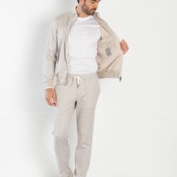 Set tuta realizzato in pregiato tessuto soft-jersey di cotone e lino, tinto in filo con disegno spina irregolare. La combinazione di jersey di cotone e lino offre morbidezza, traspirabilità, resistenza, eleganza naturale e sostenibilità. La felpa full-zip presenta una zip a doppio cursore logato, bordature in maglia di cotone a coste fini con riga in contrasto su collo, fascia e polsi, e due tasche sui fianchi foderate in leggero jersey di cotone. I pantacoulisse sono dotati di due tasche sui fianchi, una tasca posteriore con bottoni logati e una vita elastica con coulisse e clip logate, che garantiscono una vestibilità comoda e pratica. Un set casual-chic dallo stile sofisticato e ricercato, ideale per ogni occasione.