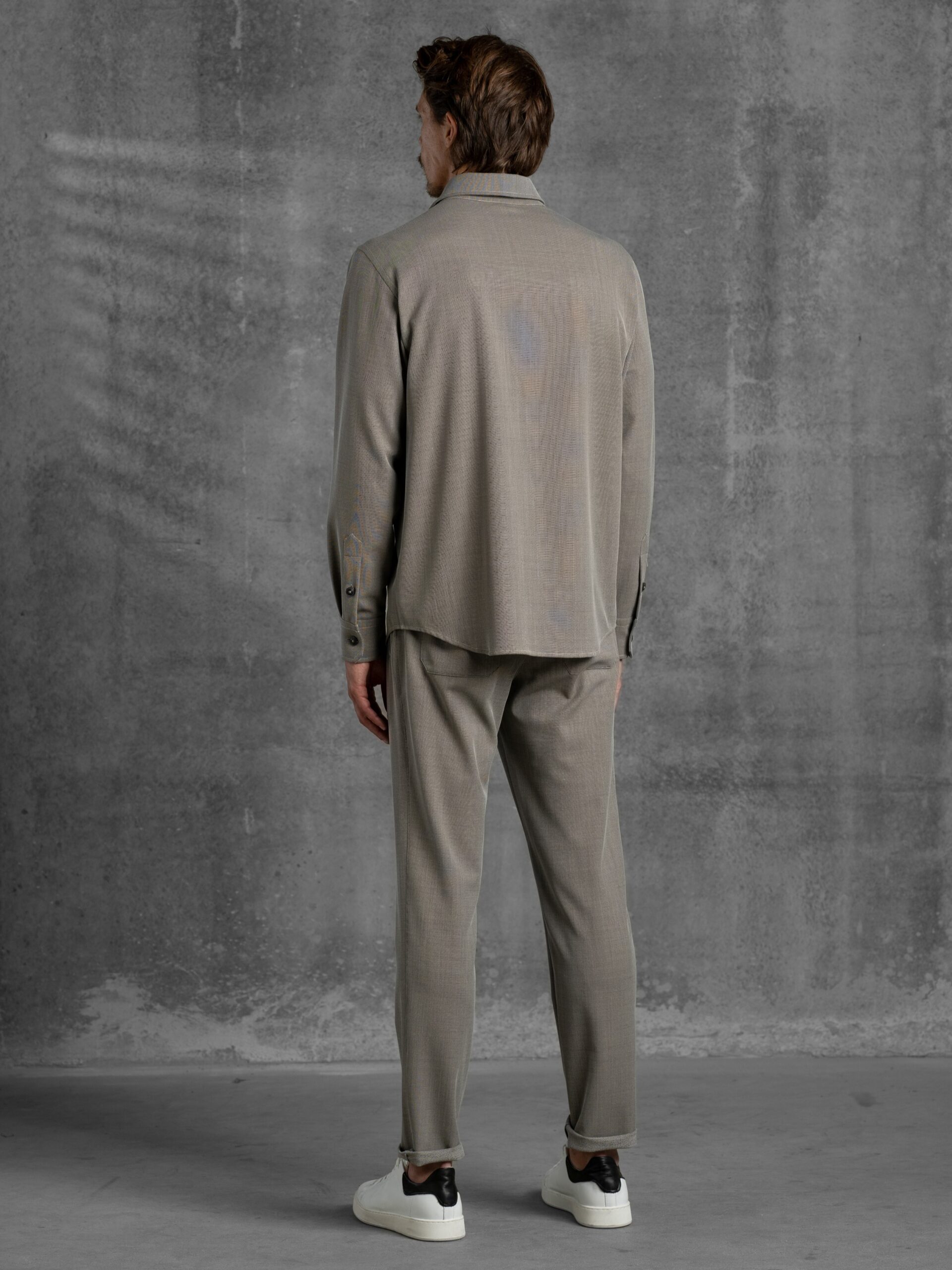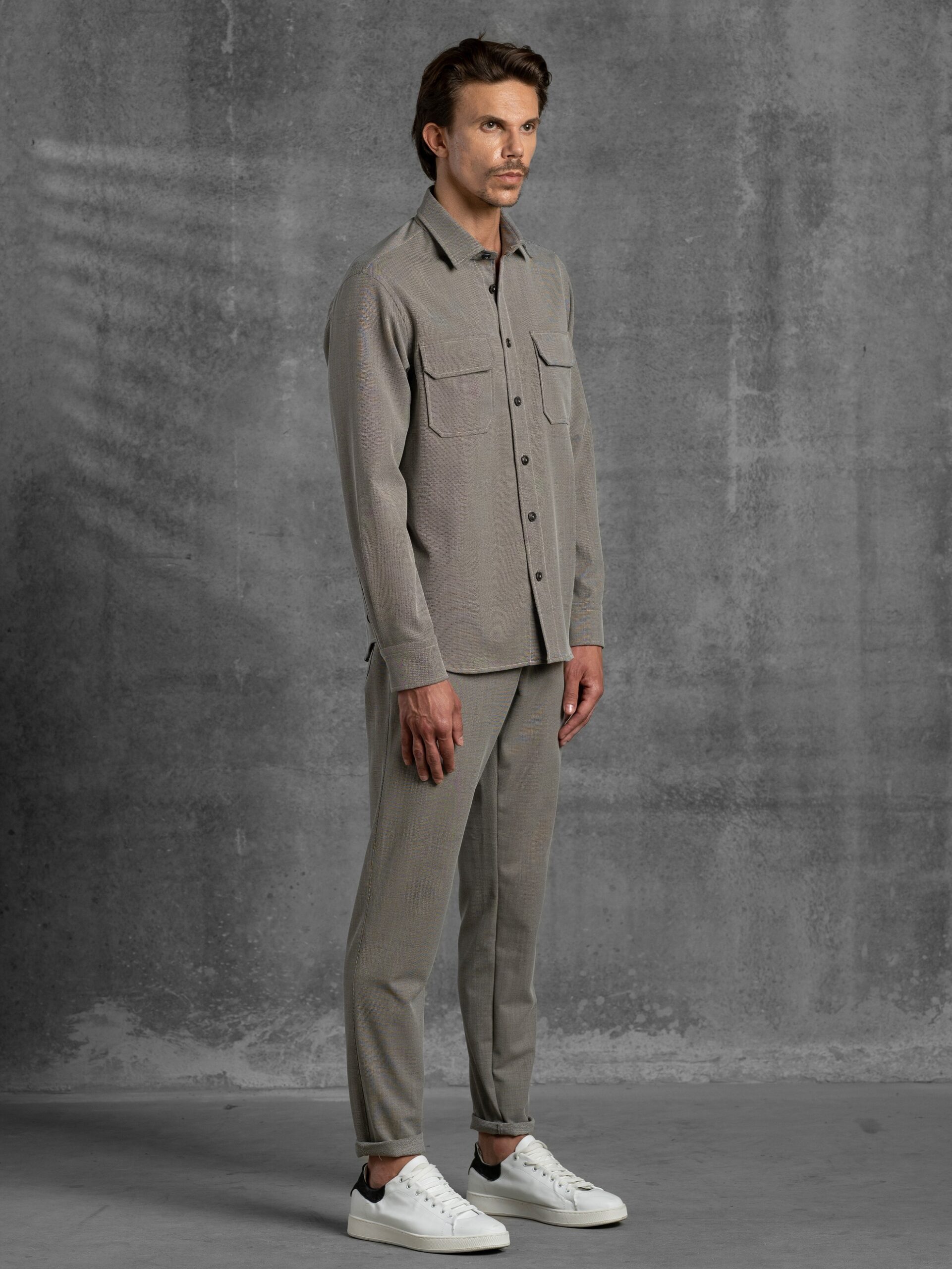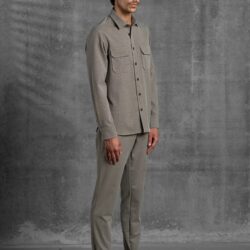 Completo casual composto da overshirt e pantaloni coordinati, realizzato in tessuto leggero stretch e antipiega, ideale per uno stile dinamico e curato che garantisce libertà di movimento e una vestibilità impeccabile. L’overshirt presenta un design fresco e funzionale, con due tasche sul petto con pattina, bottoni logati, colletto classico e polsini. I pantaloni, dal taglio trendy ed elegante, sono dotati di due tasche sui fianchi, due tasche posteriori con bottoni logati, vita elasticizzata con coulisse regolabile e terminali logati. Un look versatile e contemporaneo, perfetto per affrontare la giornata con stile e comfort.
