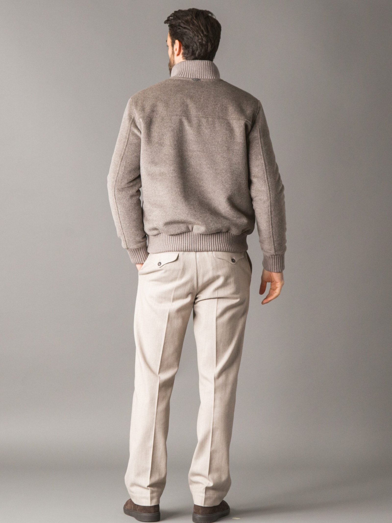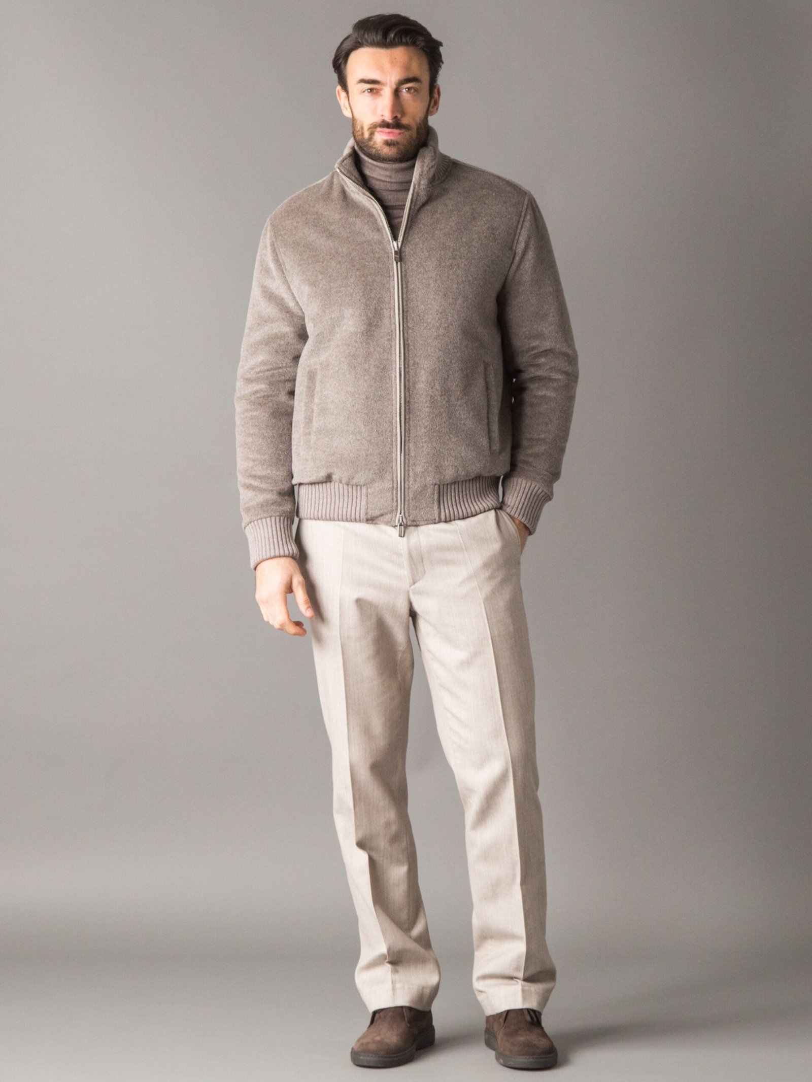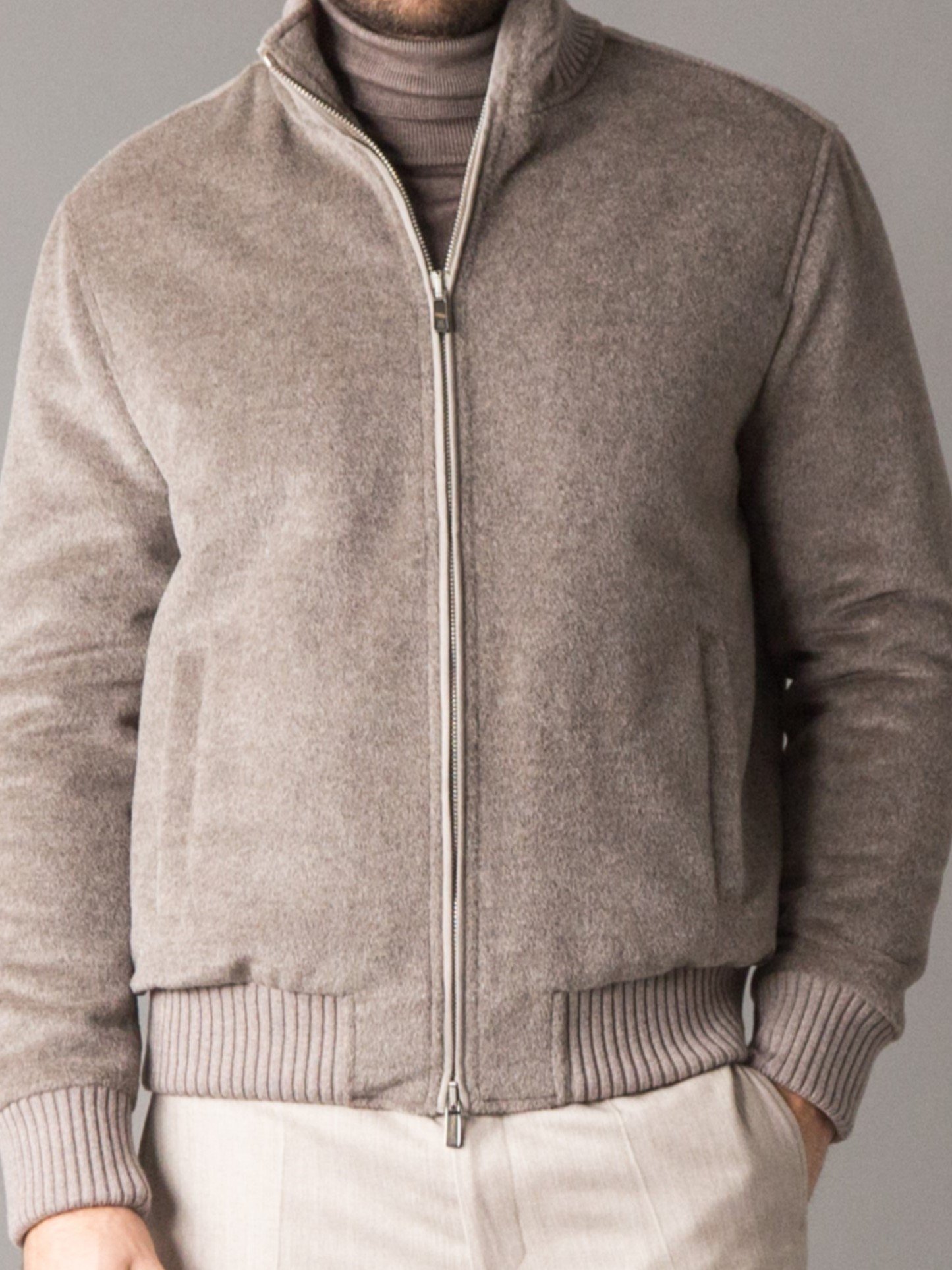 Bomber elegante e funzionale, realizzato in un caldo e pregiato velluto spazzolato di lana e alpaca, dalla texture morbida e avvolgente. I bordi di collo, polsi e fondo vita sono rifiniti in maglia Cashwool, per un tocco di comfort e raffinatezza. La zip frontale in metallo è impreziosita da profili in Micronabuk e doppi cursori logati. Completano il design due tasche laterali, una tasca interna sul petto e una placchetta logo in metallo sul retro del colletto. L’imbottitura in Climalight Ecowadding, poliestere riciclato ad alte prestazioni, assicura calore e leggerezza, mentre la fodera interna antivento in poliestere riciclato garantisce protezione e traspirabilità. Un bomber pensato per affrontare la stagione fredda con stile deciso e materiali d’eccellenza.