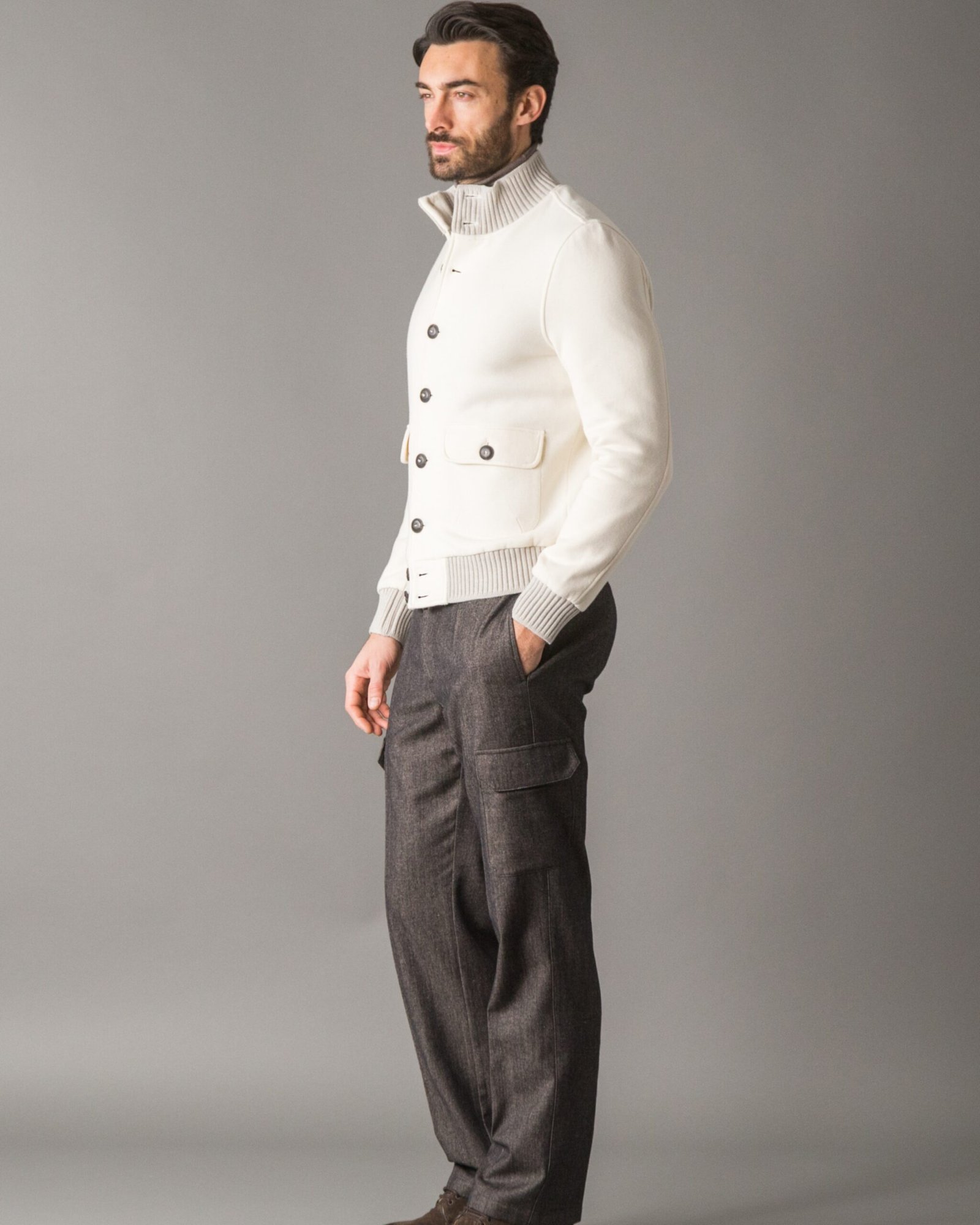 Blouson sofisticato e versatile, realizzato in una preziosa felpa spazzolata di cotone e cashmere, calda e morbida al tatto. I bordi di collo, polsi e fondo vita sono rifiniti con costine in Cashwool, che aggiungono eleganza e struttura. La chiusura frontale è arricchita da bottoni logati, mentre le due tasche applicate con bottoni e la tasca interna sul petto offrono funzionalità con stile. L’interno è foderato in jersey di puro cotone, per garantire il massimo comfort e una perfetta traspirabilità. Sul retro, una placca in metallo con logo impreziosisce il colletto, firmando il capo con discreta eleganza. Perfetto per chi cerca un look casual ma ricercato, con dettagli di lusso che fanno la differenza.