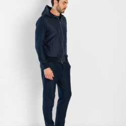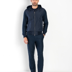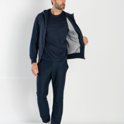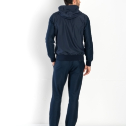 Set tuta sport-chic realizzato in fresco tessuto di puro cotone Supima a costa leggera, traspirante e di alta qualità, combinato con nylon impermeabile e antipioggia. La hoody è confezionata in poliestere antipioggia, con maniche in fresco cotone Supima a costa leggera, traspirante e confortevole, e una fodera in leggero jersey di puro cotone per un comfort superiore. È dotata di zip frontale con doppio cursore logato, cappuccio con coulisse regolabile e clip logate, fascia e polsi in cotone a coste fini, oltre a due pratiche tasche con zip e un taschino interno. Pantacoulisse, realizzati in morbido soft-jersey di cotone Supima a costa leggera, garantiscono una vestibilità comoda grazie alla vita elastica con coulisse e clip logate. Sono completi di due tasche laterali e una tasca posteriore con bottoni logati, unendo praticità e stile.