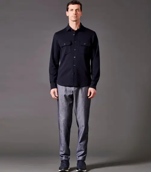 Tessuto principale: 98% Cotone / 2% Poliammide + 100% Suede. Cotone per comfort, poliammide per resistenza, suede per un aspetto elegante e mano vellutata.