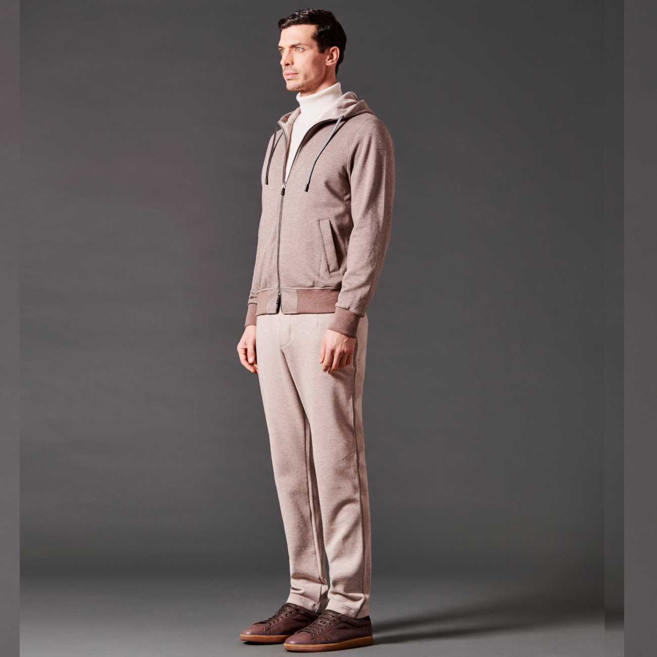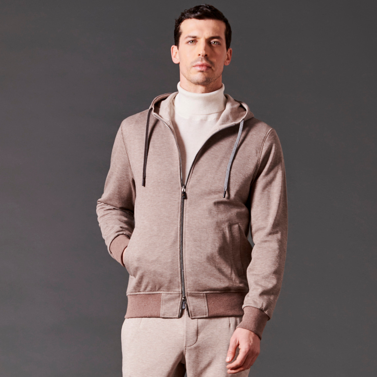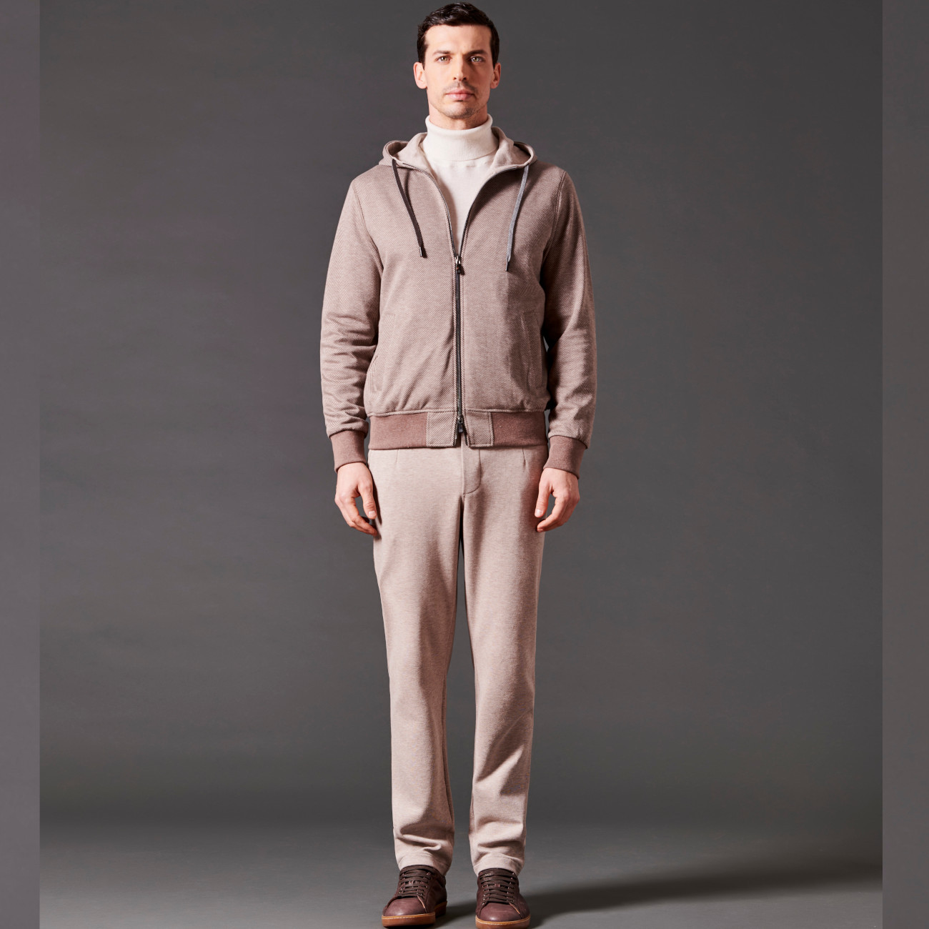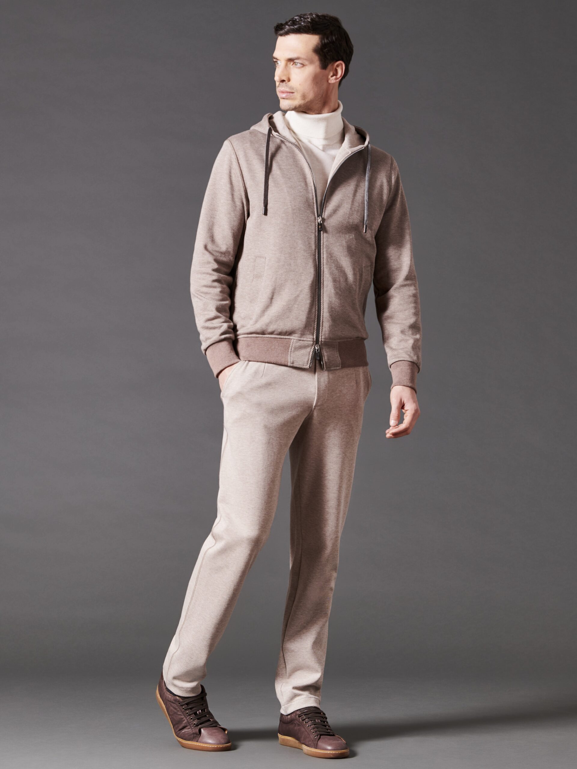 Completo leisure-chic con felpa full-zip con cappuccio, realizzato con un tessuto invernale di cotone spazzolato a design diagonale. Presenta costine lavorate a maglia per polsini e fondo vita, coulisse sul cappuccio con stopper logato in Zama, due tasche laterali e una tasca interna, placchetta logo in metallo sul retro del colletto. La fodera interna in jersey di puro cotone garantisce il miglior assorbimento dell'umidità corporea. Pantaloni realizzati con un caldo tessuto invernale di cotone spazzolato melange in tinta unita. Dotati di due tasche laterali e una tasca posteriore con bottoni logati, presentano un elastico in vita con coulisse e due stopper metallici logati per una regolazione comoda e personalizzata.