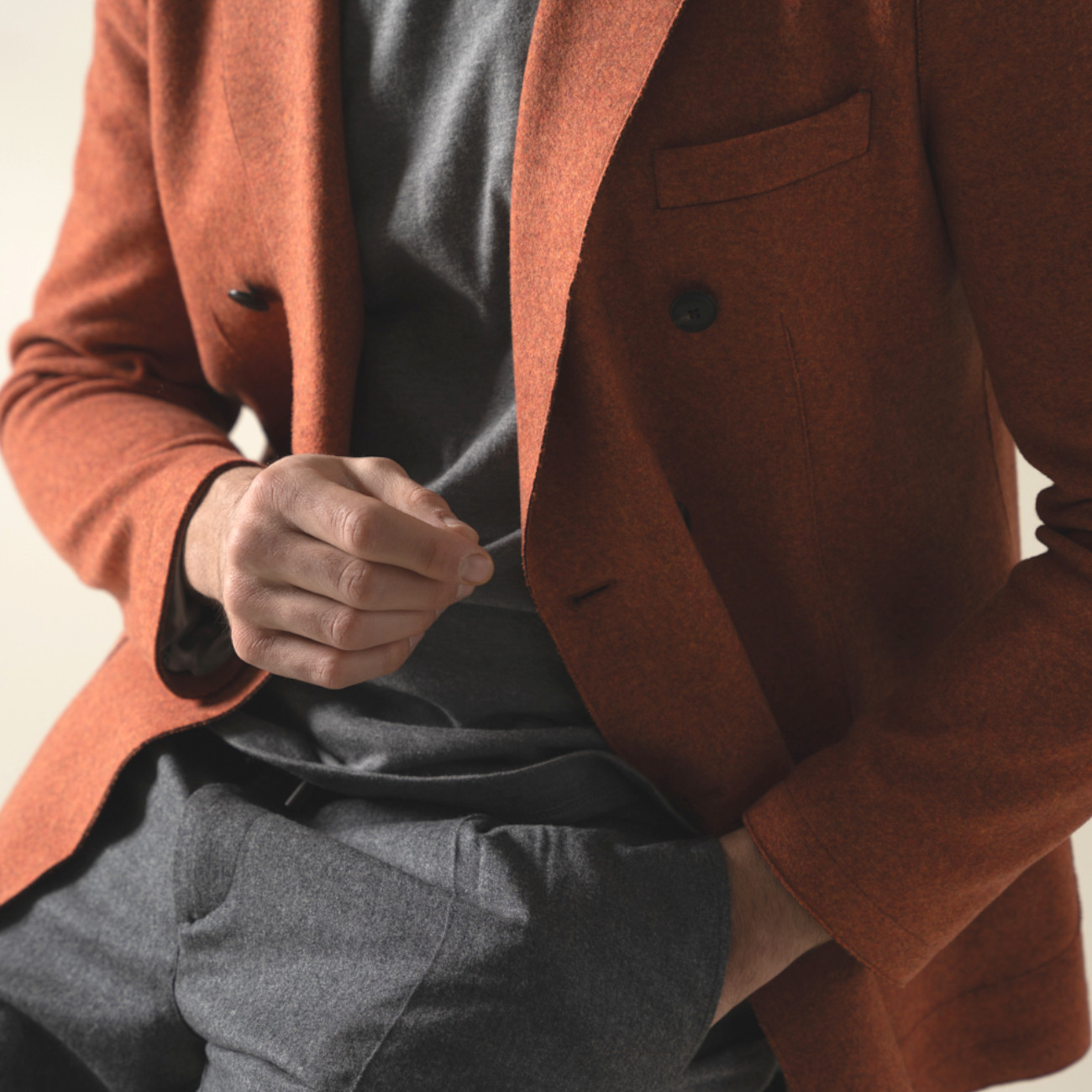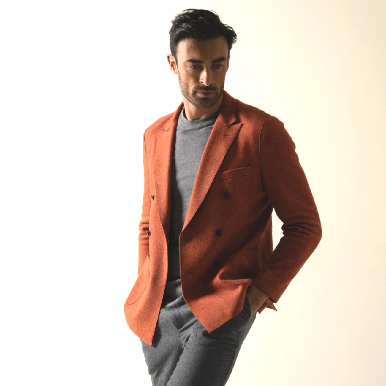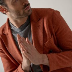 This elegant and casual double-breasted blazer features a pinstripe cut and is crafted from luxurious and warm felted wool and cotton fabric. The felted fabric offers excellent thermal insulation, keeping the body warm even on the coldest days. The combination of wool and cotton ensures comfort and durability, while the pinstripe cut adds a touch of visual elegance. The blazer features two side pockets, a chest pocket, and logo buttons on the front, with hand-stitched finishes adding an artisanal touch. The unstructured and unlined design of the blazer offers sophisticated yet informal elegance, allowing natural body movement without creating an overly formal appearance.