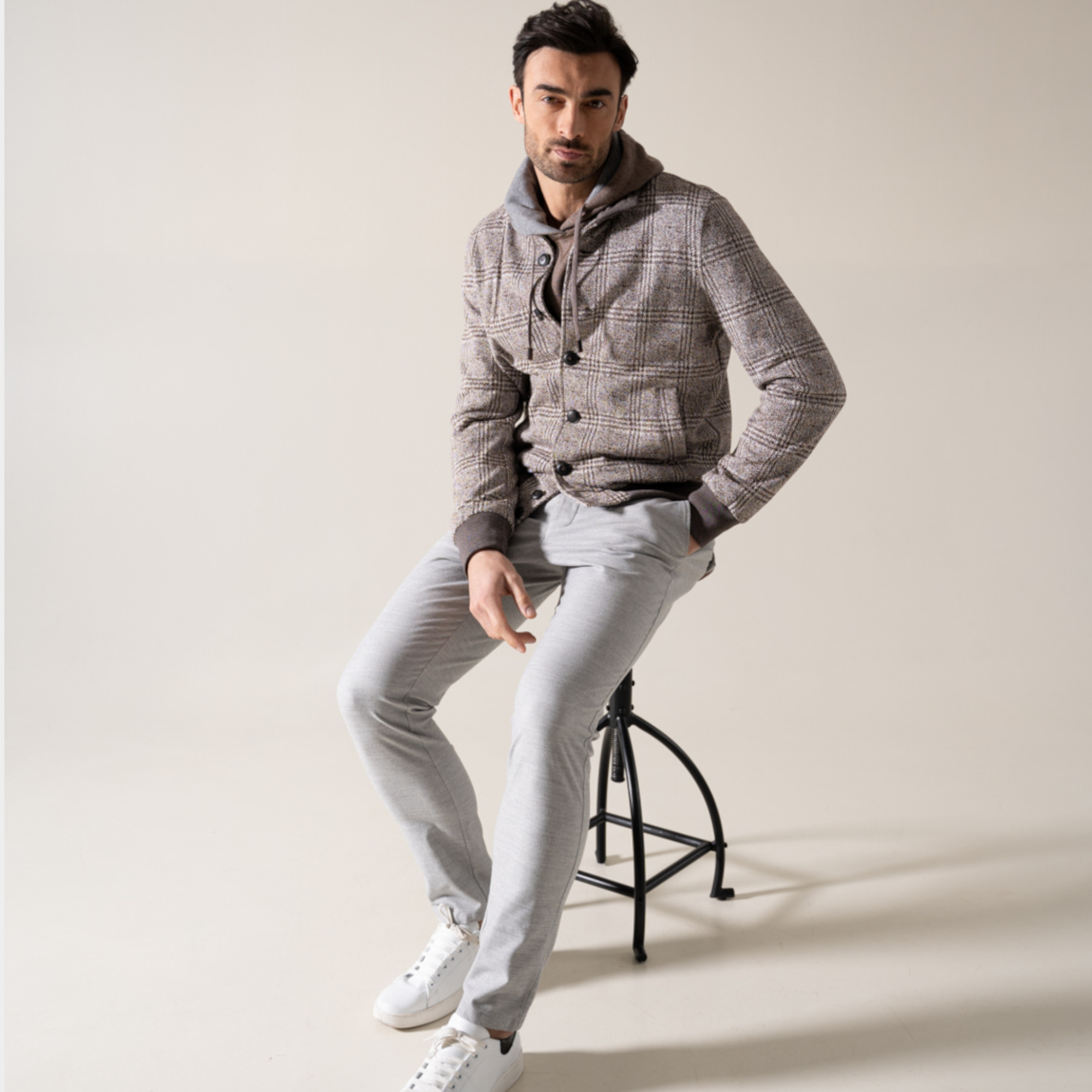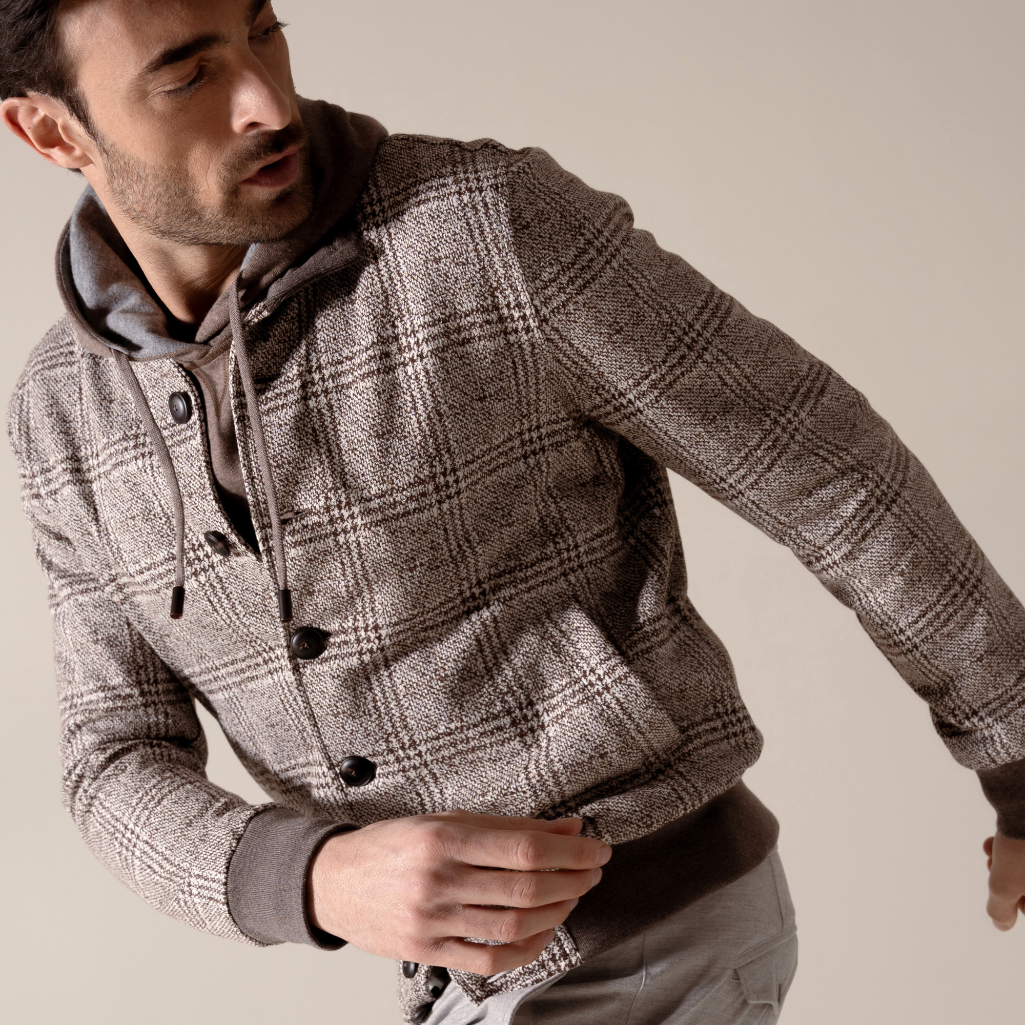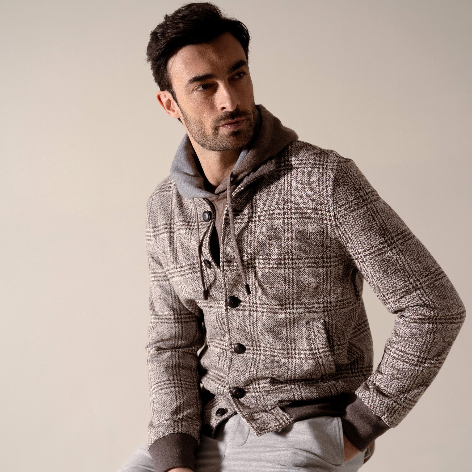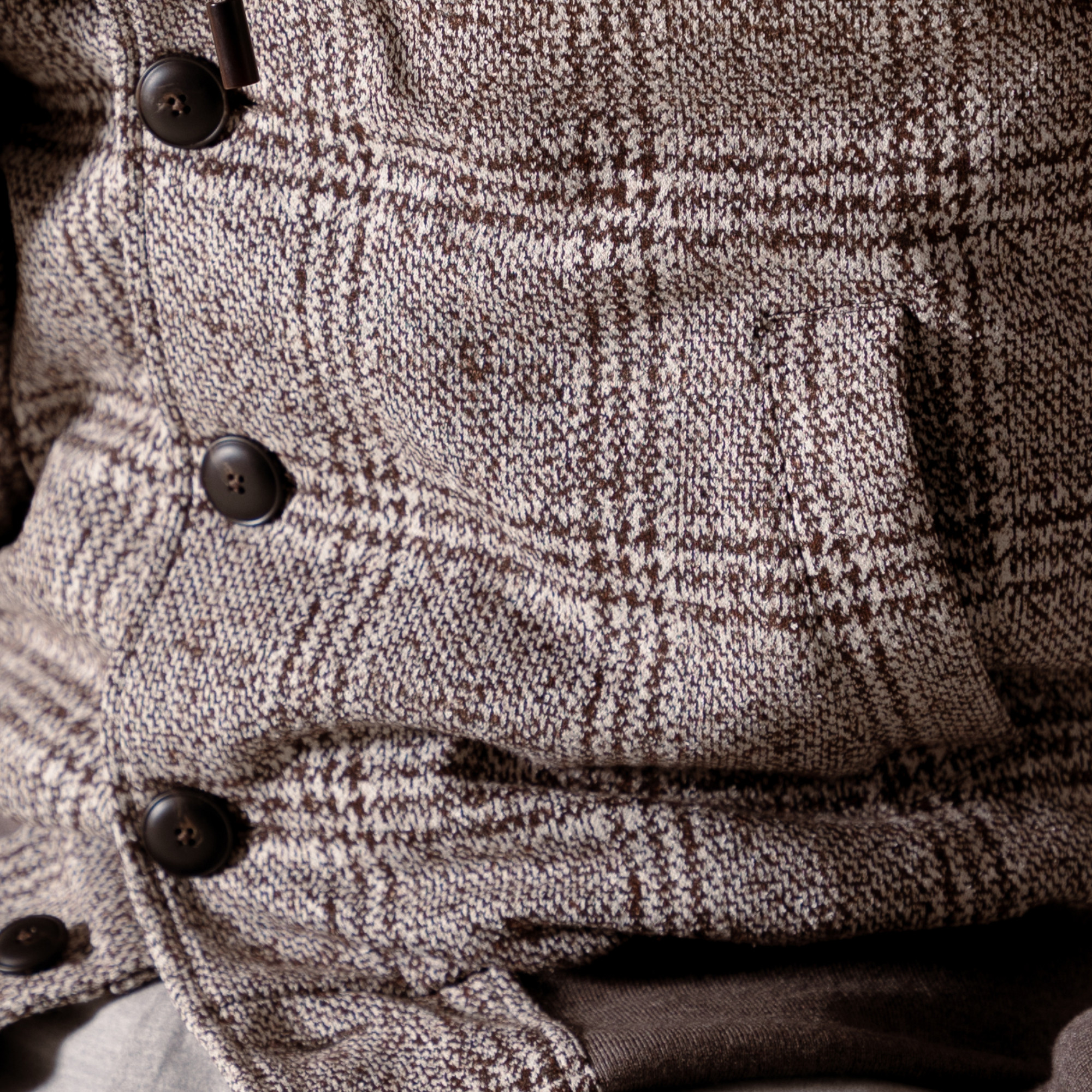 Crafted from a precious and soft Woolcot fabric with a Prince of Wales pattern, this blouson combines style and comfort in perfect balance. The rib knit details on the collar, cuffs and hem add a classic and refined touch. The front closure with branded buttons, the two flap patch pockets with customized buttons and the internal chest pocket ensure practicality and functionality. The pure cotton jersey lining provides superior comfort against the skin, while the metal logo plaque positioned on the back of the collar completes the design with a discreet yet distinctive detail.