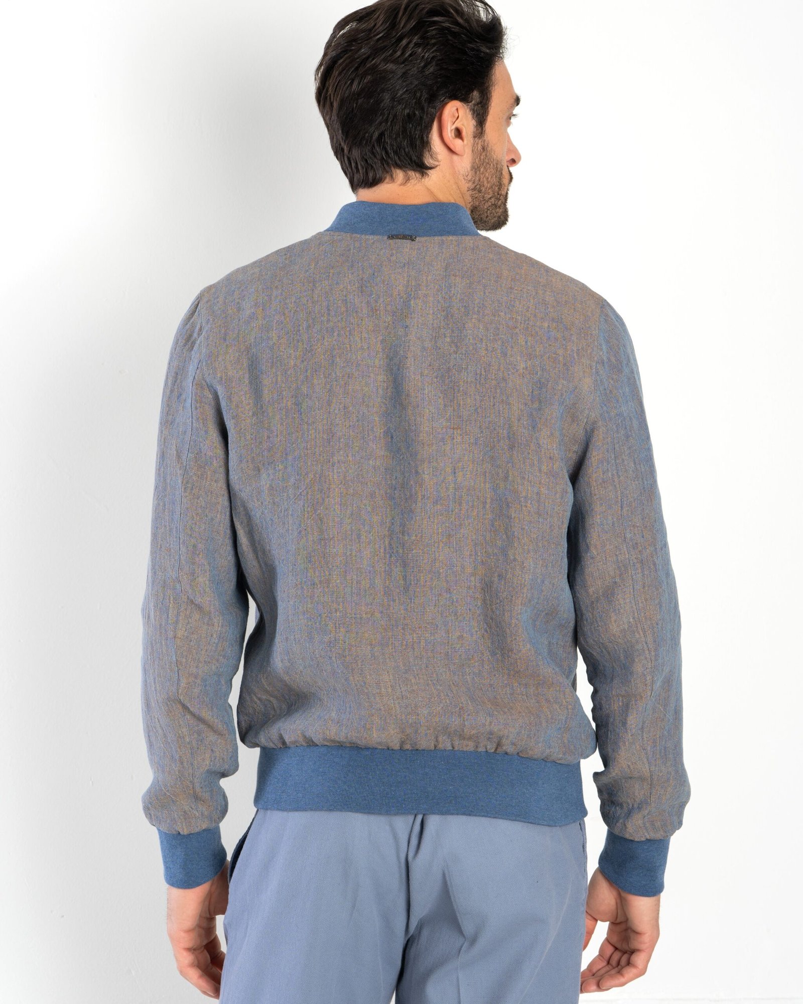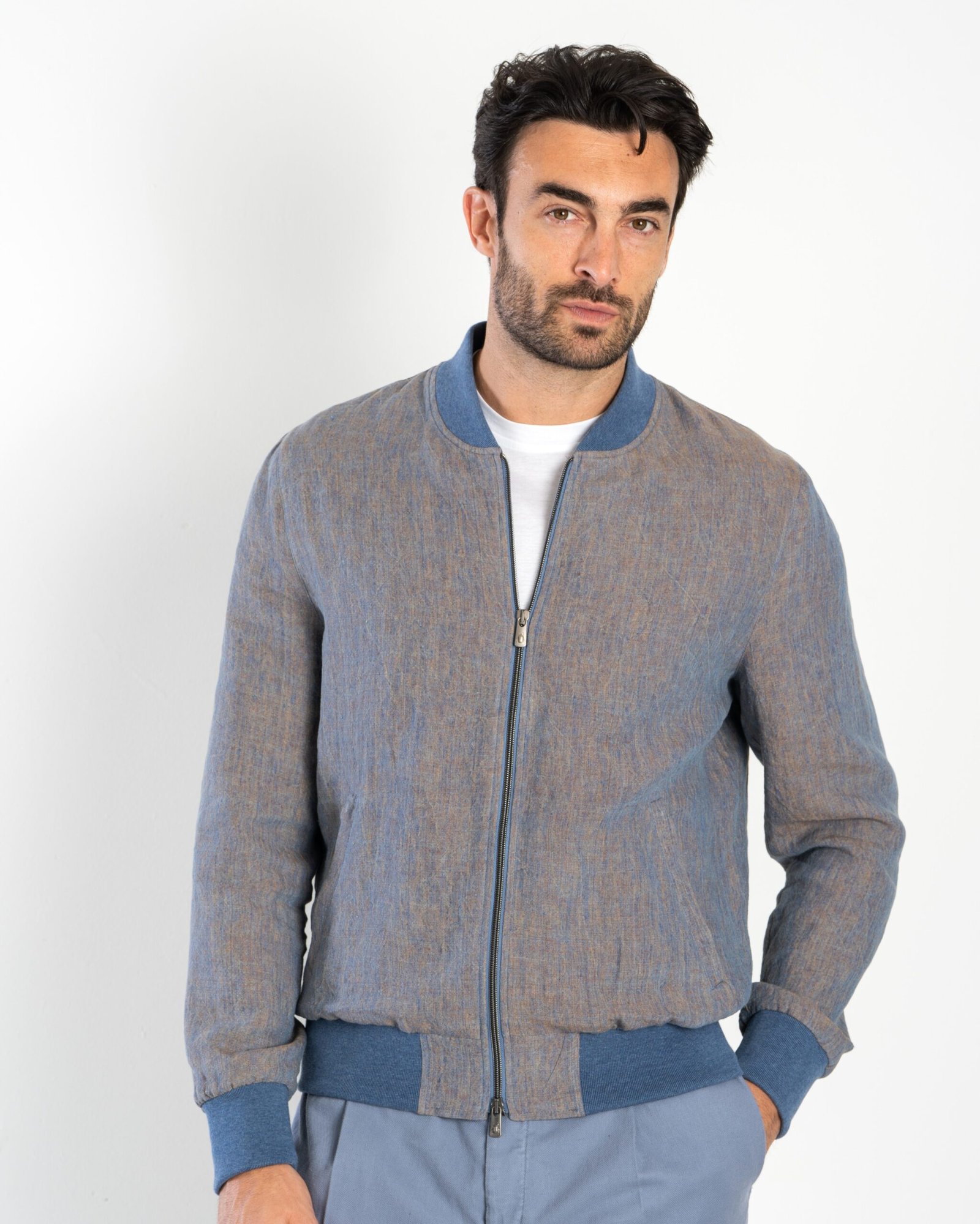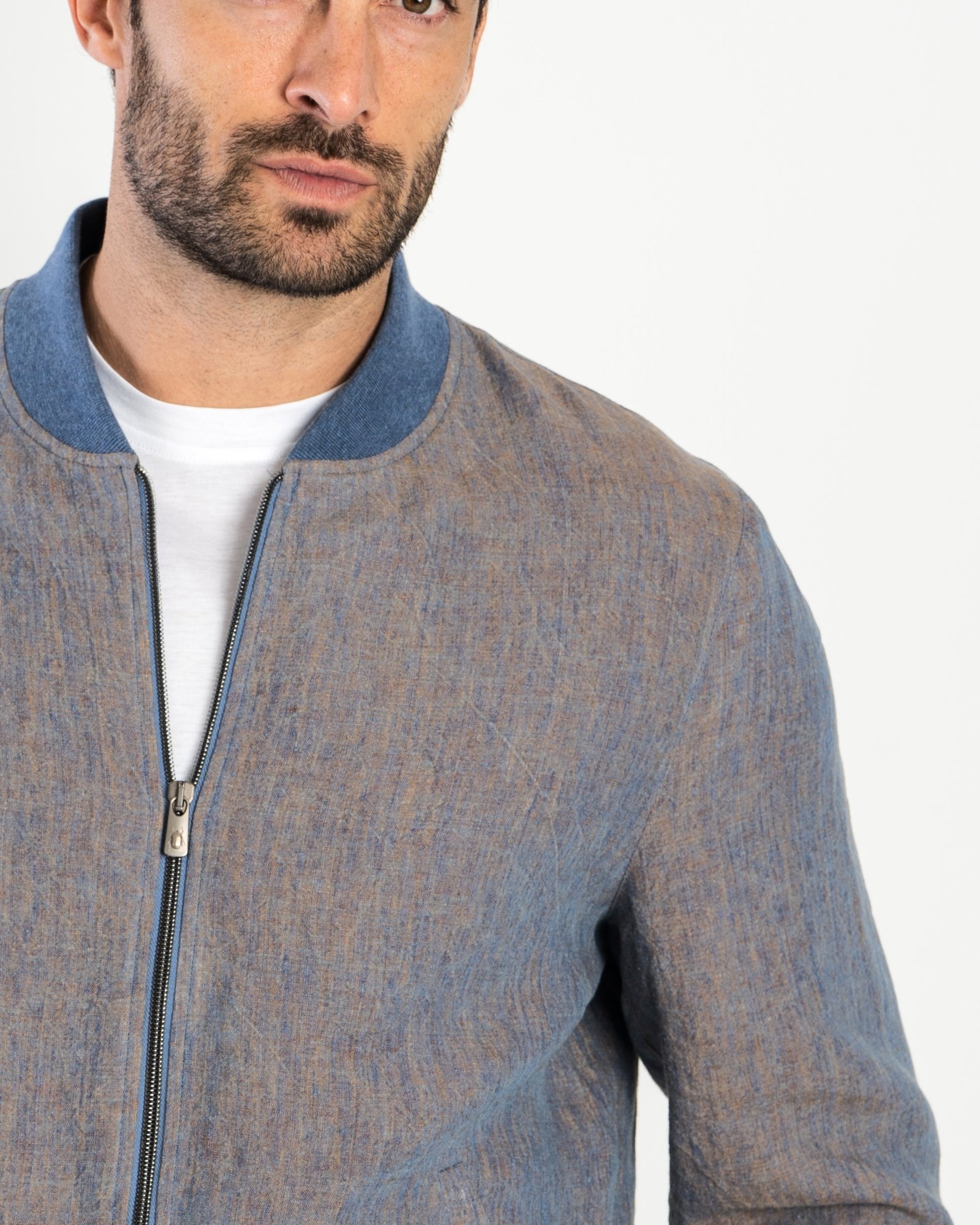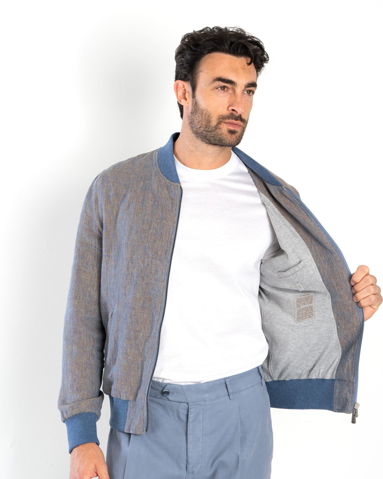 Fresh and trendy bomber jacket, crafted from premium pure linen yarn-dyed fabric with an iridescent finish, adding a touch of unique elegance. The lightweight pure cotton jersey lining ensures optimal breathability, while the fine ribbed cotton knit trims refine the design with sophistication. It features a double-logo zip closure, two practical zippered side pockets, and a convenient internal chest pocket. This bomber seamlessly blends style and functionality, making it perfect for both sophisticated and casual looks.