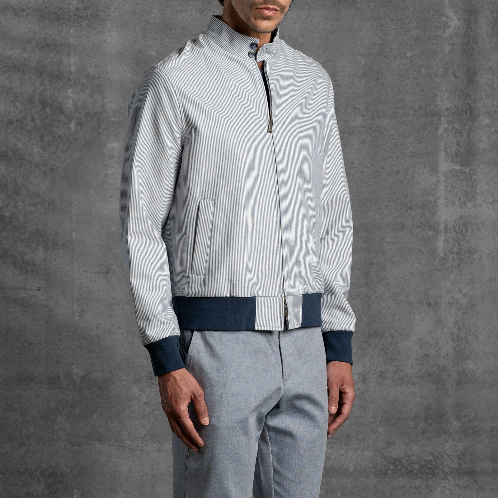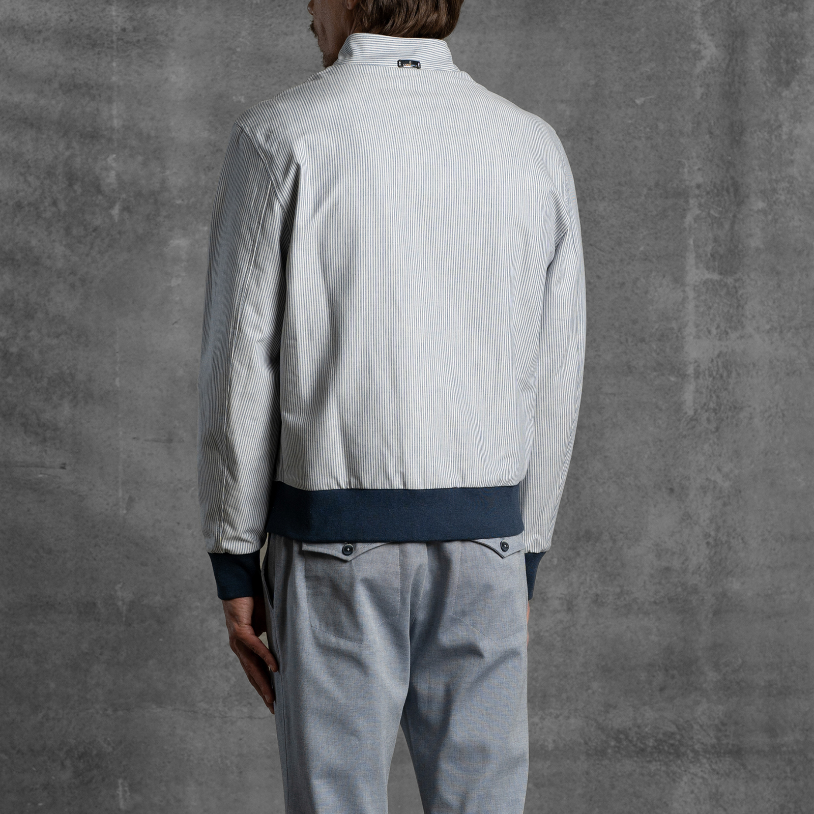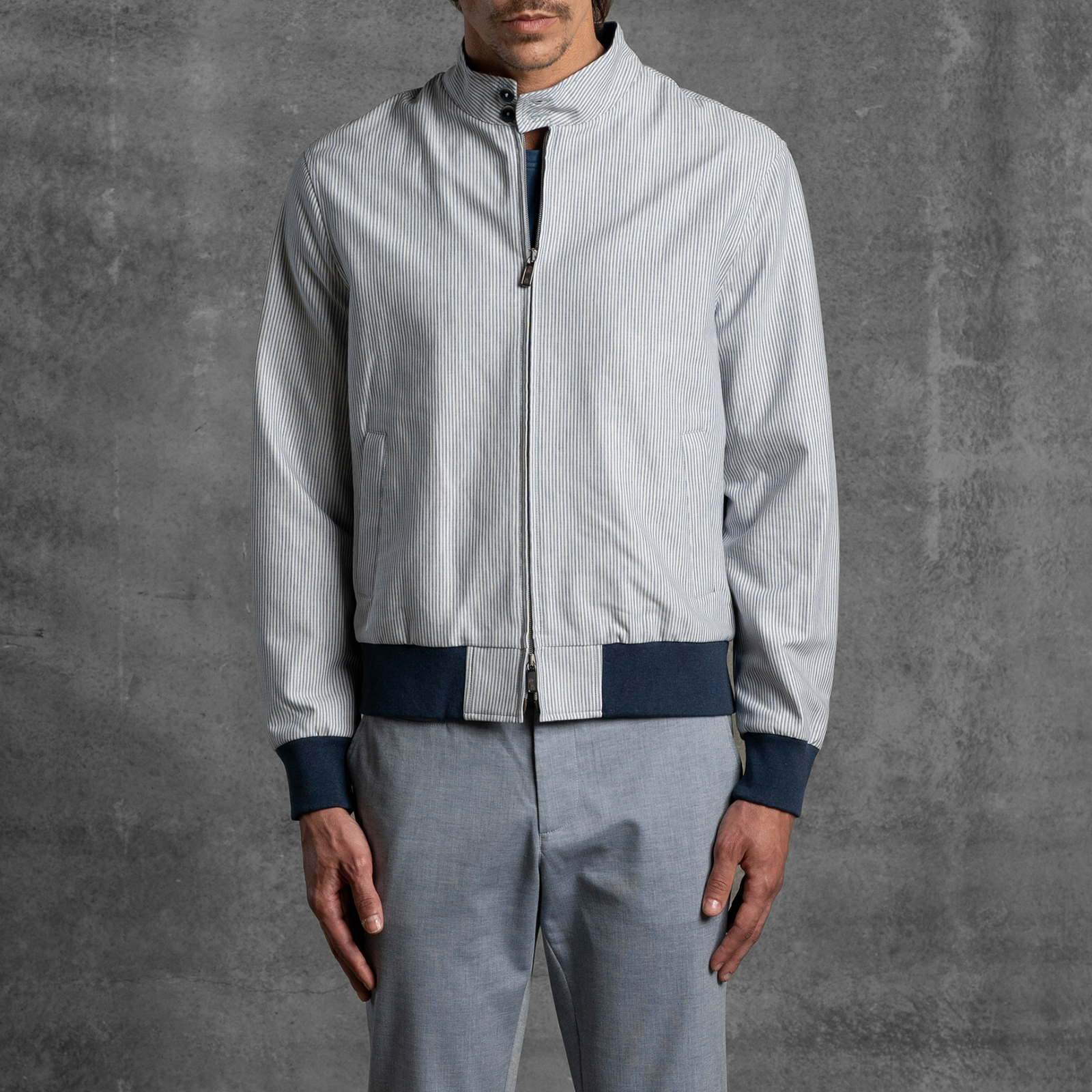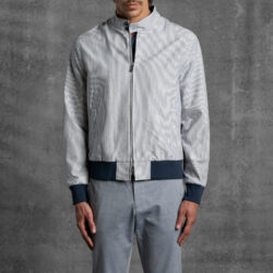 Cool and trendy bomber jacket crafted from a slightly stretchy cotton fabric with a clean, structured look that enhances comfort and maintains a sharp silhouette. The interior is lined in pure lightweight cotton jersey, chosen for its natural breathability and soft, airy feel. Refined cotton ribbed knit edging frames the design, while the logoed double‑slider zipper adds a functional and distinctive touch. Two hip pockets and an inside chest pocket complete the piece, blending practicality with a modern, effortless attitude.