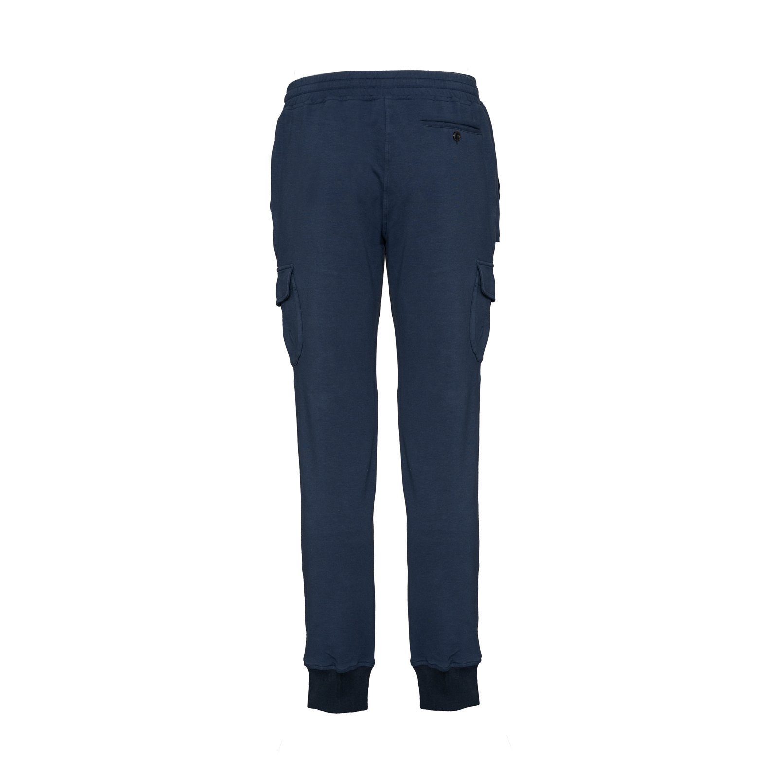 Cargo trousers with a versatile and contemporary design, crafted from soft garment-dyed cotton jersey with slight elasticity to ensure comfort and freedom of movement. They feature fine ribbed cotton knit cuffs at the hems, two side pockets, two central leg pockets with flaps and logo buttons, as well as a back pocket with logo buttons. The elastic waistband is complemented by an adjustable drawstring with logo clips, offering a practical and customizable fit. The special eco-friendly dyeing process, inspired by traditional methods, completely eliminates the use of chemicals, giving the garment unique tones that highlight the fabric's quality and promote sustainable production. Perfect for achieving a casual yet polished look.