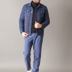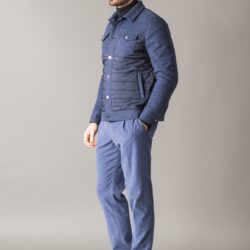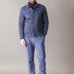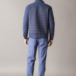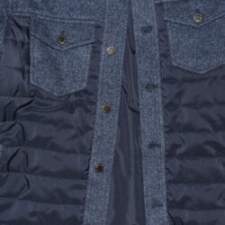 Padded jacket with a sporty-chic style, crafted from premium, warm brushed melange wool end cotton fabric. The front is enhanced with quilted windproof nylon inserts for added protection. It features two side pockets and two chest flap pockets with branded metal buttons. The front closure is finished with matching metal buttons. The padding, made from Climalight recycled polyester wadding, ensures warmth and lightness. The interior is lined with recycled windproof polyester. A metal logo plaque decorates the back of the collar.