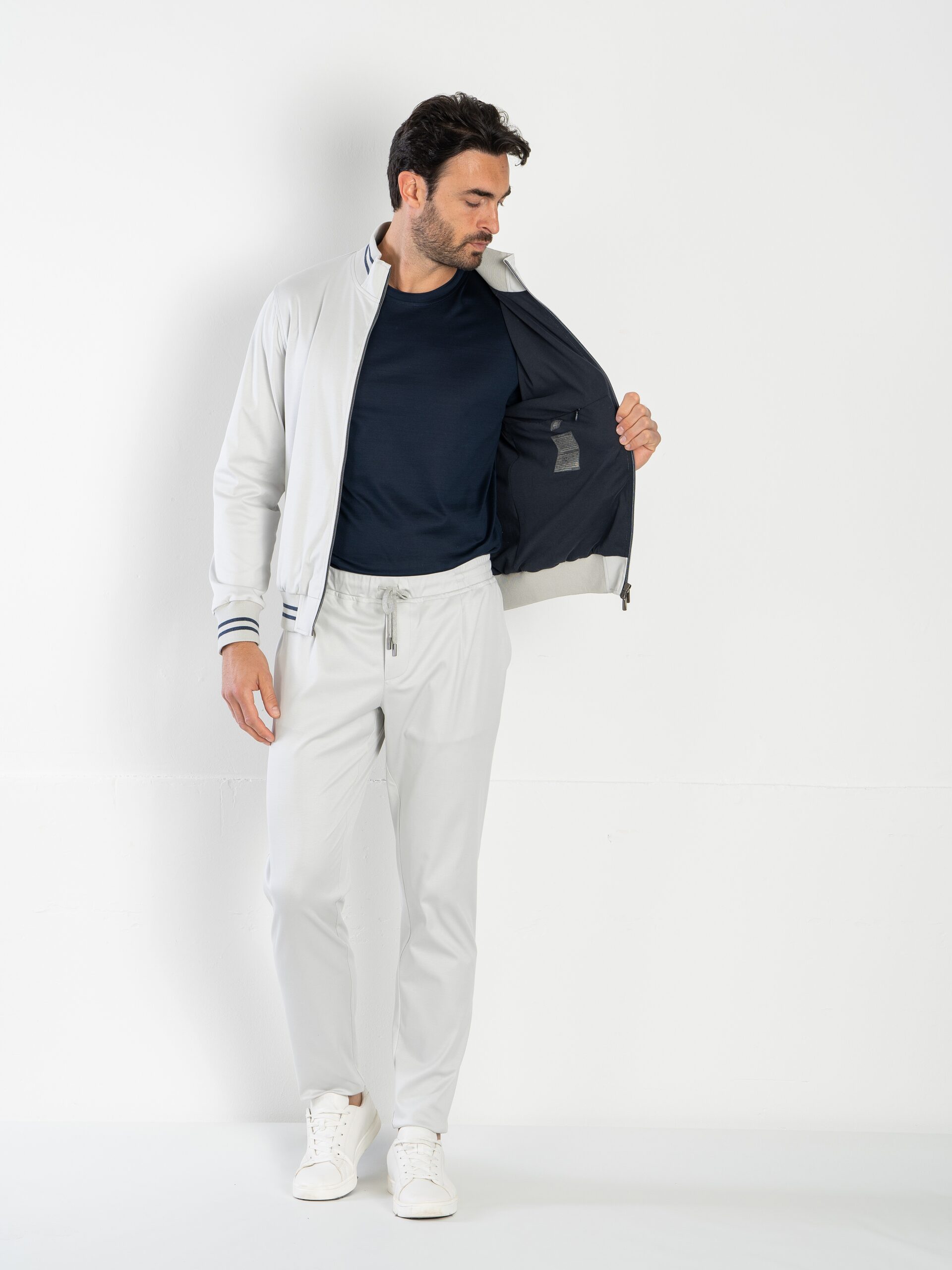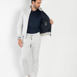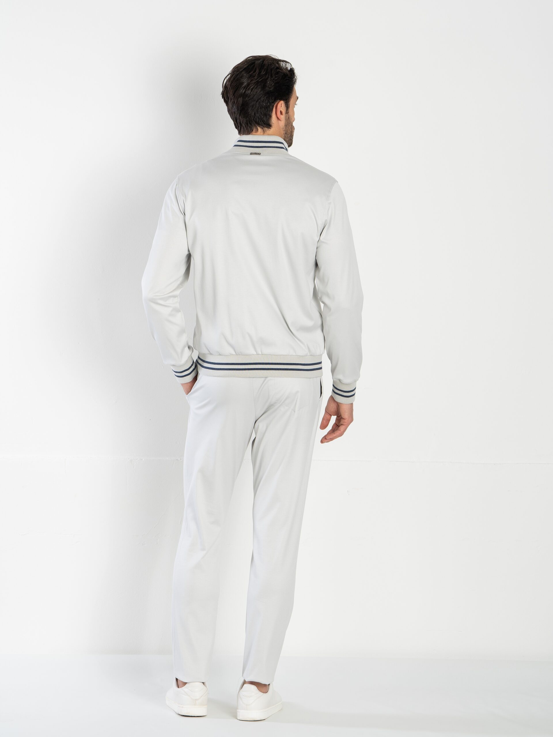 Casual-chic set composed of a full-zip sweater and pantacoulisse, made from solid-colored soft Supima cotton jersey, selected for its exceptional softness, lightweight feel, and breathable comfort. The full-zip sweater features a front double-logo puller zip, fine ribbed cotton-knit trims with contrast double stripes on the collar, waistband, and cuffs. It includes two side pockets and a lightweight pure cotton jersey lining for a cozy feel. The pantacoulisse are defined by front pleats for a more structured fit, two side pockets, a rear pocket with logoed buttons, and an elastic waistband with adjustable drawstring and logoed clips. A refined and versatile set, perfect for leisure time or polished casual occasions.