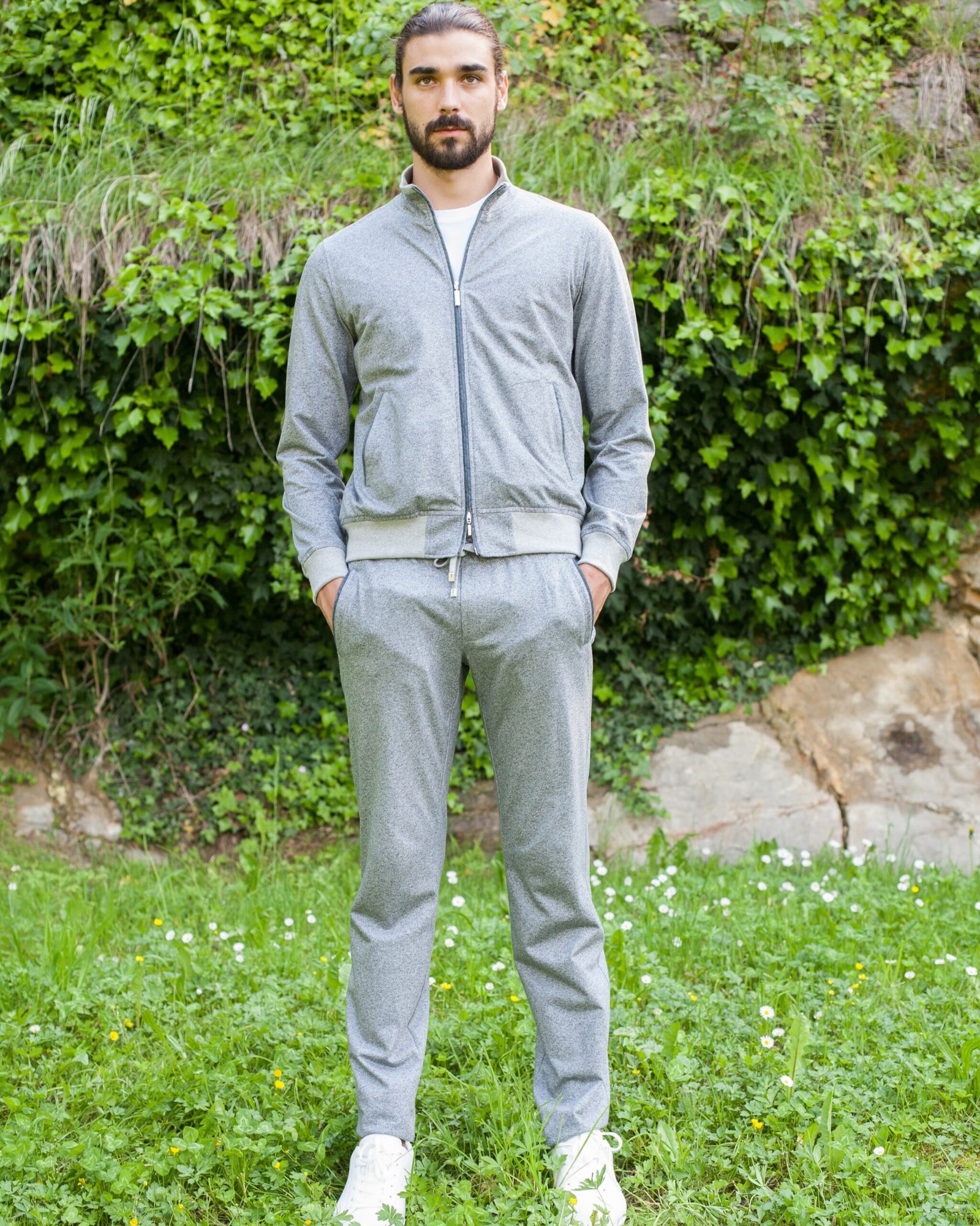 Sport-chic set crafted in Light-fleece pure long-fiber cotton dyed in yarn with a moulinée effect, a premium fabric that combines softness, lightness, breathability, and wrinkle resistance to provide maximum comfort and a flawless fit. The full-zip sweater stands out with alcantara details that add a touch of elegance, a front zipper with a double branded slider, finely ribbed cotton knit cuffs and edges, two practical side pockets, and an inner pocket. The lining in Light-jersey pure gray mélange cotton completes the garment, ensuring superior comfort. The matching drawstring pants combine style and functionality with two zippered side pockets, two back pockets with branded buttons, and an adjustable waistband with elastic and drawstring featuring branded clips.
