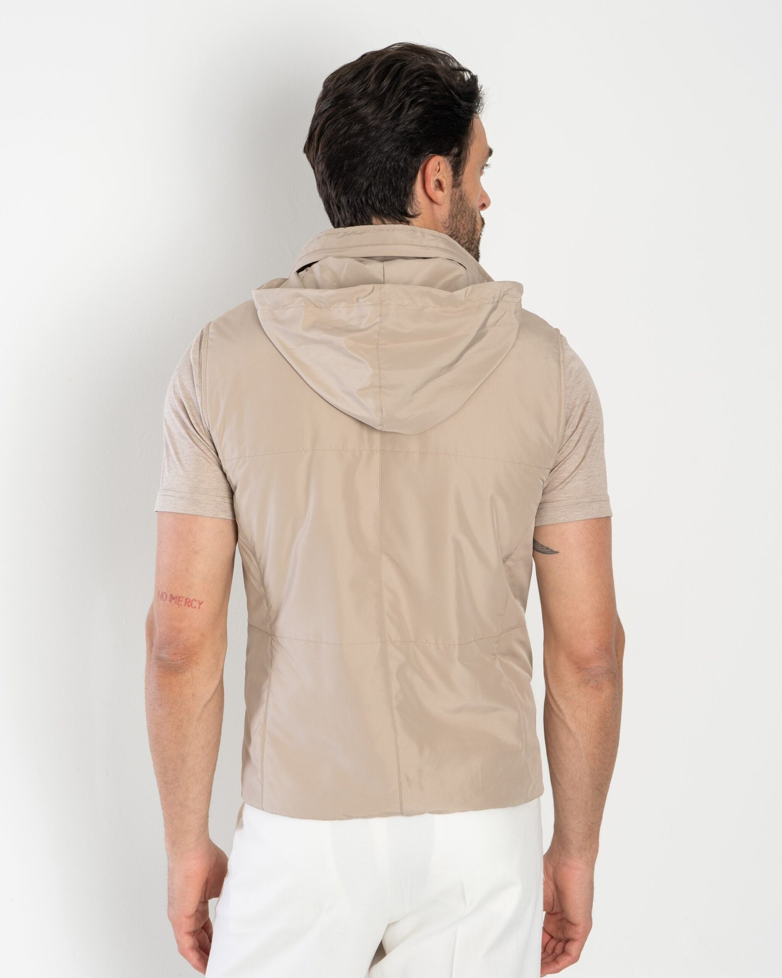 Casual and sporty quilted rainproof nylon gilet, with hood inside the collar, light pure cotton jersey lining, two-way front zip, two zipped pockets plus third inside breast pocket, metal logo plaque on back neck, padded with a very light wadding.