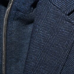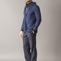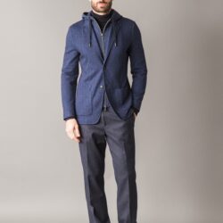 Smart and chic hoody blazer crafted from precious and warm Chevron-patterned Woolcot fabric. It features an inner hooded insert with zip and double logoed pullers, adjustable drawstring with logoed stoppers, two side pockets, one chest pocket, and front closure with logoed buttons. The interior is lined in cupro for enhanced breathability and comfort, while hand-finished stitching highlights the garment’s artisanal quality, ideal for a relaxed yet refined look.