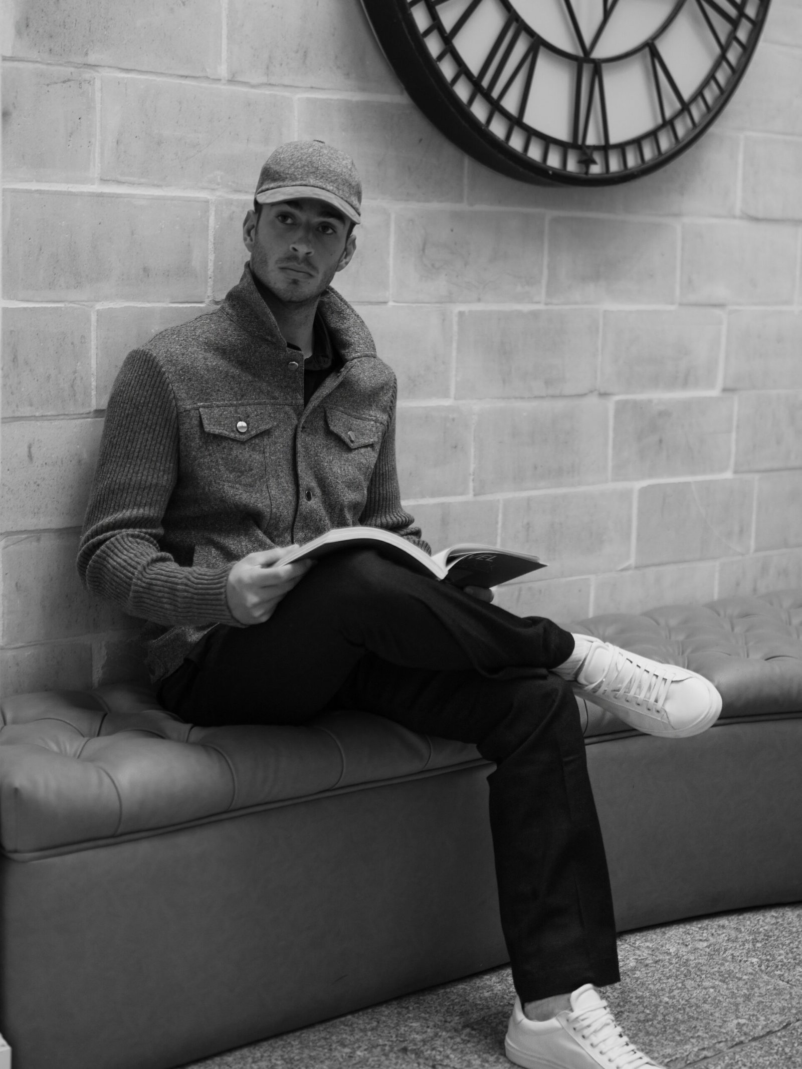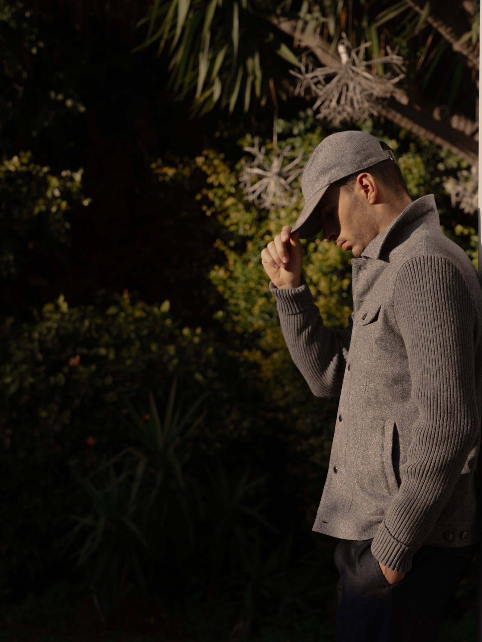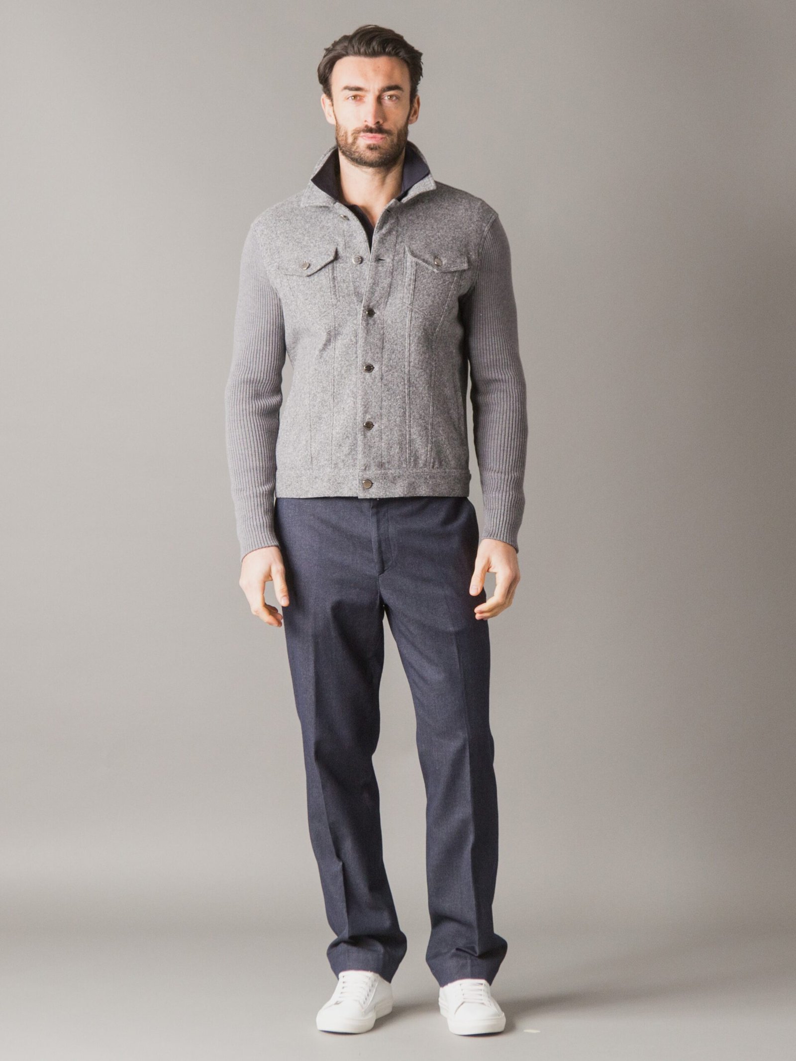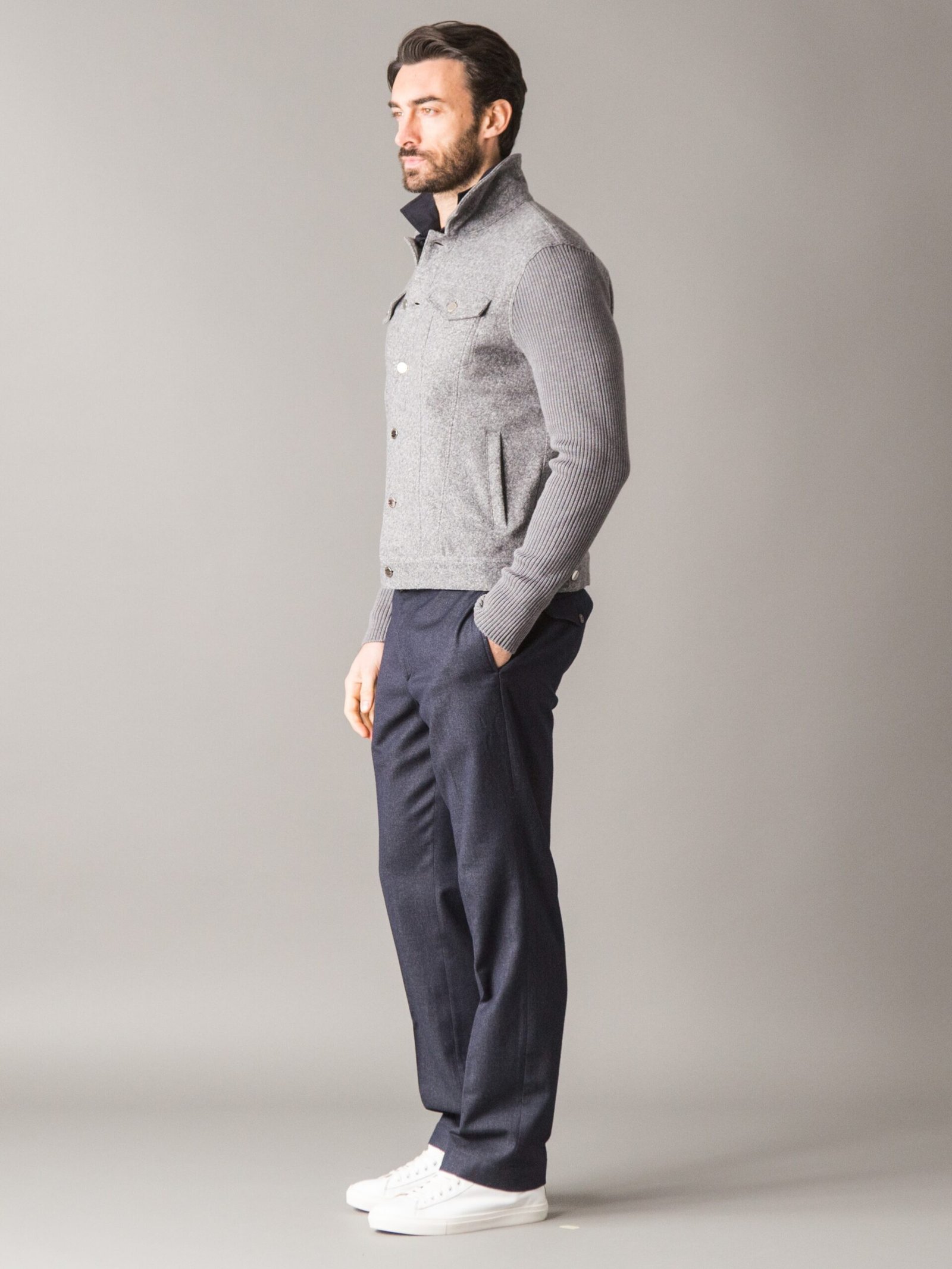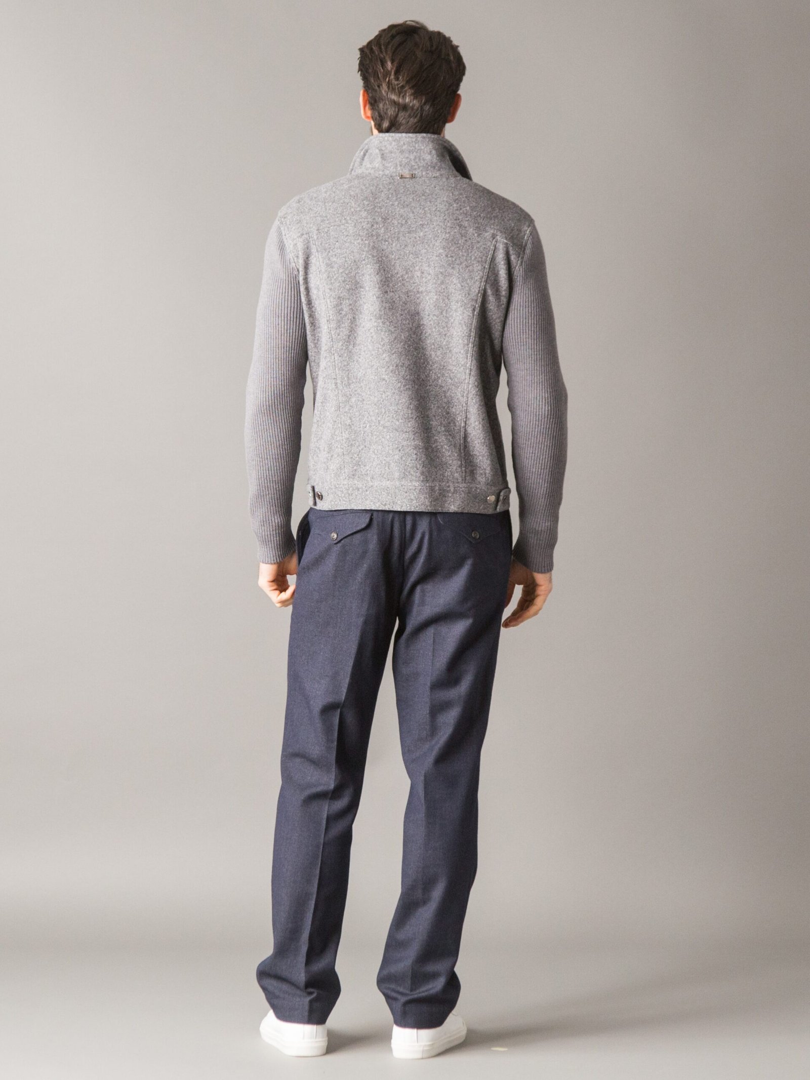Casual-chic jacket crafted from premium, warm felted melange wool-cotton fabric. The sleeves are made from smooth-knit pure Cashwool, offering an enveloping and refined comfort. It features two side pockets and two chest flap pockets with branded metal buttons. The front closure is finished with matching logo-engraved metal buttons, and the hem is adjustable for a personalized fit.