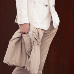 The fabric combines the softness and comfort of cotton, the natural lightness of linen and a touch of elastane to ensure elasticity