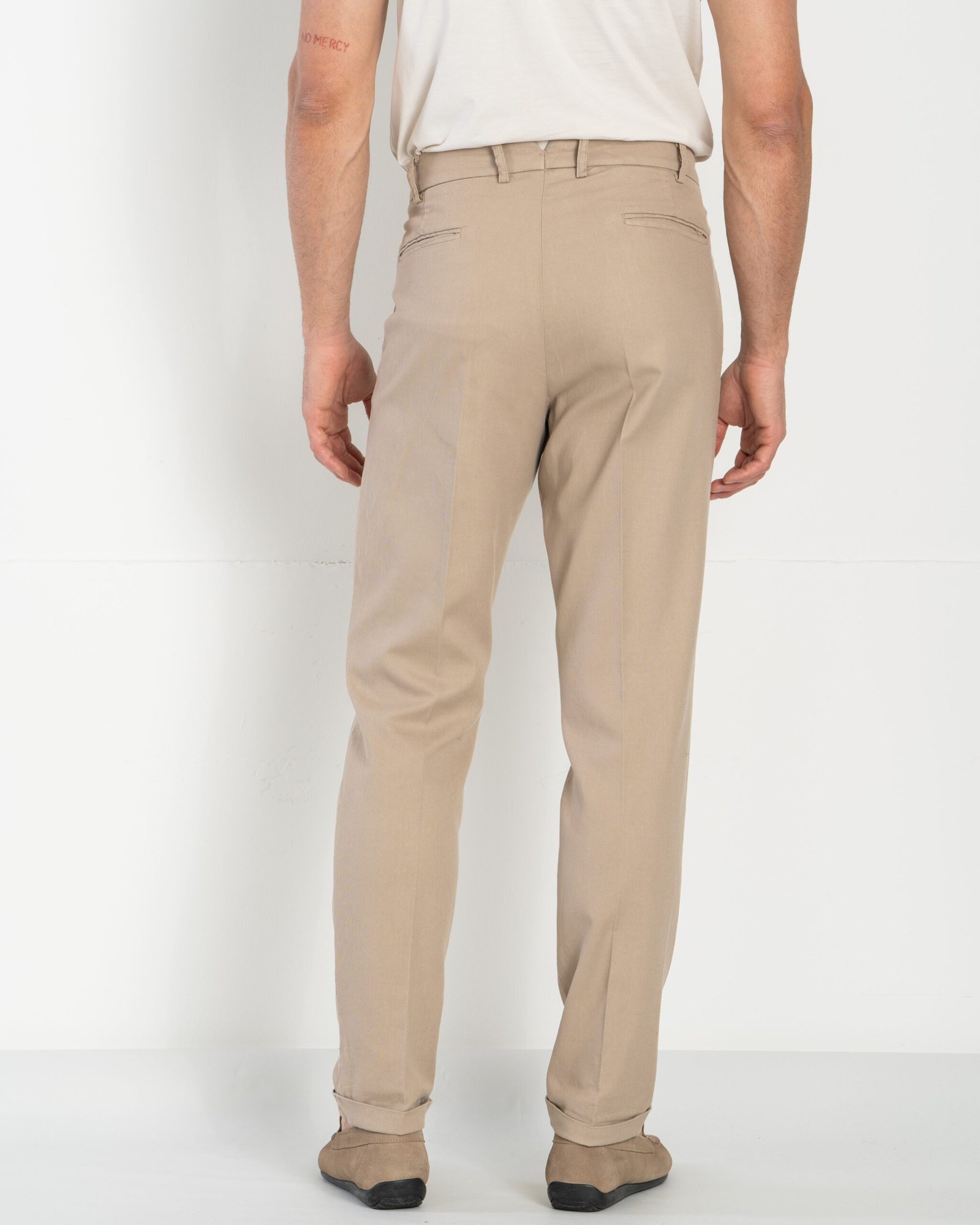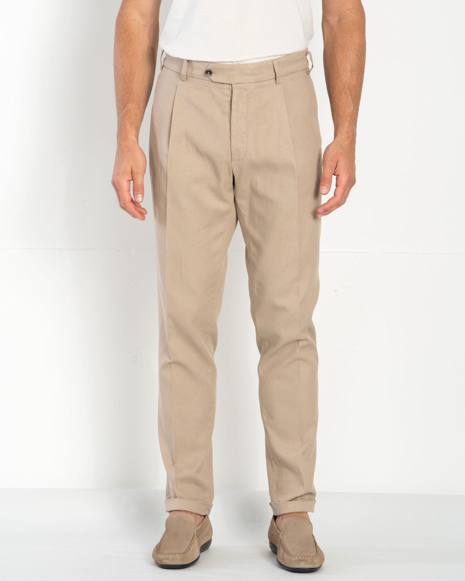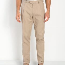 Pleated trousers made from a premium blend of cotton and linen, slightly elasticized to ensure comfort and freedom of movement. The garment-dyed fabric gives the trousers a refined and natural appearance. Featuring two side pockets and two back pockets with logoed buttons, they are finished with a cuffed hem for a touch of casual elegance. Thanks to their lightness and breathability, these trousers are ideal for embracing summer climates in style.