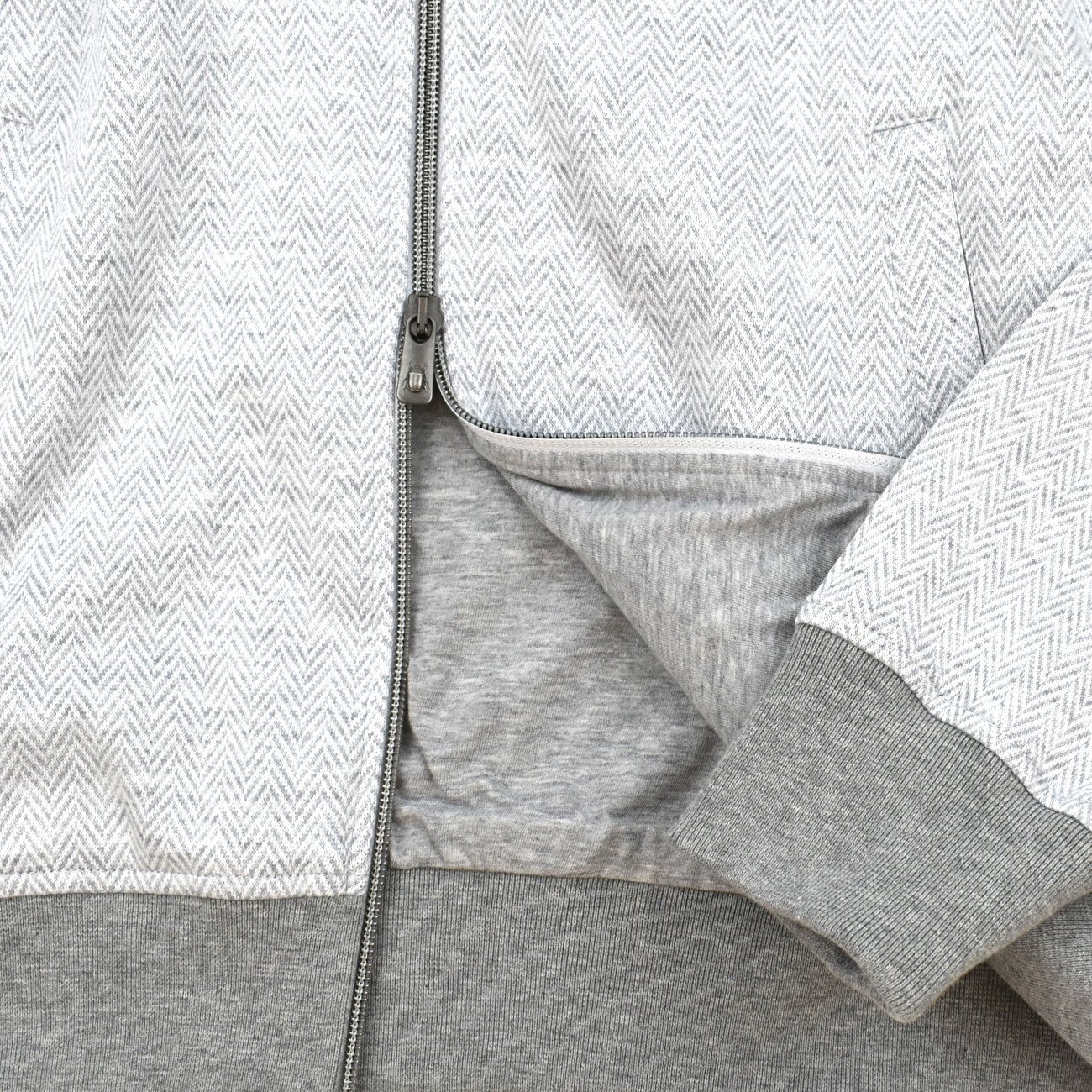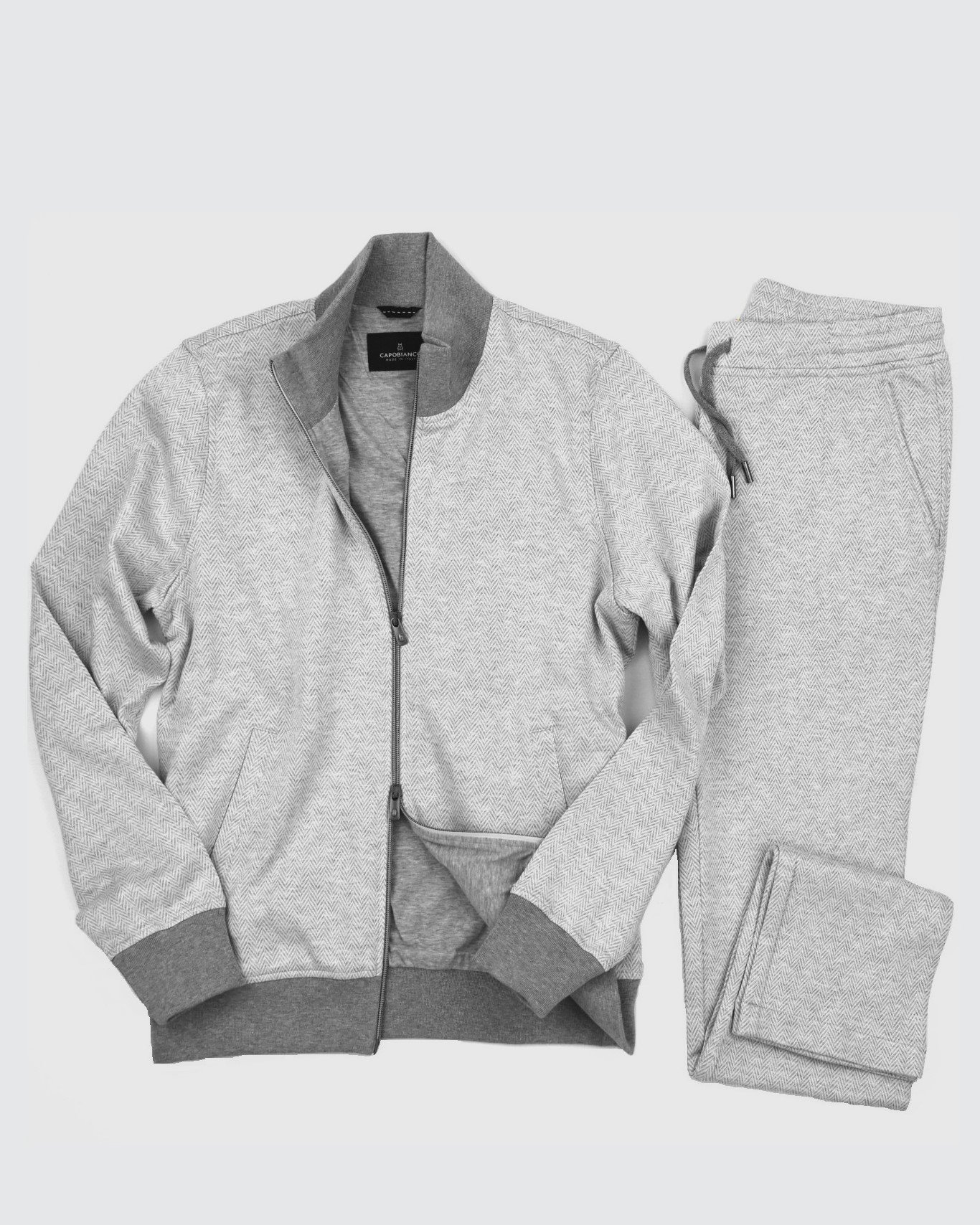 Leisure tracksuit, perfect for combining style and comfort on any occasion. Made from long-fiber pure cotton, yarn-dyed with a refined chevron mélange pattern, it ensures softness and lightness. The jacket features a double-logo zipper, knitted cotton ribbing for the collar, waistband, and cuffs, as well as two side pockets and a practical internal chest pocket. Its lightweight pure cotton jersey lining provides optimal comfort. The trousers include two side pockets and a back pocket with logo buttons, ensuring practicality. The elastic waistband with a drawstring and logo clips guarantees a perfect and adjustable fit. An ideal ensemble for walks and moments of relaxation, effortlessly blending luxury with practicality and impeccable style.
