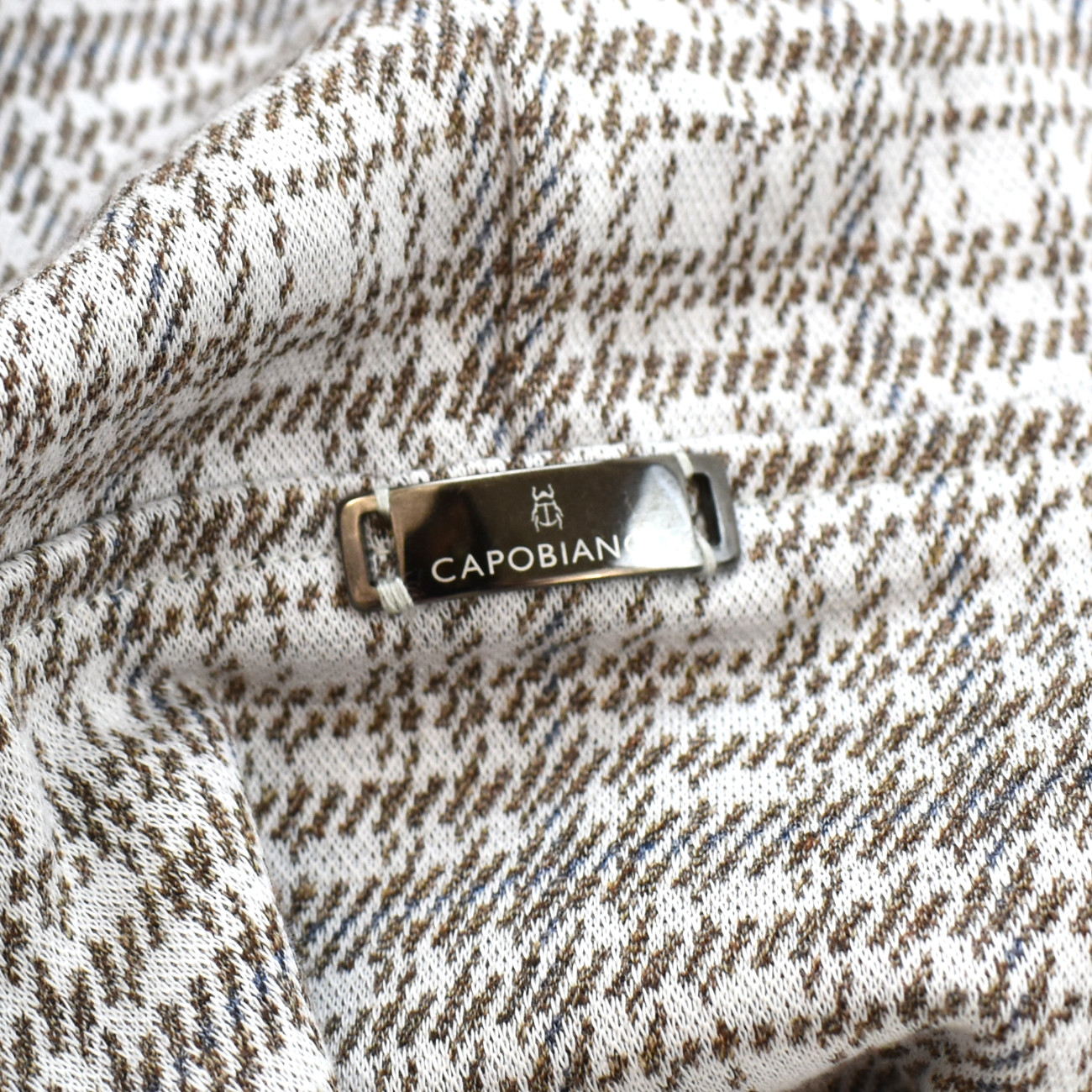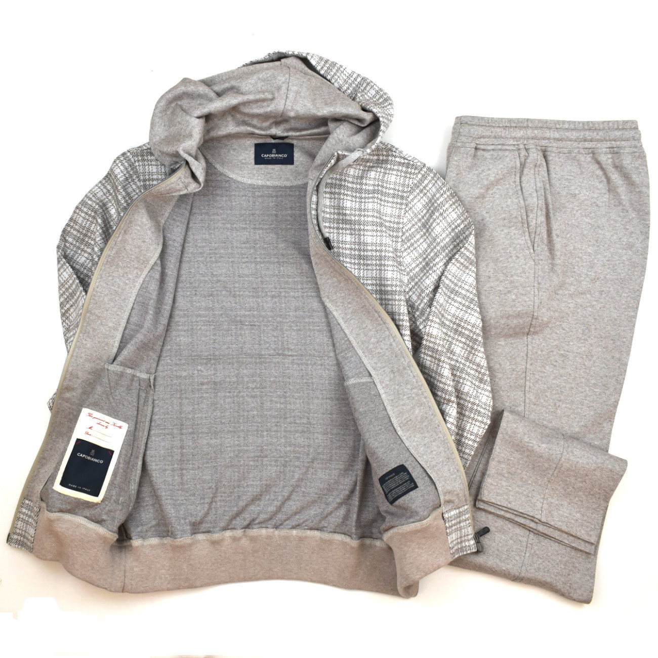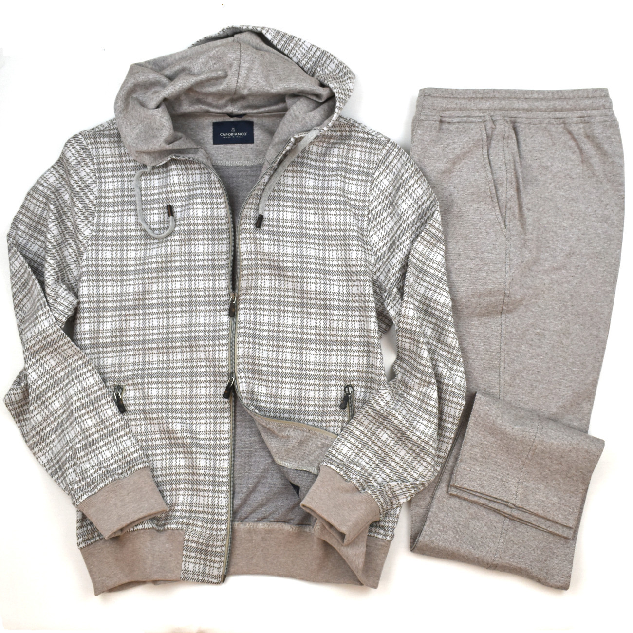 Leisure suit with a refined and comfortable design crafted from premium long fiber cotton yarn dyed for a two tone madras effect. The full zip sweatshirt features a double branded zipper pull side pockets with branded zippers and an inner chest pocket. The adjustable hood with a drawstring and branded clips along with the ribbed waistband and cuffs ensures a flawless fit. The Luxury pants made from long fiber cotton with a two tone mélange Oxford effect feature stitching details on the front legs and a cuffed hem. Functionality meets style with side pockets a back pocket with branded buttons and an adjustable waistband with a drawstring and branded clips. An elegant and versatile set perfect for everyday comfort.