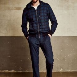 Tracksuit set composed of a fancy-chic full-zip hoodie made of Woolcot Black-Watch fabric. It features merino wool knitted ribbing for the cuffs and hem. The hoodie has two side pockets, an internal chest pocket, a front zip with a double logo puller, and a drawstring hood with a logo stopper in Zama. A metal logo plate decorates the back of the collar, while the internal lining in pure cotton jersey ensures maximum comfort and the best absorption of body moisture. The pants are made of Woolcot fabric with a solid-colored pin-dot jacquard pattern. They feature two side pockets and one back pocket with logo buttons, an elastic waistband with a drawstring, and two logo-stamped metal stoppers for comfortable and customized adjustment.