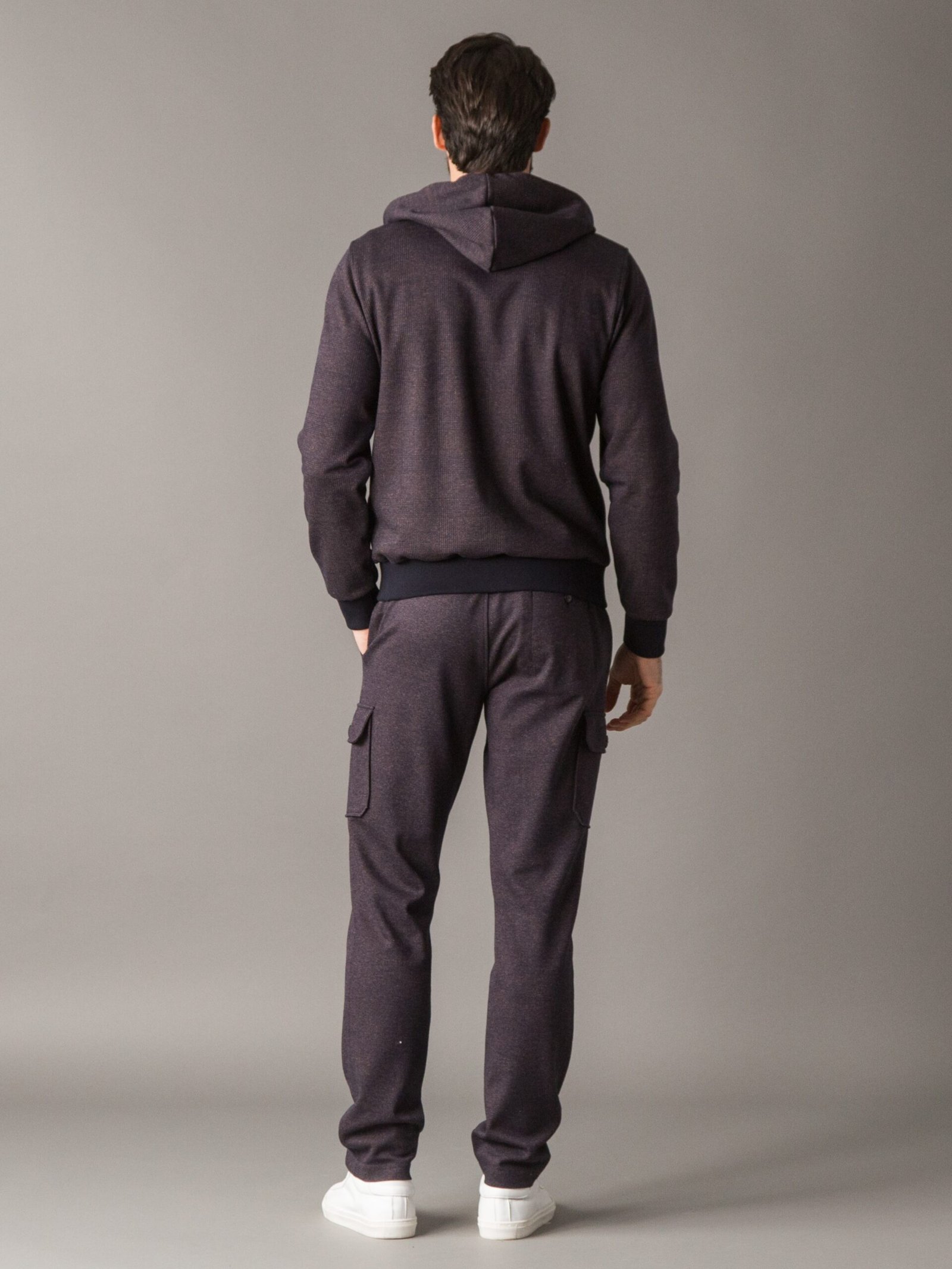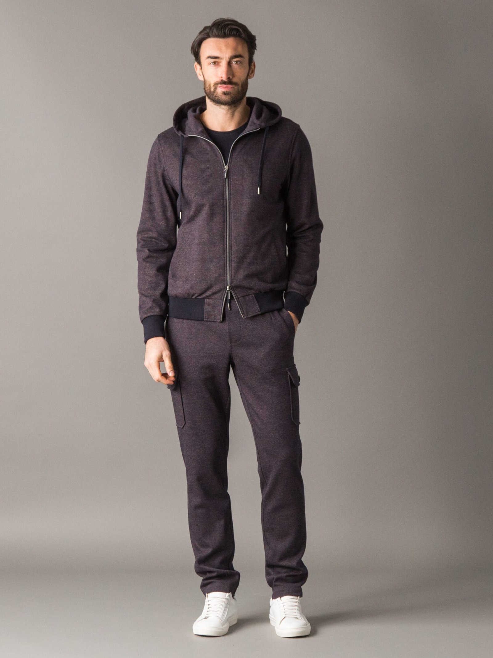 Elegant leisure tracksuit composed of a full-zip hooded sweatshirt and coordinating cargo pants. The sweatshirt is made from warm Woolcot fleece with a Prince of Wales pattern, lined with pure cotton jersey for effective moisture absorption. It features ribbed cotton knit trims at the hem and cuffs, a front zip with dual branded pullers, an adjustable hood with drawstring and branded stopper, two side pockets, and one internal pocket. The solid-colored cargo pants are equipped with two side leg pockets with branded buttons, two additional side pockets, and one rear pocket with a branded button. The elasticated waistband includes an adjustable drawstring with dual branded stoppers, combining refined comfort with bold style.