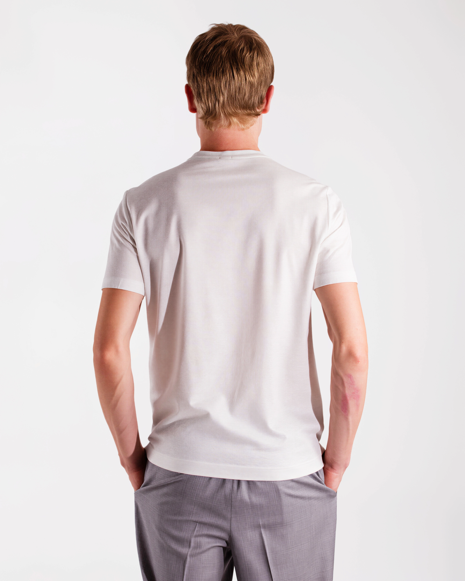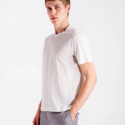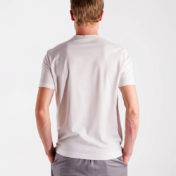Crafted from a fresh honeycomb jersey made of yarn‑dyed cotton, Lyocell and linen, this T‑shirt offers a light, natural feel with excellent breathability and a soft touch, making it ideal for warm days. The clean design is enhanced by two small side slits at the bottom and a visible logo label, adding a subtle contemporary detail. A versatile and refined piece, perfect for understated summer elegance.