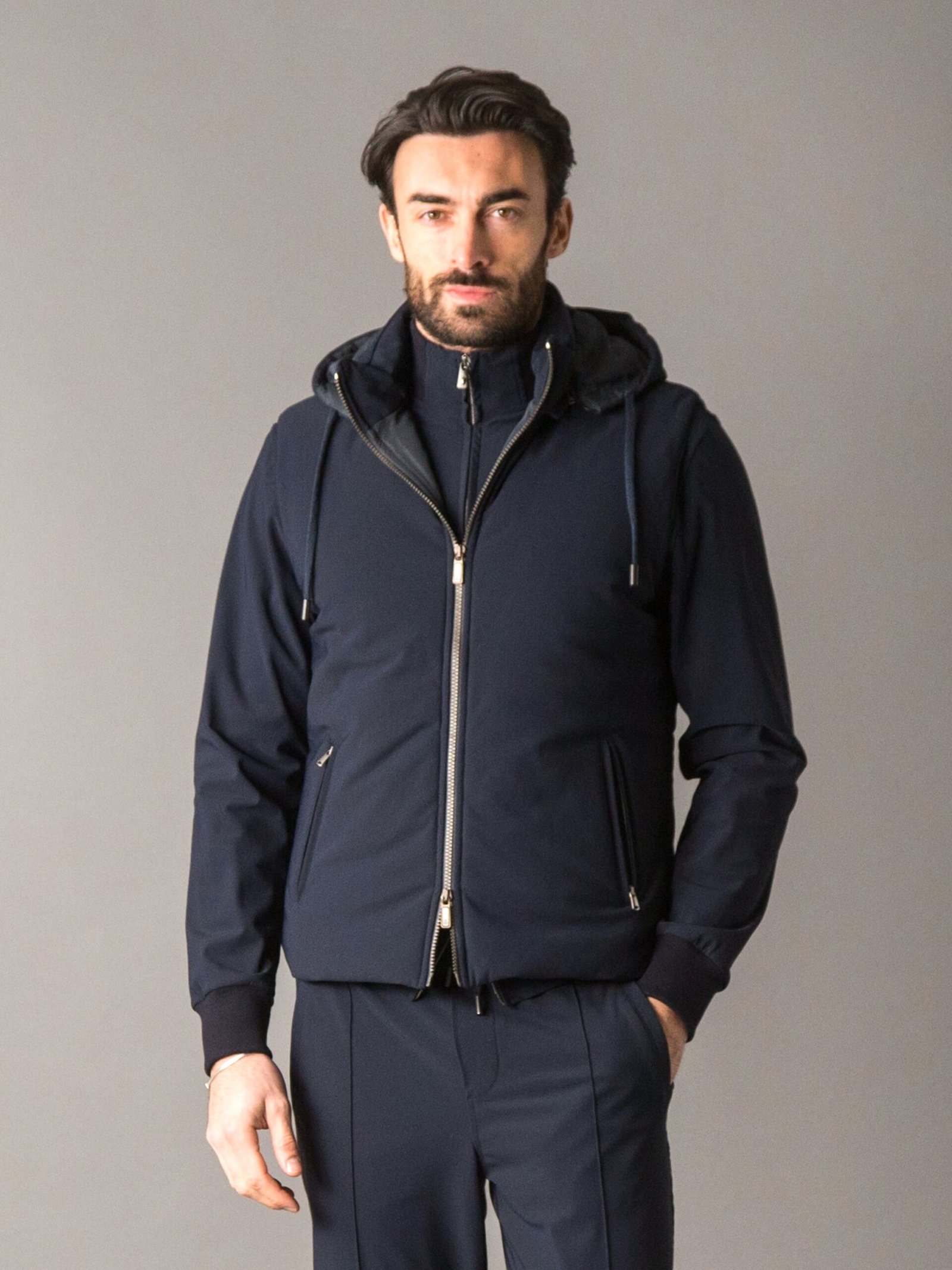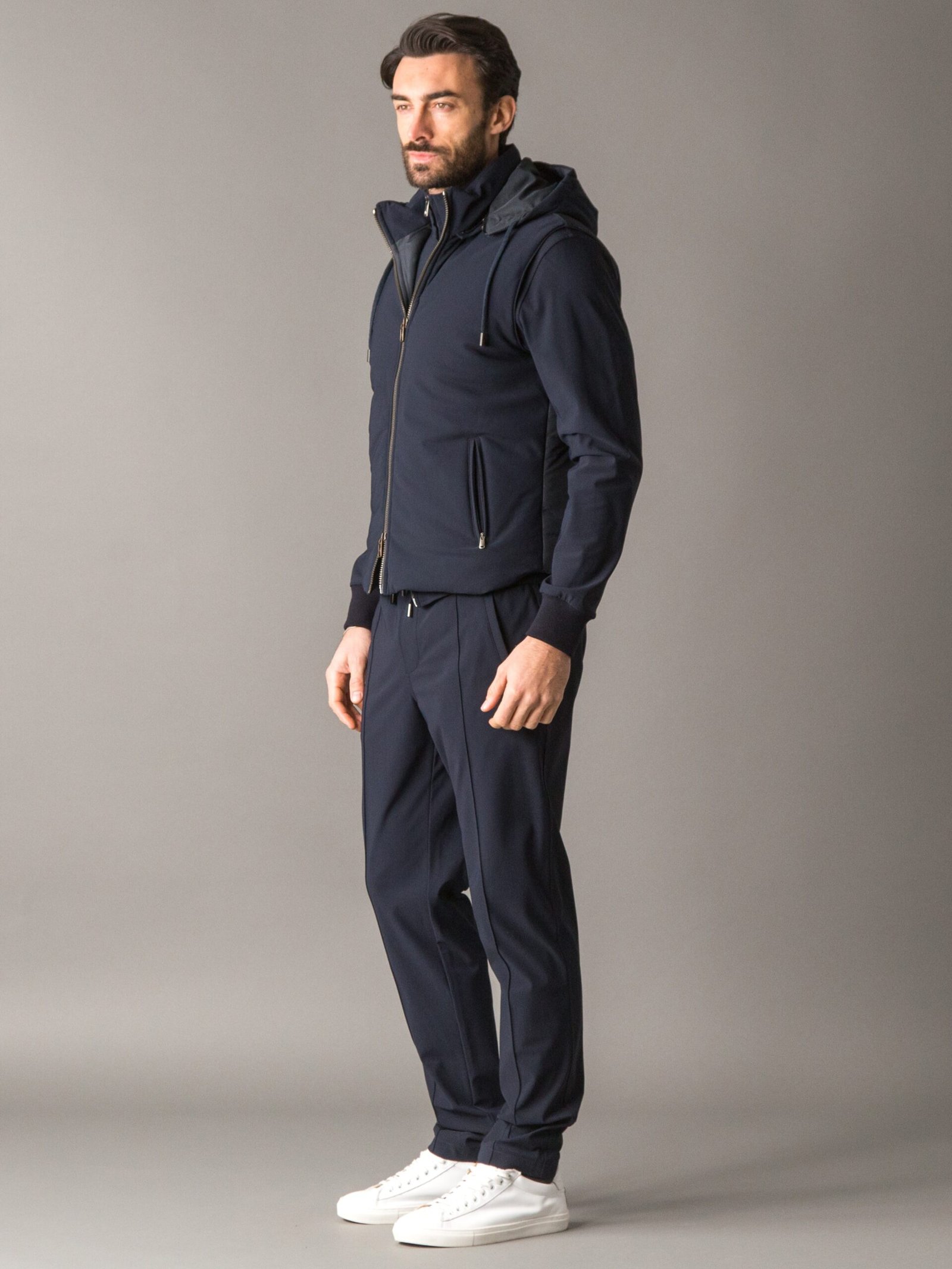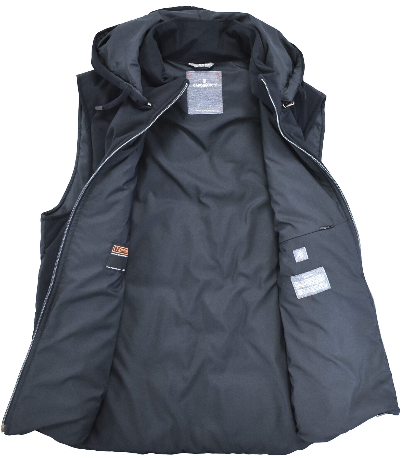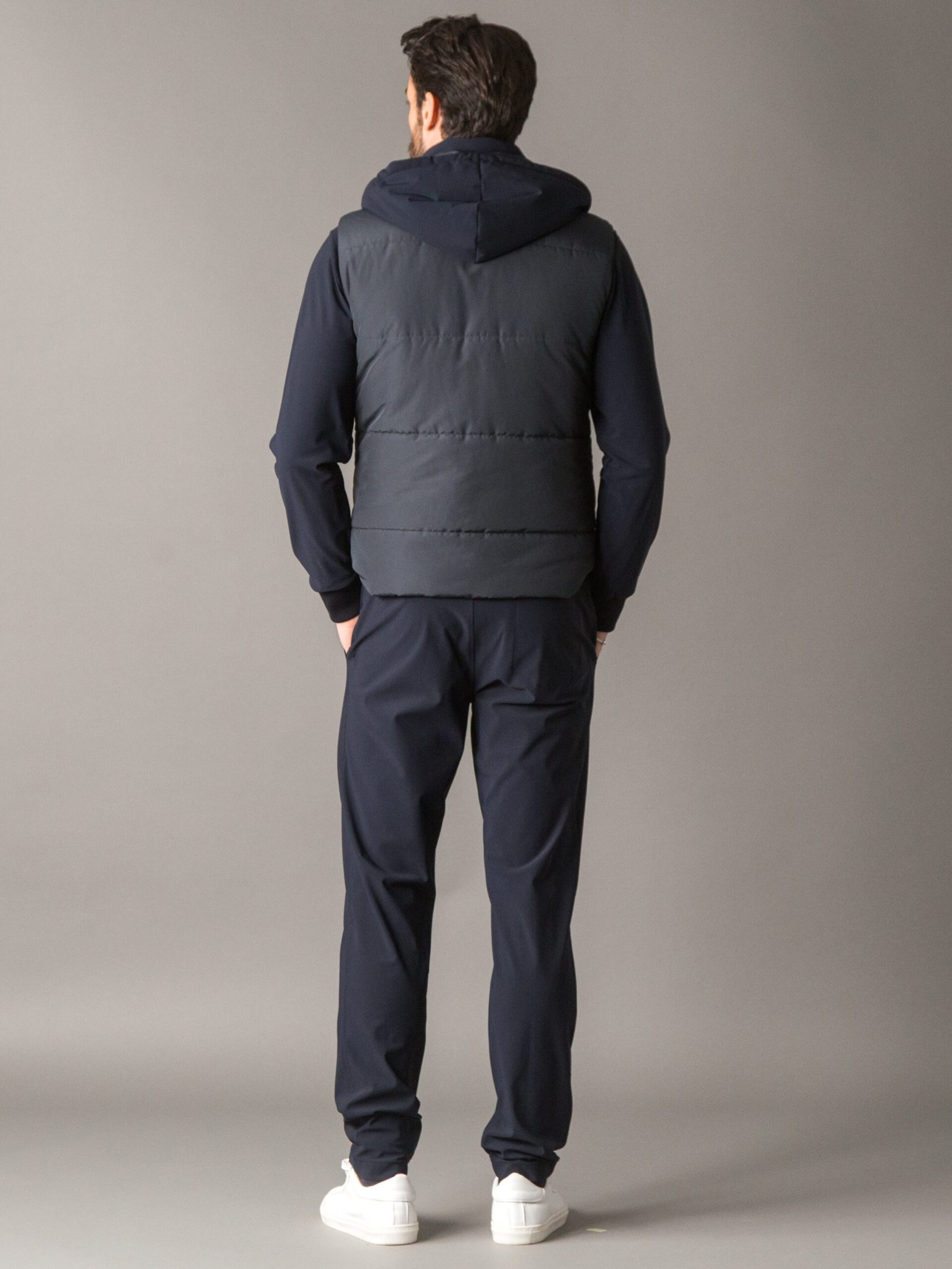 Casual-Tech vest with detachable hood, crafted from wrinkle-resistant stretch polyester microfiber designed to provide comfort and freedom of movement. The back and inner lining are made of windproof polyester, while the eco-friendly recycled polyester wadding offers warmth and lightness. The front closure features a zip with dual branded pullers, and two side zip pockets with branded zip pulls add convenience. A metal logo plaque decorates the back of the collar.