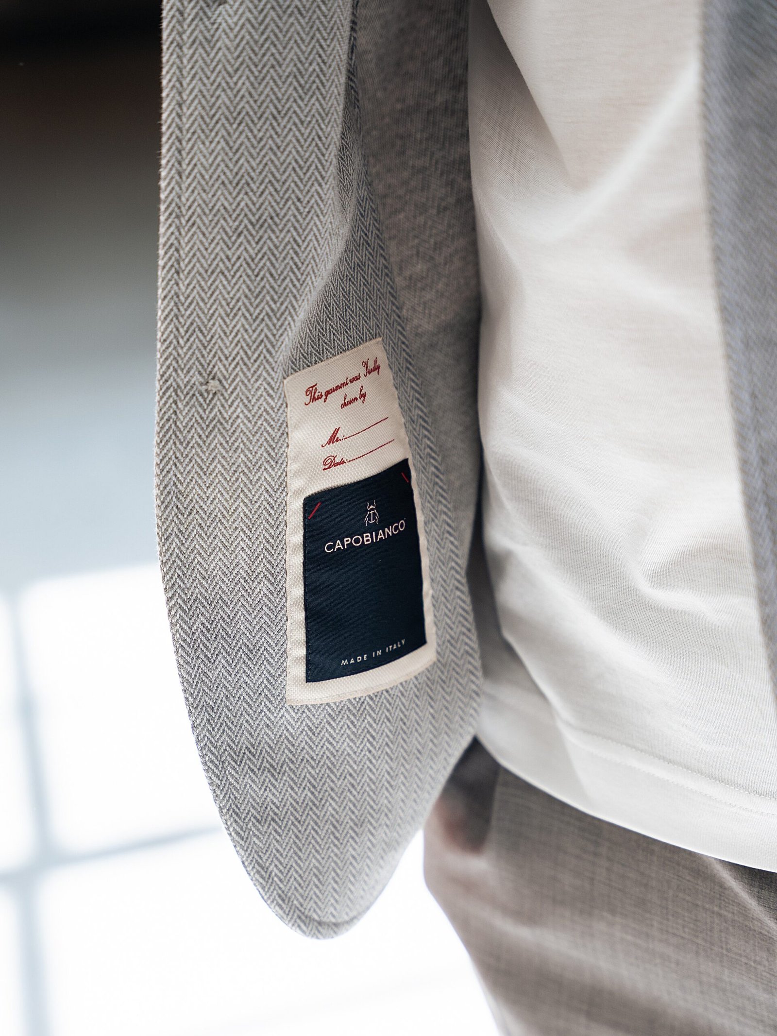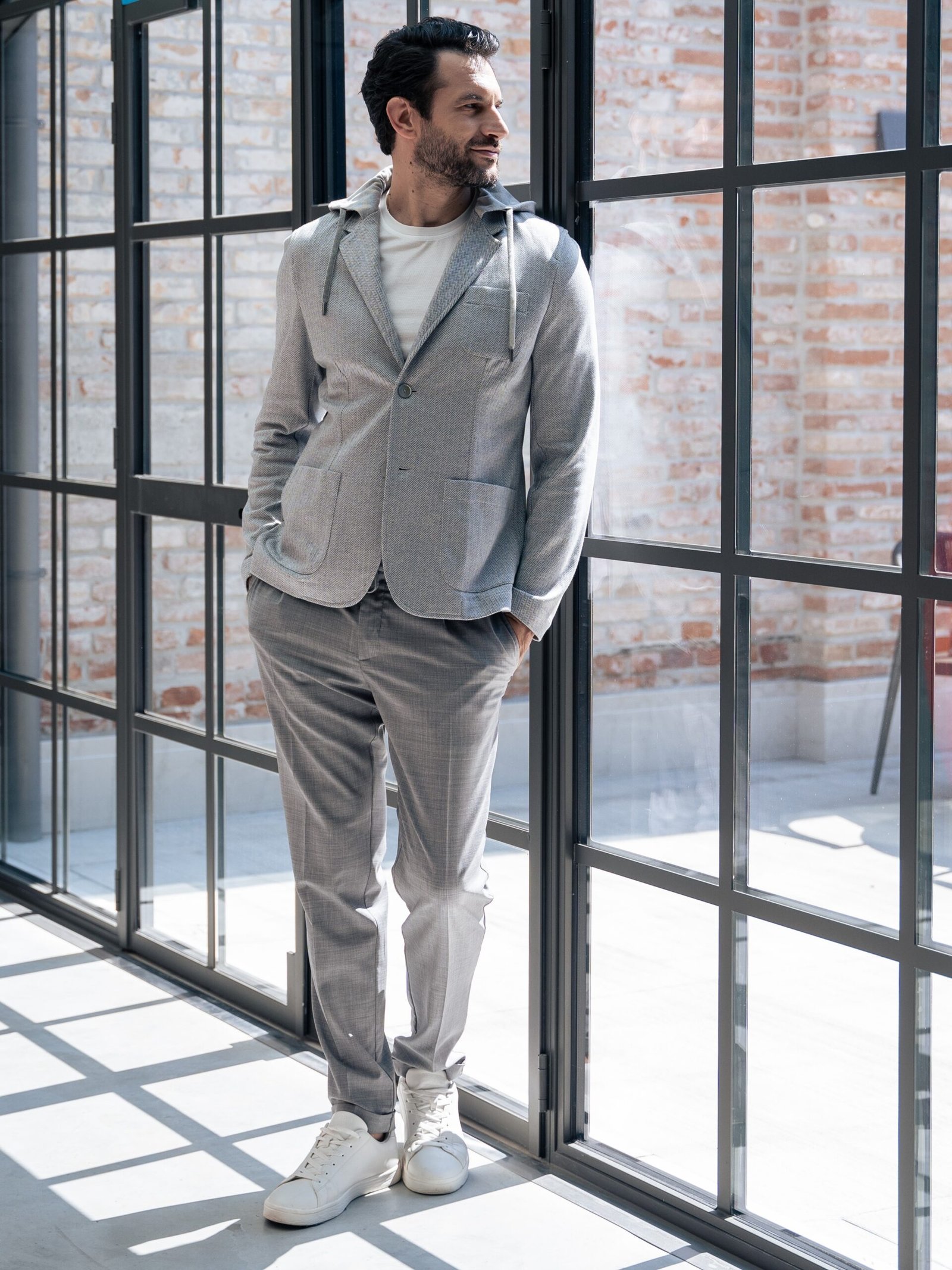 Trendy and comfortable hoody blazer made from yarn-dyed pure Supima cotton soft jersey with a chevron design, known for its refined texture and durability. The informal look features two patch pockets on the hips, a breast pocket, a hood with adjustable drawstrings and logo-detailed rope ends, and two logoed buttons on the front. A versatile piece that blends the structure of a blazer with the ease of a sweatshirt, ideal for relaxed sophistication.