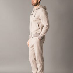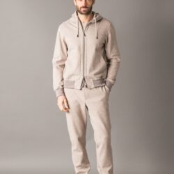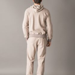 Leisure chic tracksuit set crafted from a precious and ultra soft melange Woolcot fabric, appreciated for its smooth hand feel, the natural breathability of cotton and the thermal comfort of wool. The full zip sweatshirt features rib knit cuffs and hem, a hood drawstring enriched with a branded stopper, two side pockets and a metal logo plaque applied on the back of the collar. The pants include two side pockets and a back pocket with branded buttons. The elastic waistband, combined with a drawstring with branded double stoppers, ensures a personalized and comfortable fit. A thoughtfully detailed set, ideal for enjoying leisure time with style and well being.