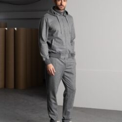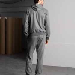 This elegant and chic tracksuit set consists of a full-zip hoodie and matching pants, crafted from premium fabrics that guarantee comfort and style. The full-zip hoodie is made from soft and warm brushed melange fabric, offering a pleasant feel and a refined look. It features rib-knit cotton for the waistband, cuffs, and collar. The hoodie has two side pockets and an internal pocket for added practicality, a full-zip front with double logoed pullers, and a drawstring hood with a logo stopper. The pure cotton jersey lining effectively absorbs body moisture, ensuring all-day comfort. A metal logo plaque on the back of the collar adds a distinctive touch. The casual and chic pants are made from warm and soft brushed chevron fabric. They feature two side pockets and a back pocket with logoed buttons. The elastic waistband and drawstring with two logoed stoppers ensure a personalized and comfortable fit.
