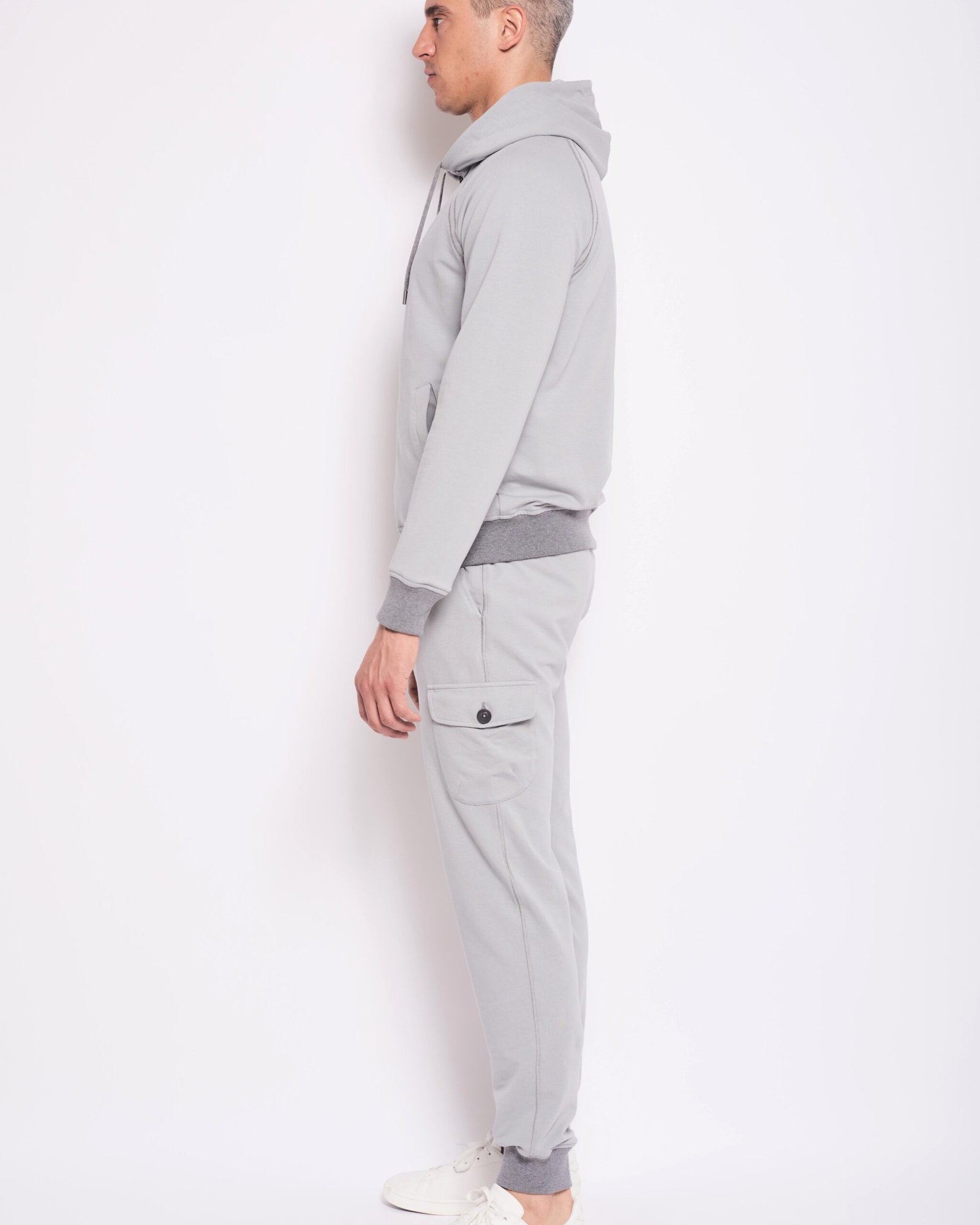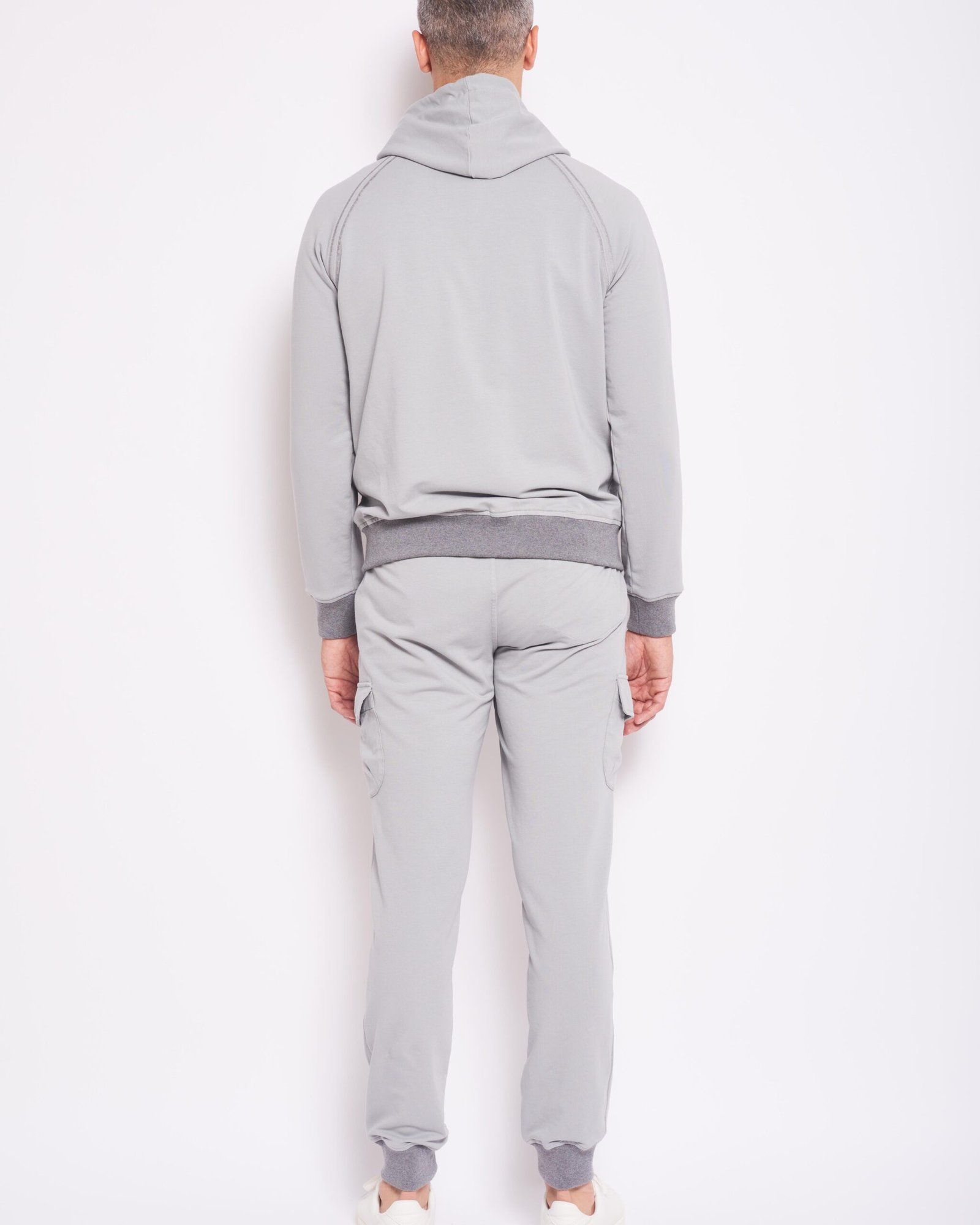 Set consisting of a fresh and soft full-zip hoody and cargo pantacoulisse, both crafted from premium Soft Fleece in pure organic cotton with a slight stretch, ensuring superior comfort and a natural fit. The full-zip hoody is lined in yarn-dyed light jersey gray mélange, with coordinated trims also dyed in yarn. It features a double-slider branded zip, two side pockets, and an internal chest pocket. The adjustable hood with drawstring and branded clips ensures a perfect fit, while the raglan sleeves with decorative double stitching add a refined and distinctive touch. The cargo pantacoulisse blends functionality and style with its strategically placed pockets: two on the hips, two mid-leg with flap and branded buttons, and a back pocket with branded buttons. The elastic waistband with drawstring and branded clips provides an adjustable and comfortable fit, while the fine-ribbed cotton knit hem adds a sophisticated touch.