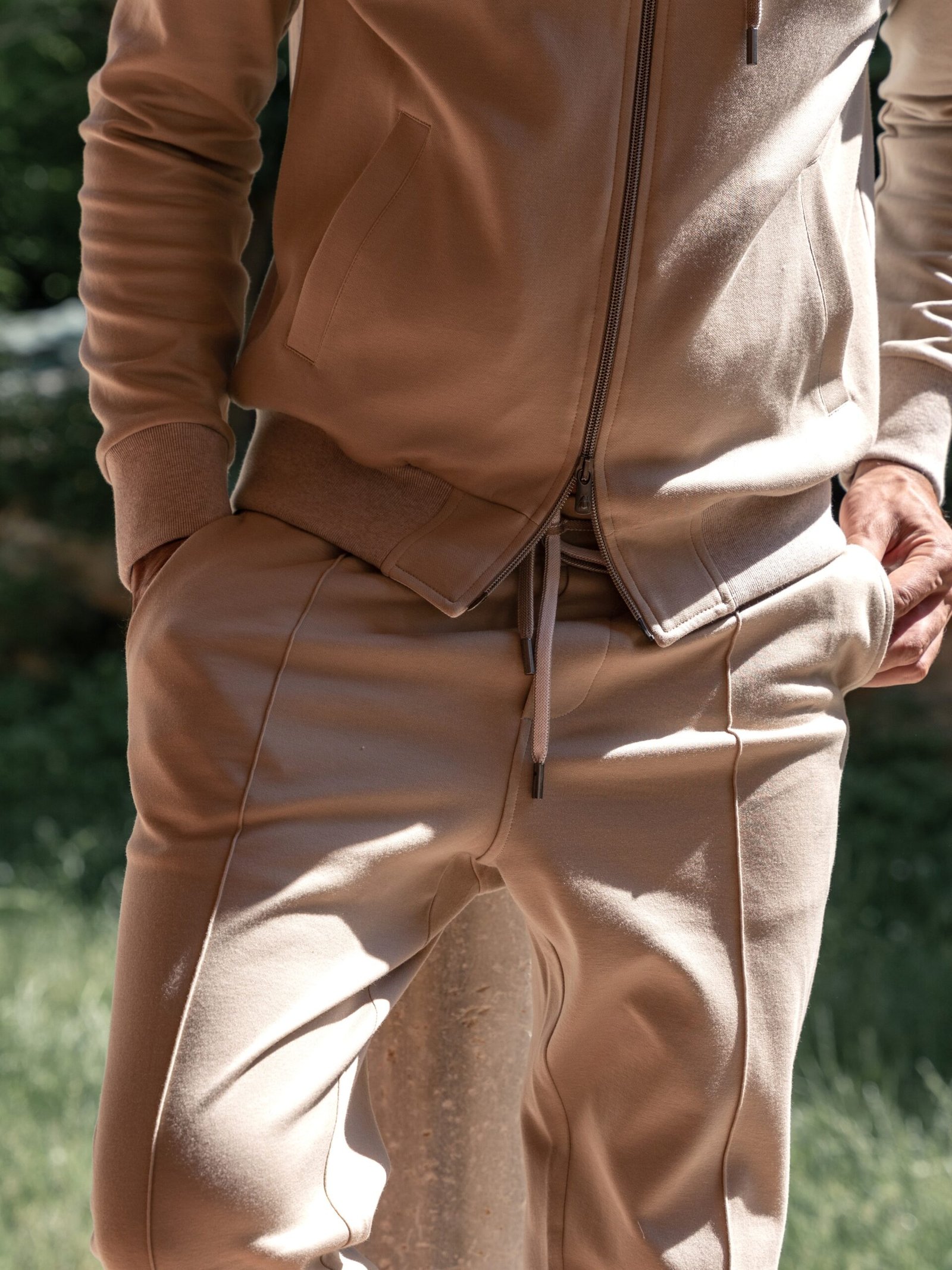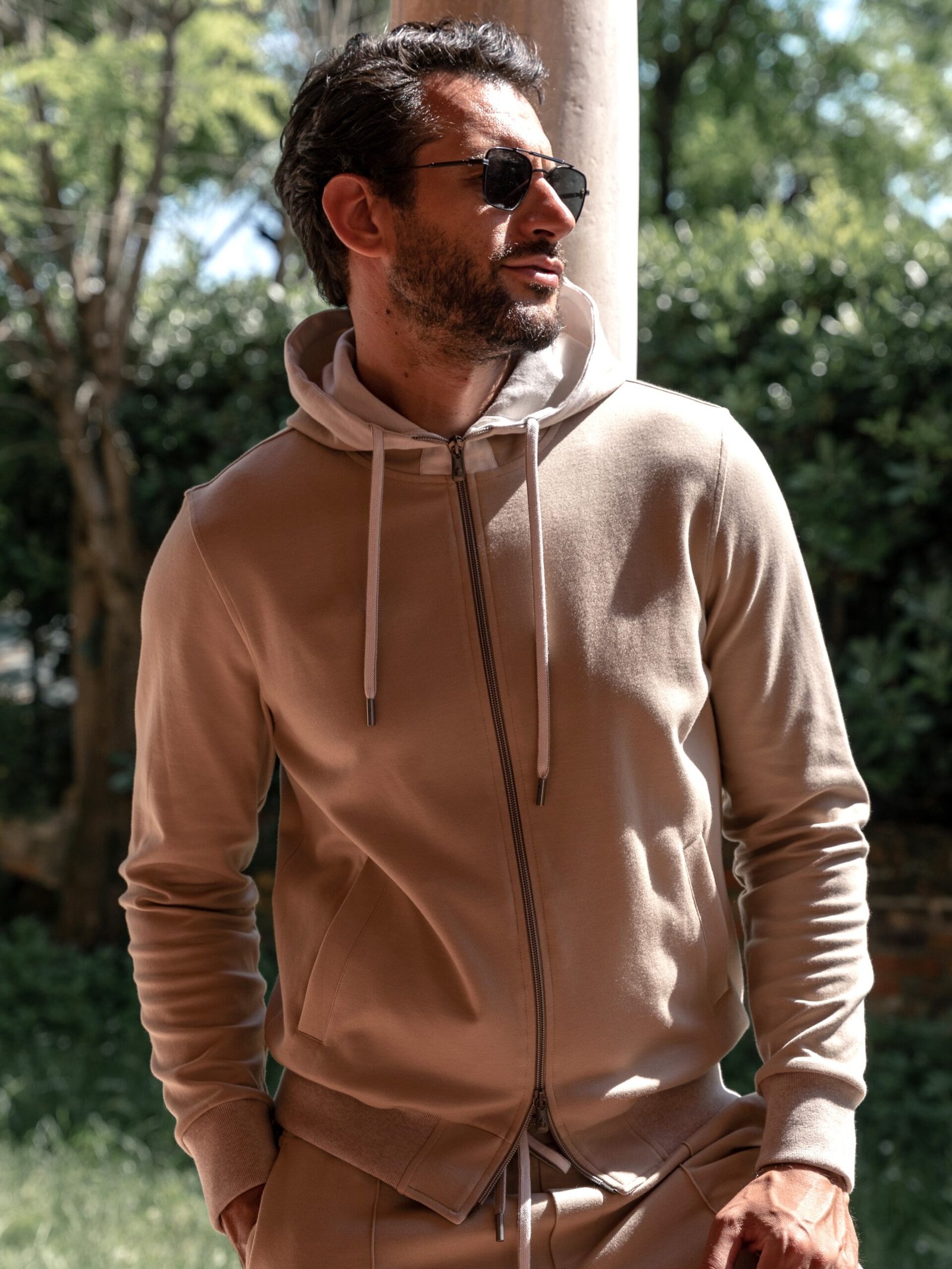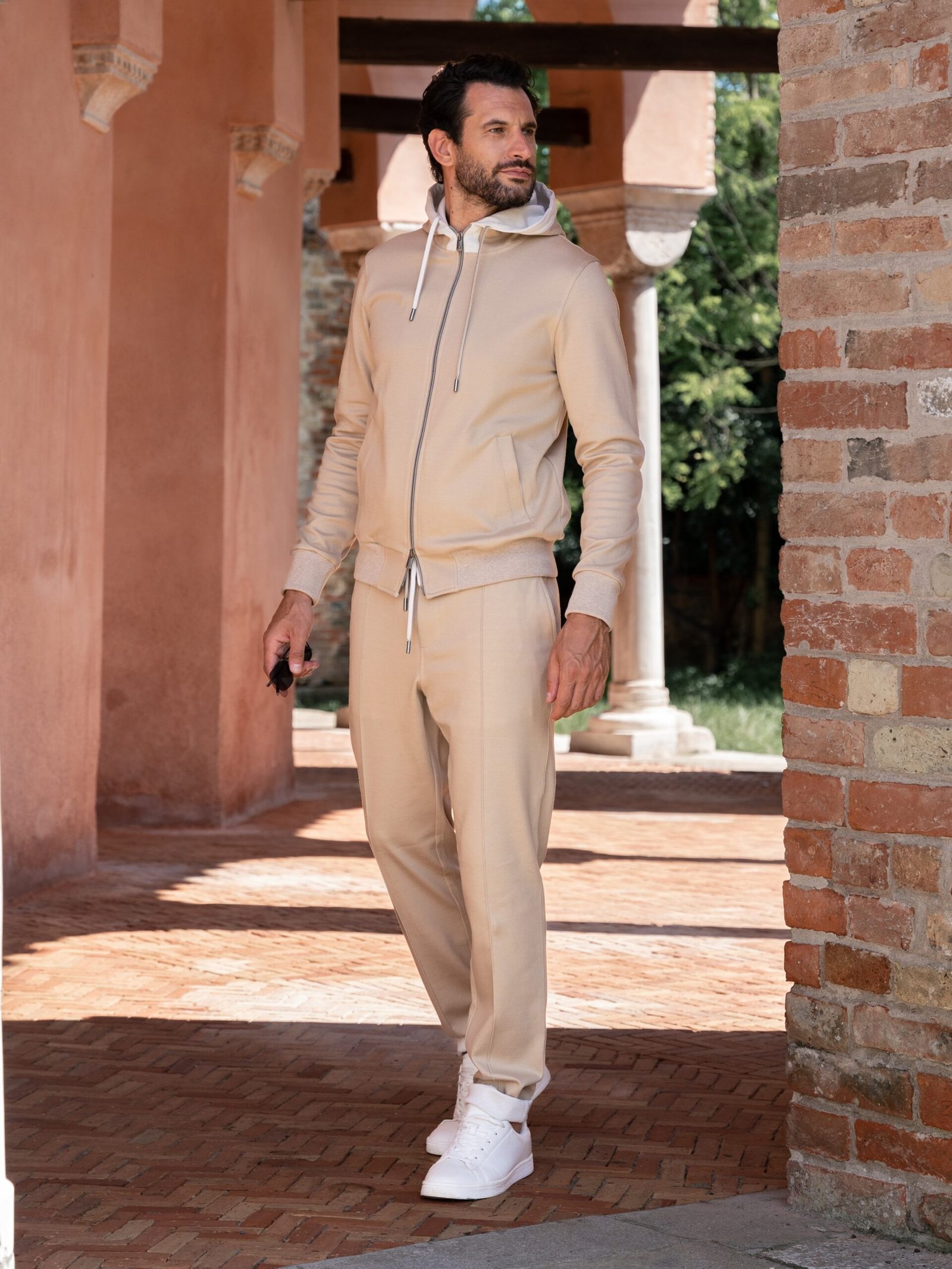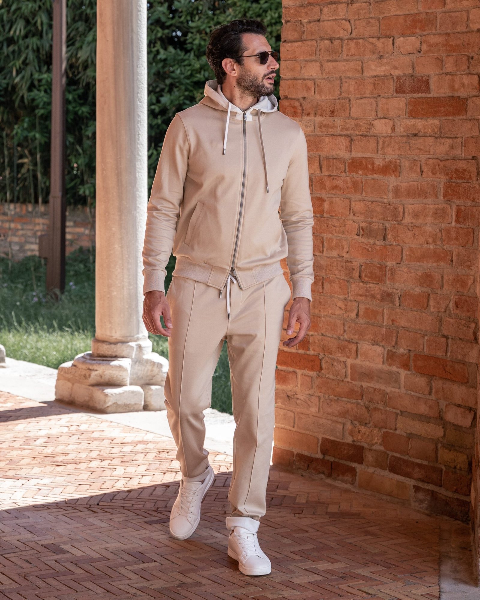 Leisure suit composed of a full-zip hoody and matching sweatpants, made from soft yarn-dyed double-colored Supima cotton jersey, known for its exceptional smoothness, durability, and natural comfort. The hoody features a double-logo puller zip, a hood with contrast band and adjustable drawstring with logoed stoppers, fine ribbed cotton-knit trims at the waistband and cuffs, and two side pockets. The sweatpants include center front leg stitching, two hip pockets, one back pocket with logoed buttons, and an elastic waistband with adjustable drawstring and logo-detailed clips.