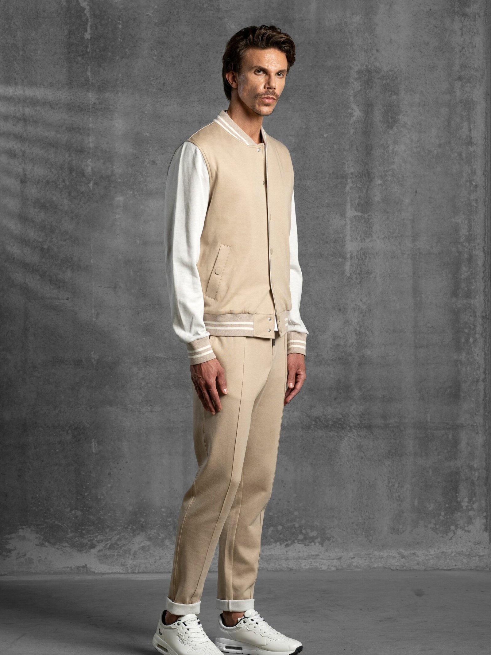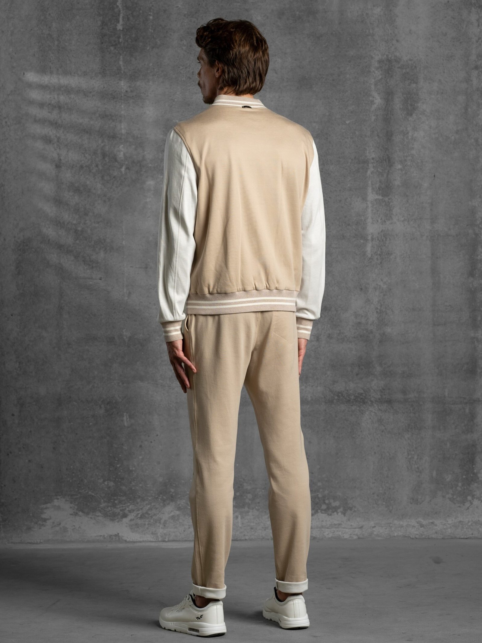 Leisure suit composed of a varsity-style bomber and matching sweatpants, made from soft, yarn-dyed double-colored Supima cotton jersey, known for its exceptional smoothness, durability, and natural comfort. The bomber features contrast-colored sleeves, matching snap buttons on the front, striped fine ribbed cotton-knit trims at the waistband and cuffs, and two side pockets with matching snap closures. The sweatpants include center front leg stitching, two hip pockets, one back pocket with logoed buttons, and an elastic waistband with adjustable drawstring and logo-detailed clips. A sporty yet refined set, perfect for relaxed elegance with a distinctive edge.