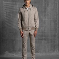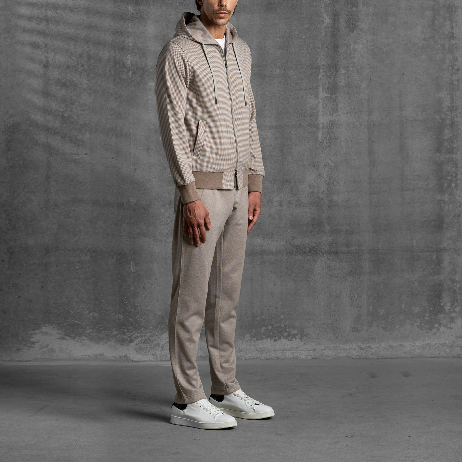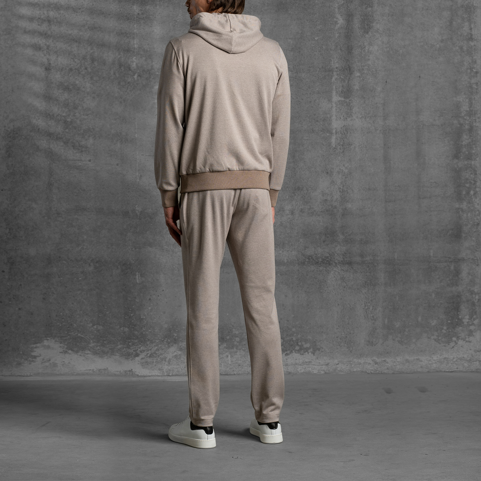 Refined and comfortable tracksuit crafted from soft Supima cotton jersey, yarn-dyed with a sophisticated two-tone Pied-de-Poule design. The hooded sweatshirt features a drawstring with a branded stopper for optimal adjustment, while the double-slider zip with logo ensures practicality and attention to detail. The ribbed cotton waistband and cuffs add a touch of elegance, completing the design alongside the two side pockets. The pants, made from the same soft Supima long-fiber cotton jersey, showcase a mélange effect yet remain solid-colored for a balanced and sophisticated contrast. Functional and comfortable, they feature two side pockets and a back pocket with branded buttons. The adjustable waistband with elastic and a drawstring with branded clips ensures a perfect and comfortable fit.