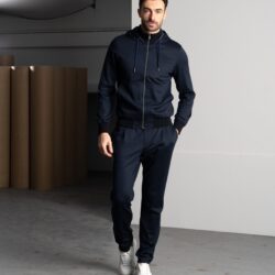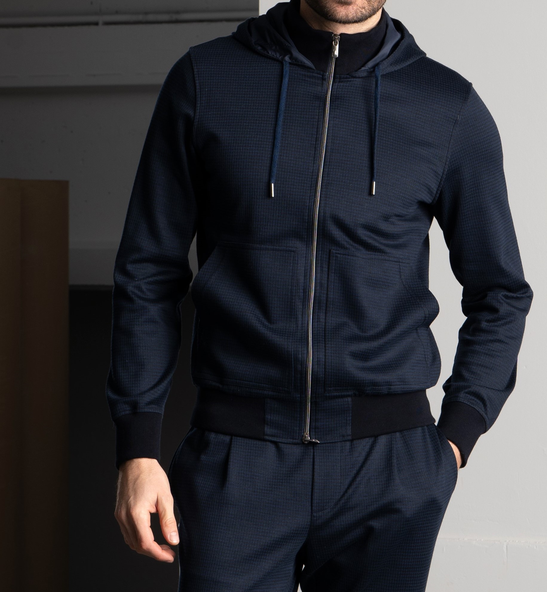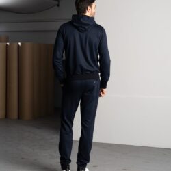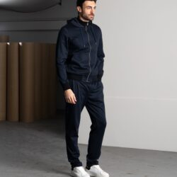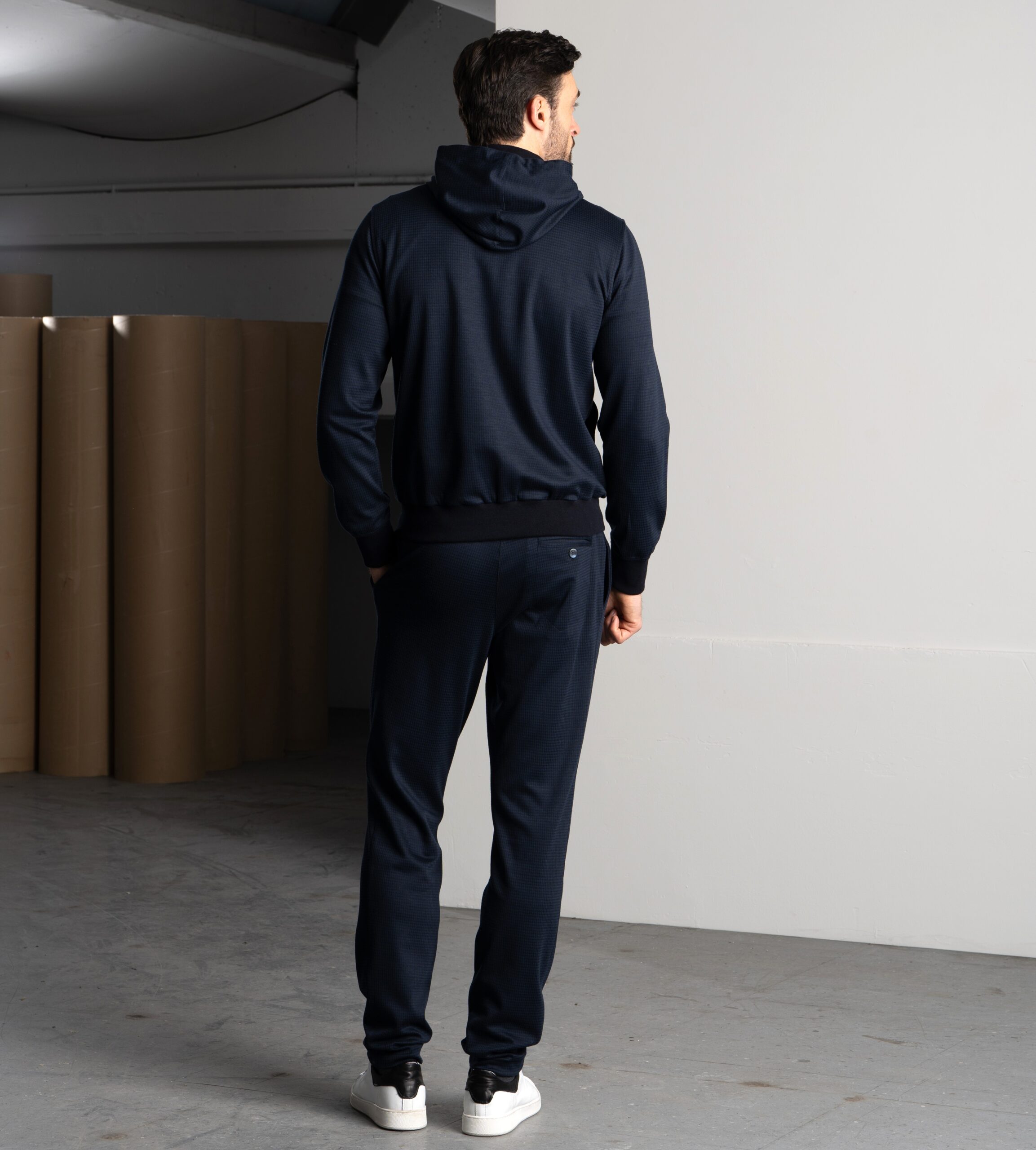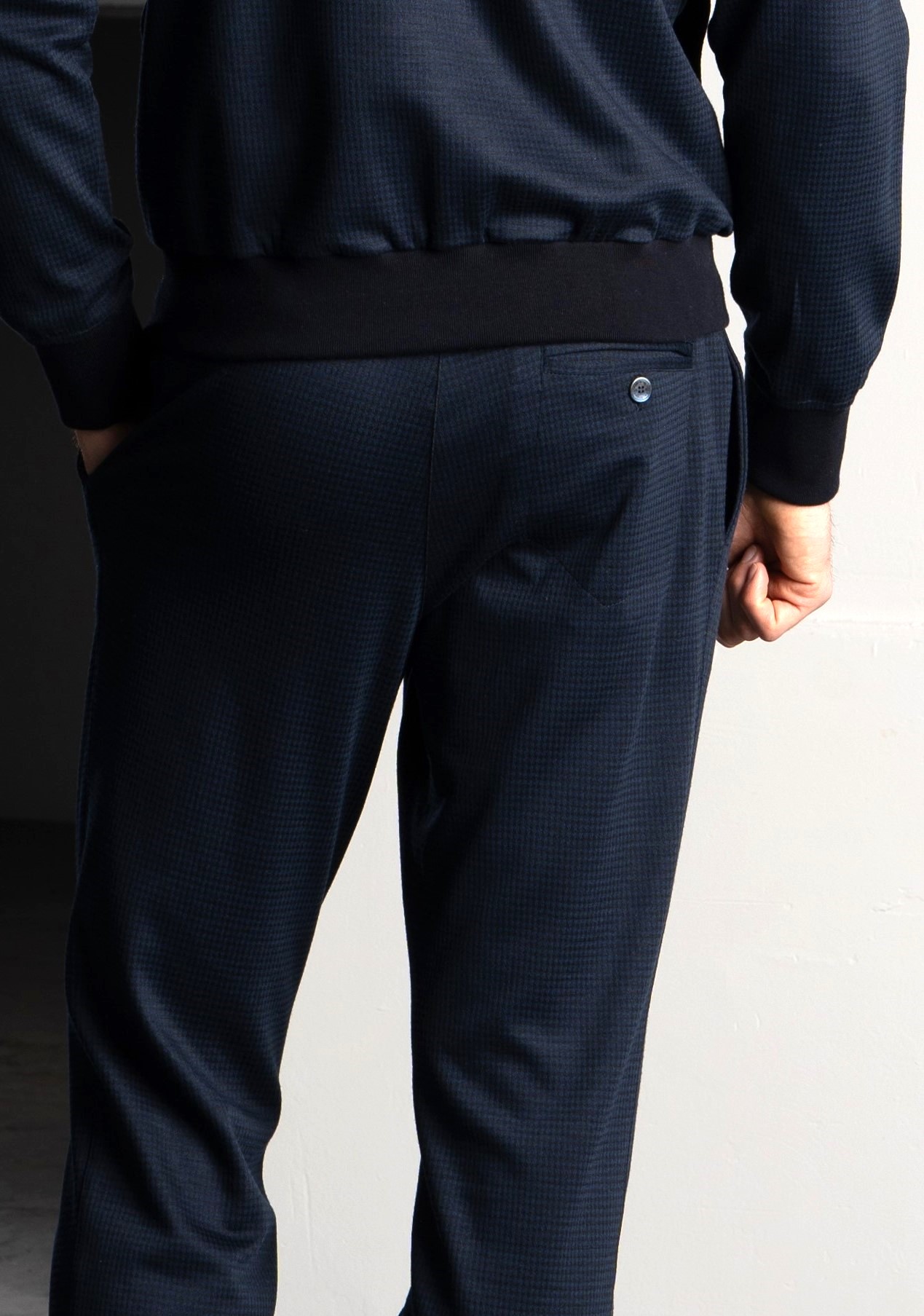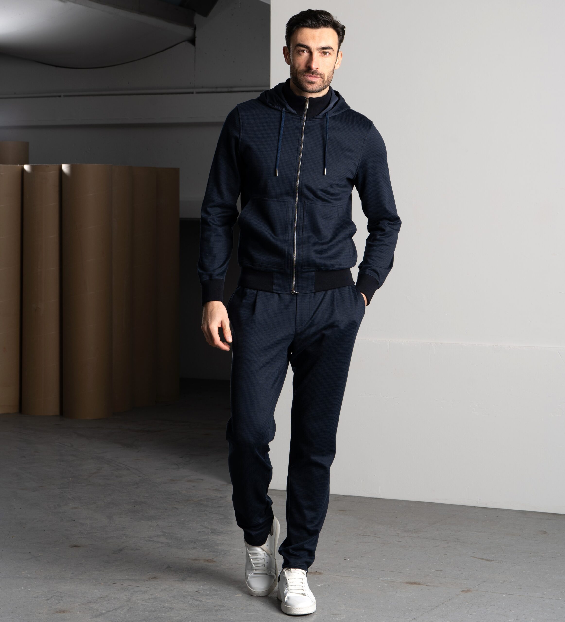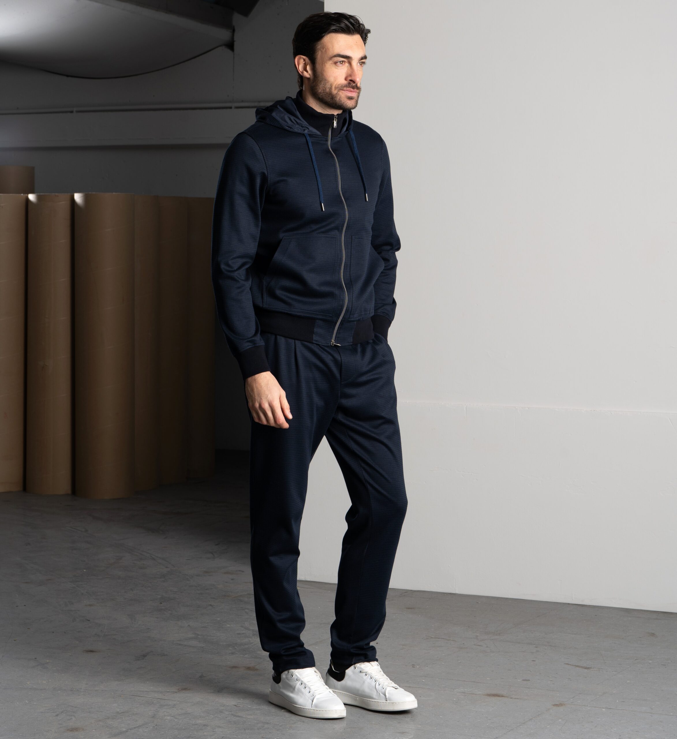 Comfortable and elegant tracksuit set crafted from a refined Woolcot fabric with a Pied de Poule pattern, appreciated for its softness and for the balance between warm wool and breathable cotton. The full zip sweatshirt features cotton rib knit details on the hem, cuffs and collar, a front closure with branded double pullers and a hood drawstring enriched with a customized stopper. It includes two side pockets, an internal pocket and a metal logo plaque applied on the back of the collar. The pure cotton jersey lining ensures effective absorption of body moisture, providing comfort during wear. The pants, defined by two front pleats, feature two side pockets and a back pocket with branded buttons. The elastic waistband, combined with a drawstring with branded double stopper, allows for a personalized and comfortable fit. A thoughtfully crafted set, ideal for combining style and well being during leisure time.