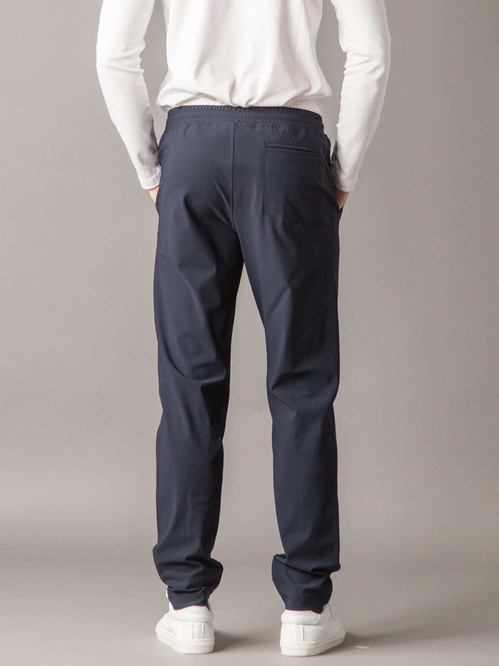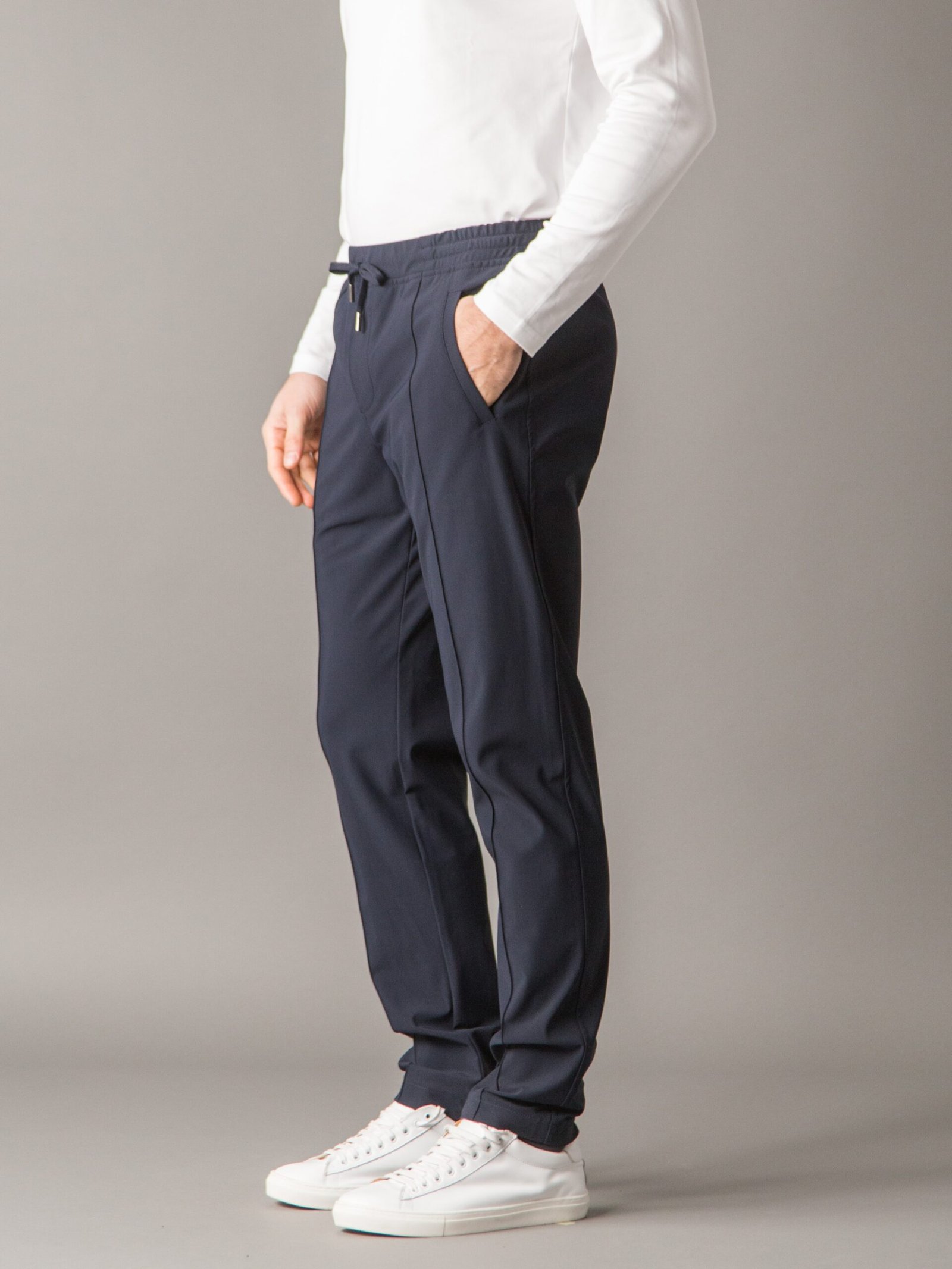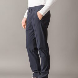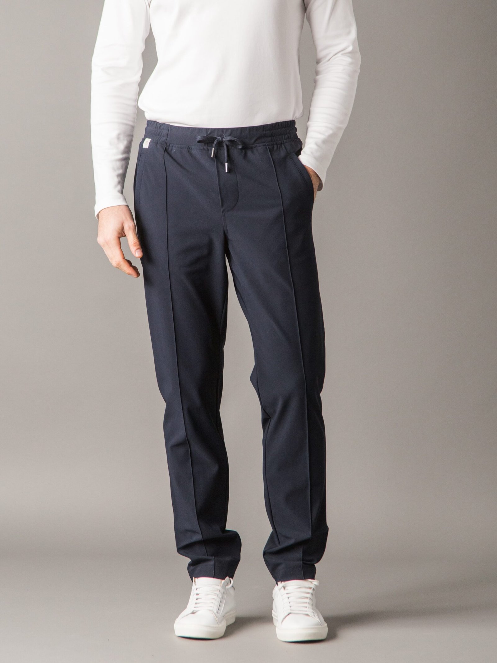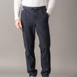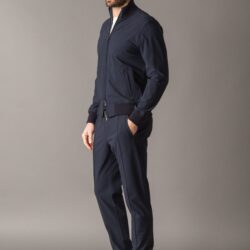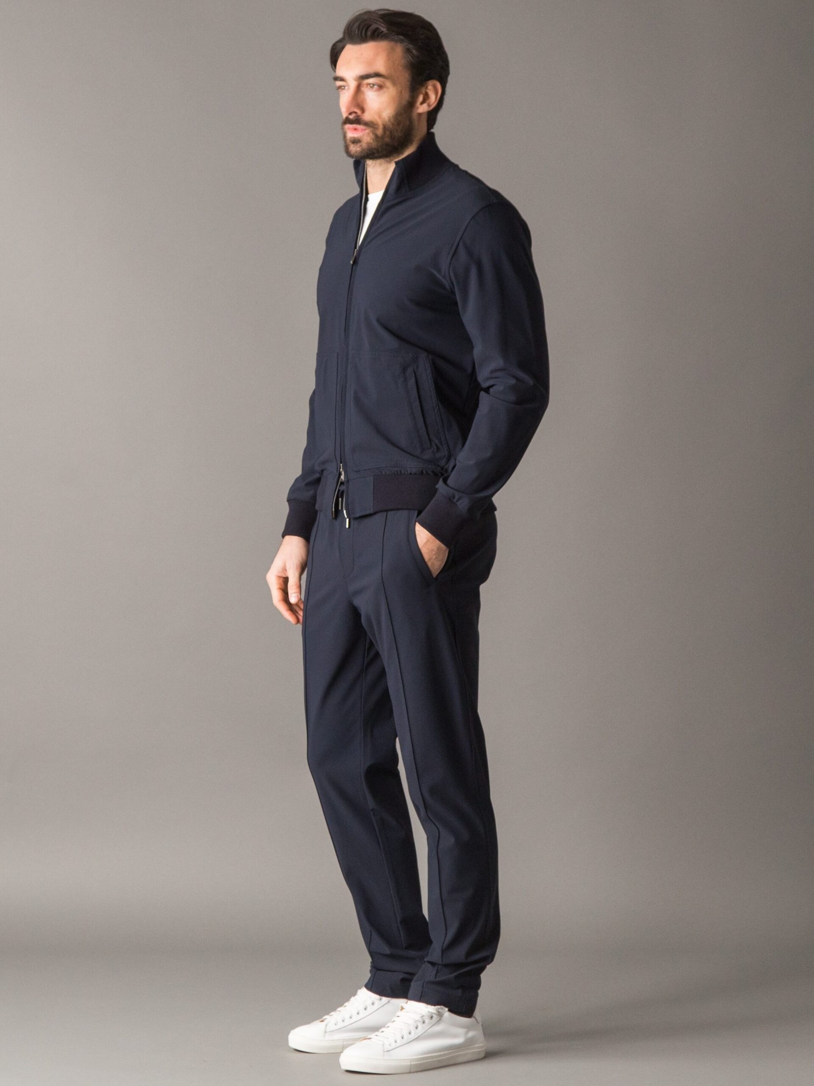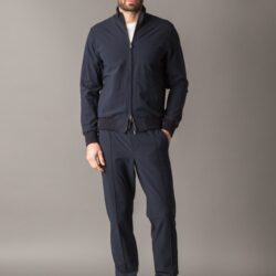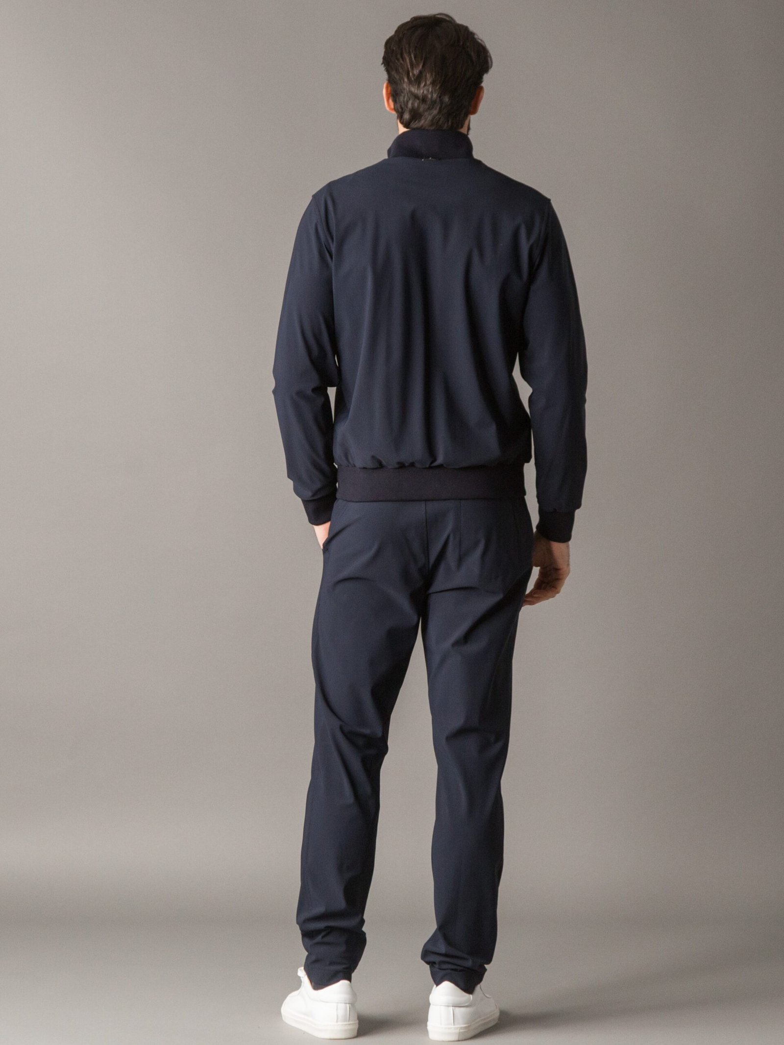 Leisure-tech set crafted from stretch wrinkle-free microfiber polyester-lightweight, breathable, and ideal for a modern, active lifestyle. The full-zip sweater features cotton ribbed cuffs, collar, and bottom hem, a front zip with double logoed pullers, two side pockets, an inner chest pocket, and a metal logo plate on the back collar. The interior is lined with superlight stretch polyester for optimal moisture absorption. The matching casual-tech easy pants include center leg stitching, two side pockets, one back pocket, and an elastic waistband with adjustable drawstring and logoed stoppers. A technical and versatile look, perfect for travel or stylish downtime.