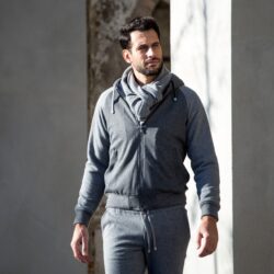 Full-zip hooded sweatshirt padded with fine silk, crafted from a warm and luxurious brushed cotton and cashmere fabric featuring a Chevron pattern on the body and solid-color sleeves. The interior lining in brushed cotton jersey ensures maximum comfort and effective moisture control. Ribbed knit trims in wool and cashmere provide added warmth. The padding is made from a special pure silk wadding, offering exceptional warmth and remarkable lightness.