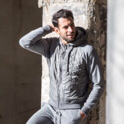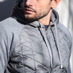 Padded full-zip hoodie in fine silk, made of soft brushed cotton and melange cashmere fabric, with pure silk-padded quilted nylon on the front. The internal lining is in pure cotton jersey and features an internal pocket. The knitted wool and cashmere ribbing for the cuffs and hem add comfort. The hood is equipped with a drawstring and the closure is a full zip with a logo. It has two front zip pockets with logo pulls. A luxurious piece perfect for leisure.