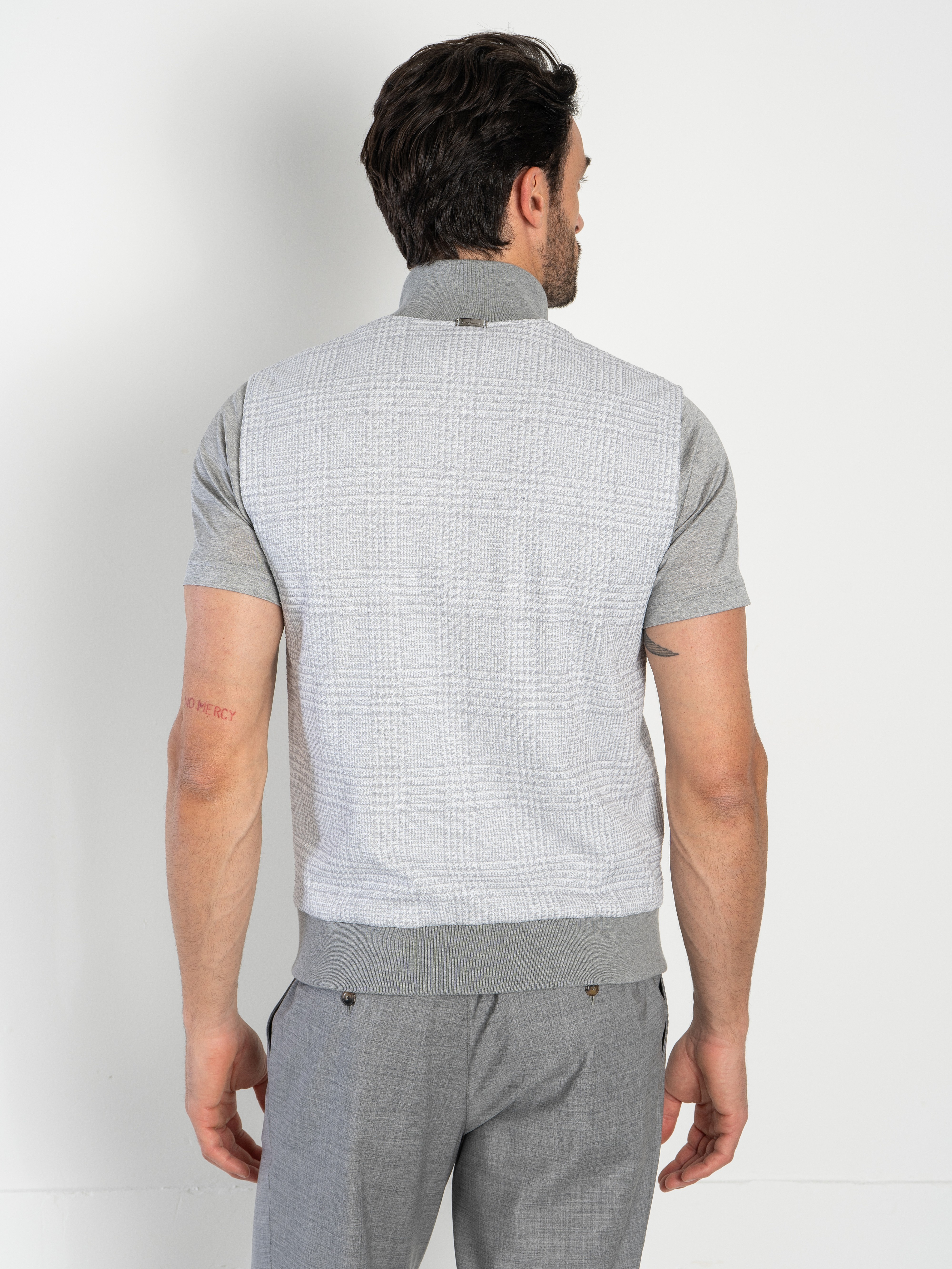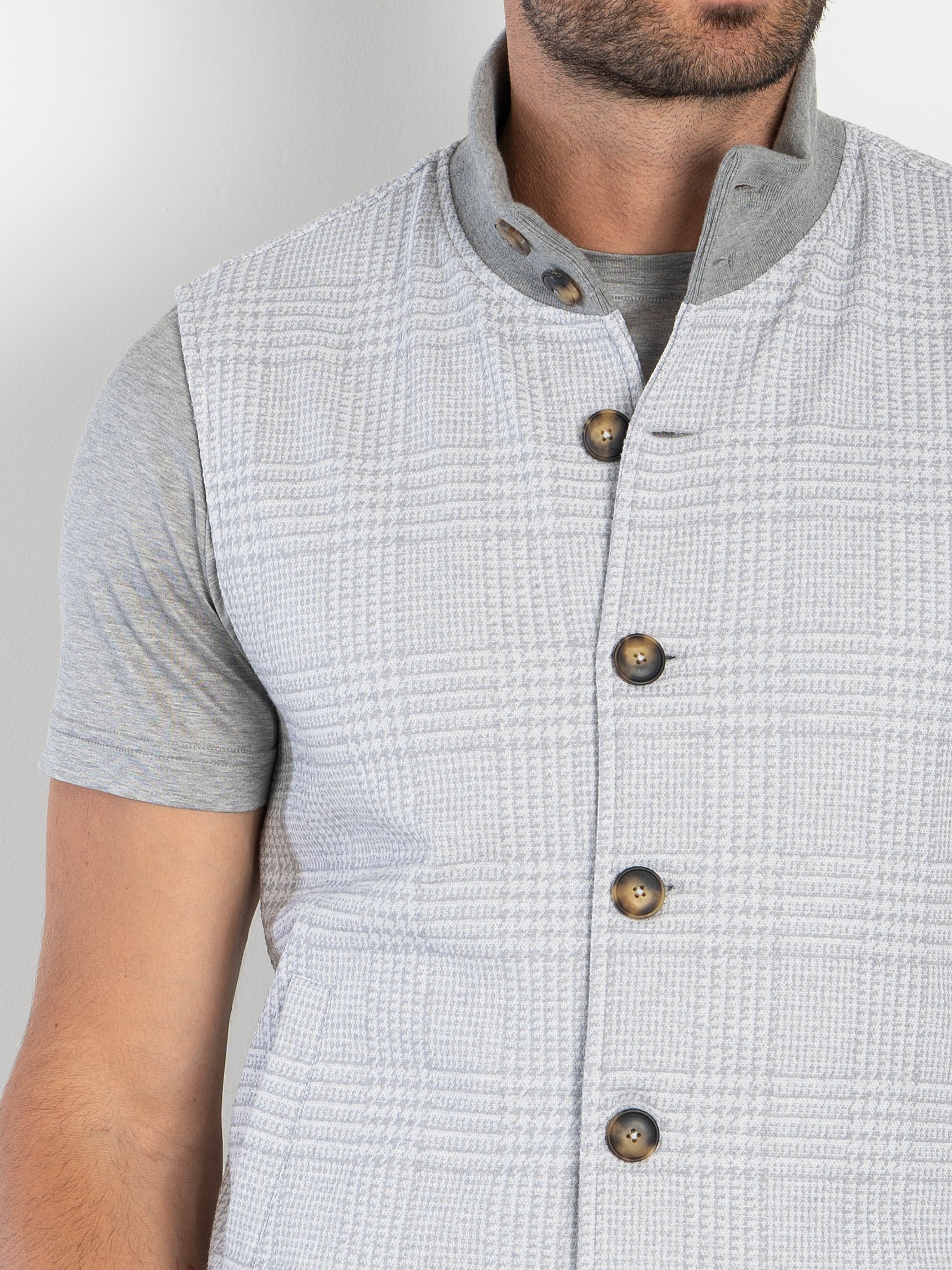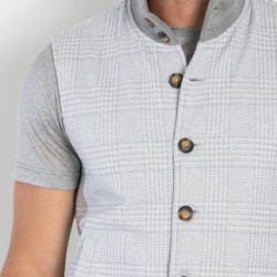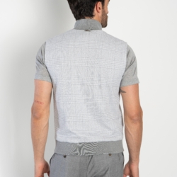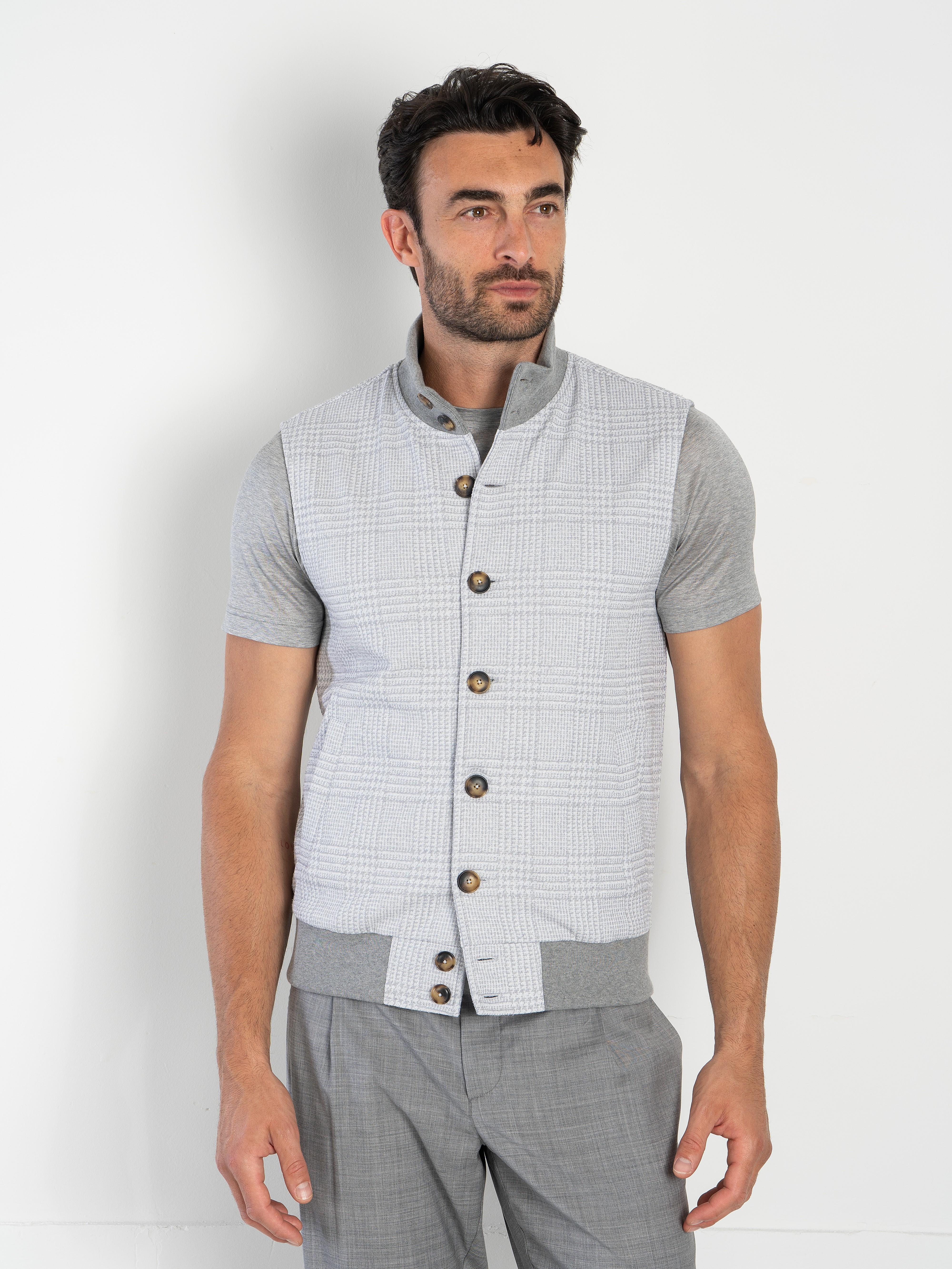Gilet crafted in a refined macro Glen‑check jacquard jersey, a fabric that blends structure and elasticity with a sophisticated textured effect. The jacquard construction enhances depth and definition, while the jersey base ensures comfort, lightness and a naturally flexible fit. The design features logoed buttons on the front, a super‑light pure cotton jersey lining, two front pockets, and a ribbed cotton collar and hem.